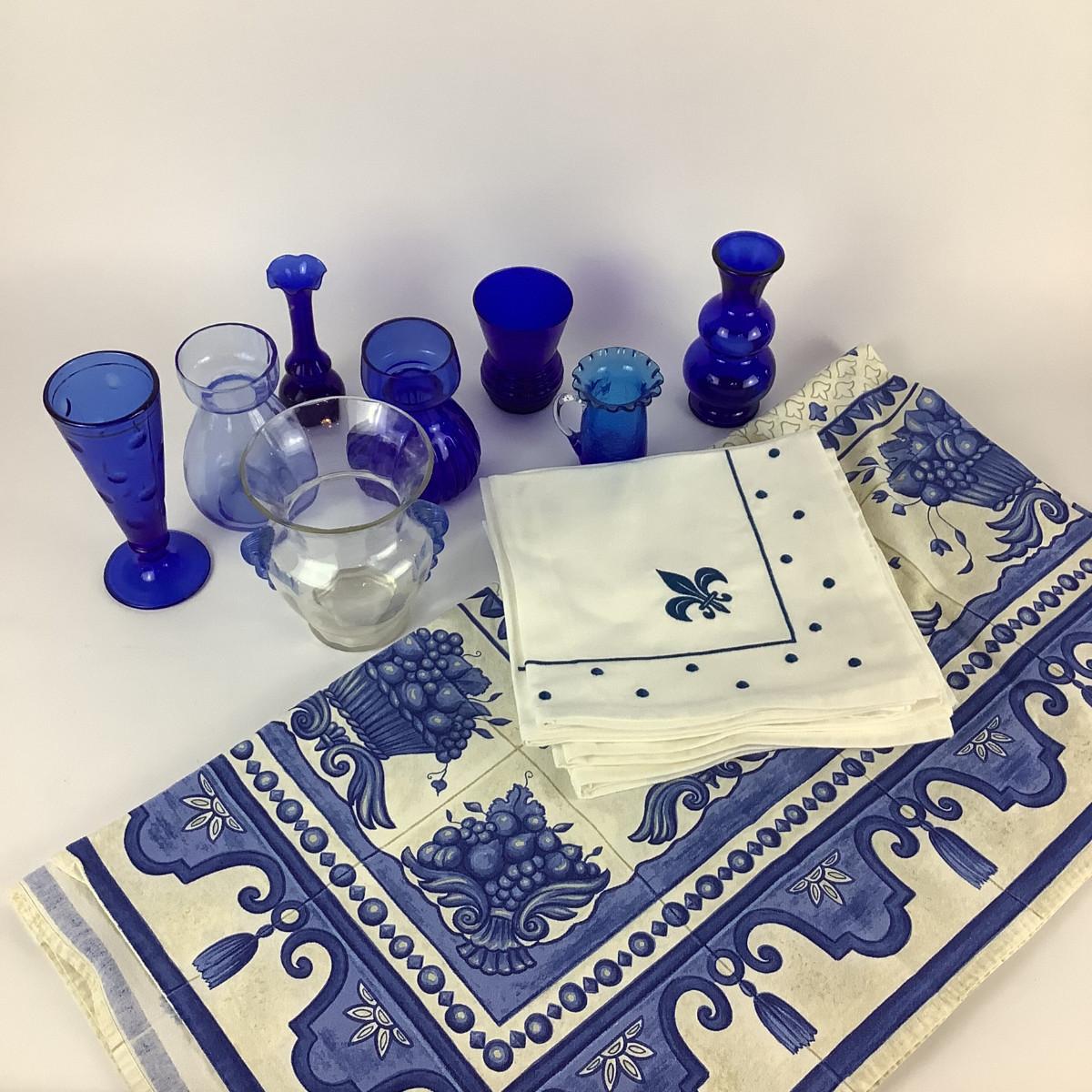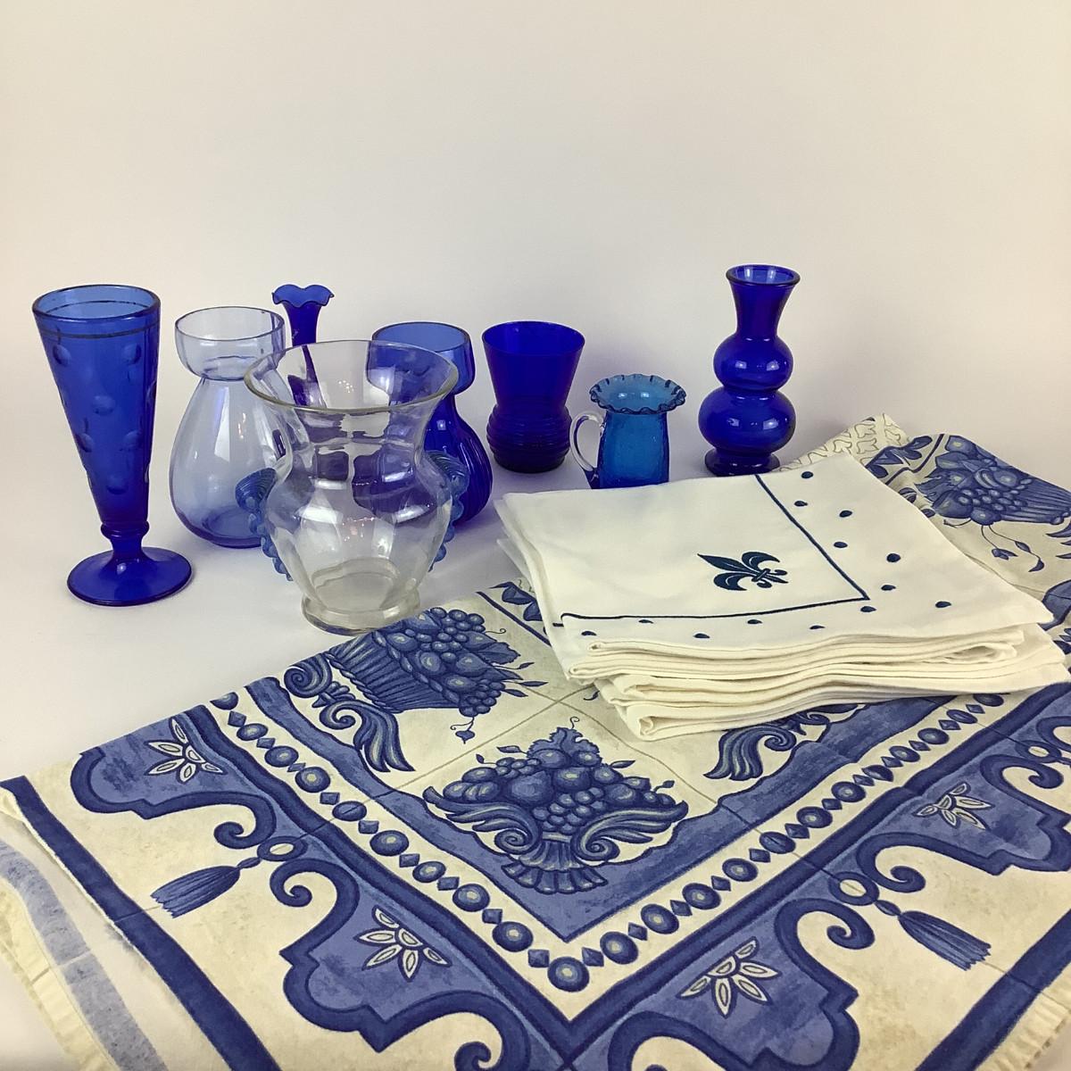 270 Gerard Panton Paris Table Cloth, French Table Linens & Blue Glass Vases Lot