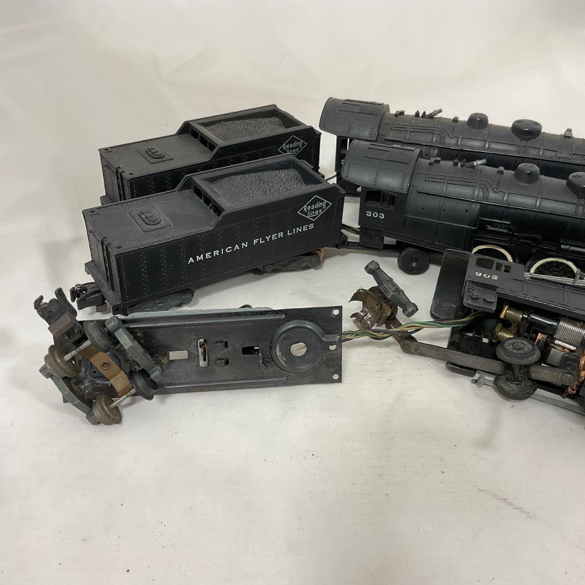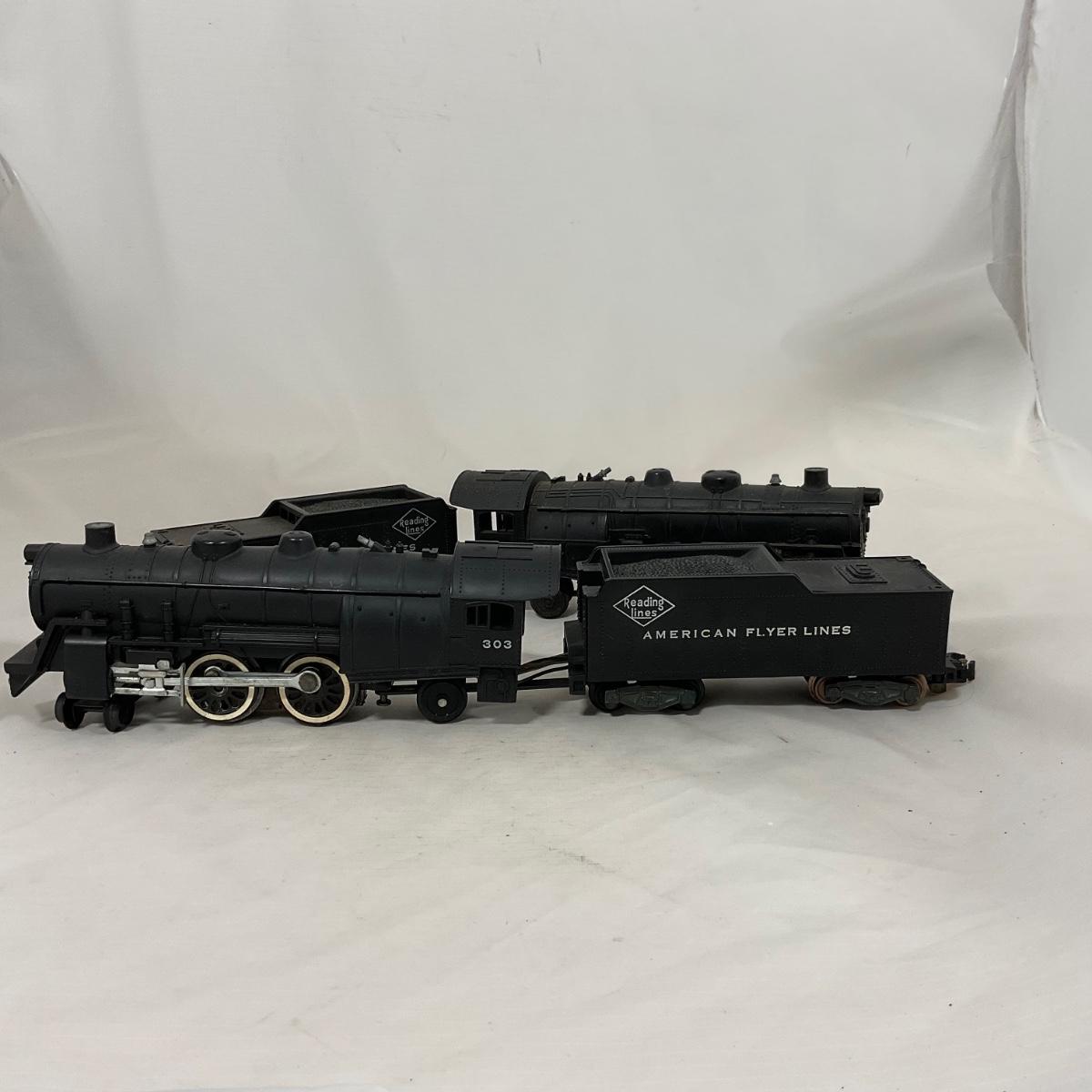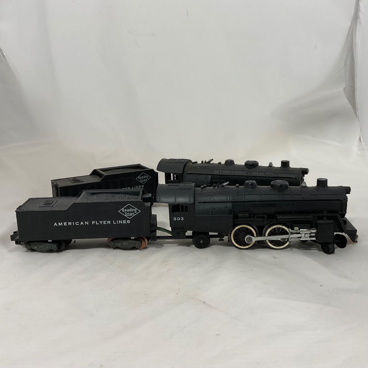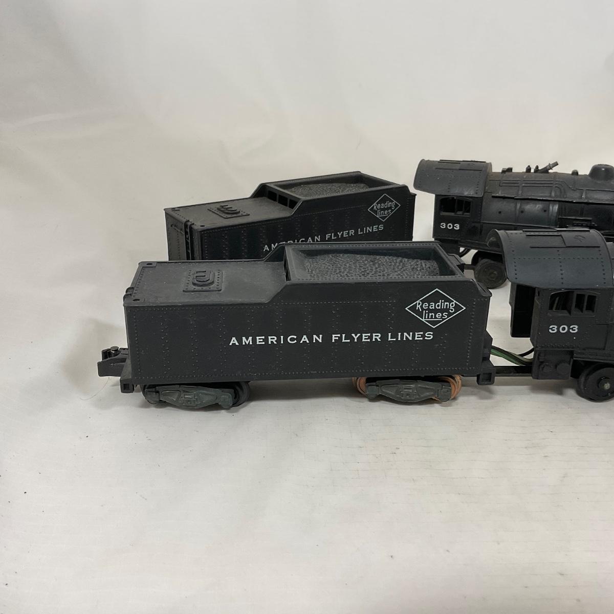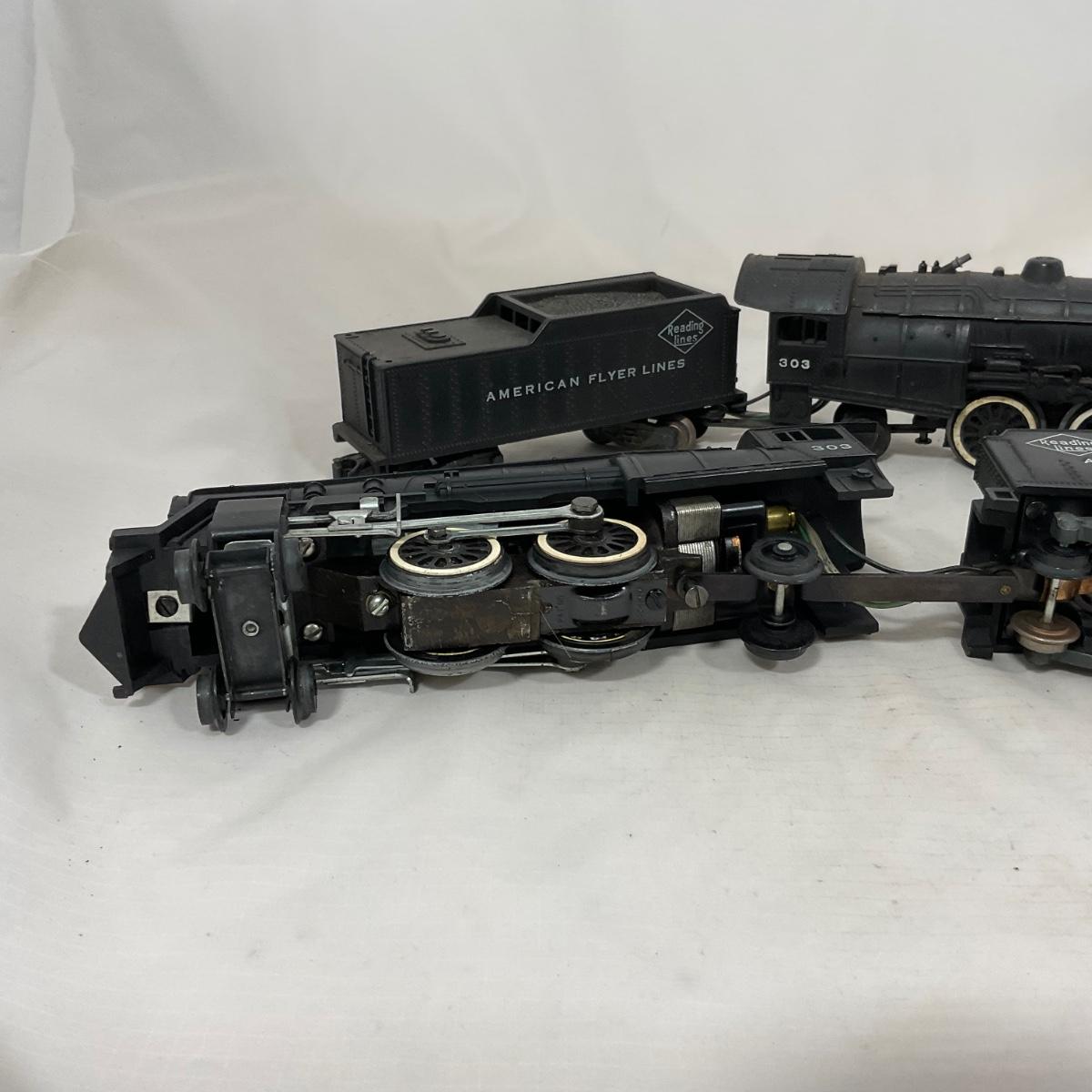 Vintage American Flyer Engine #303 with Tender. Please see photos for details and condition. ::: Shipping is available on this lot. If you require shipping you must let us know at the close of the auction. We will coordinate with you after the item has been won. Shipping fees will include insurance up to or exceeding the value of all items being mailed. If you have any questions regarding this lot please contact the auctioneer either via this website, by direct email or by phone. PICK UP TIMES and other important information can be found in the TERMS and DESCRIPTION of the auction. Please take a look for pertinent information. Thanks!