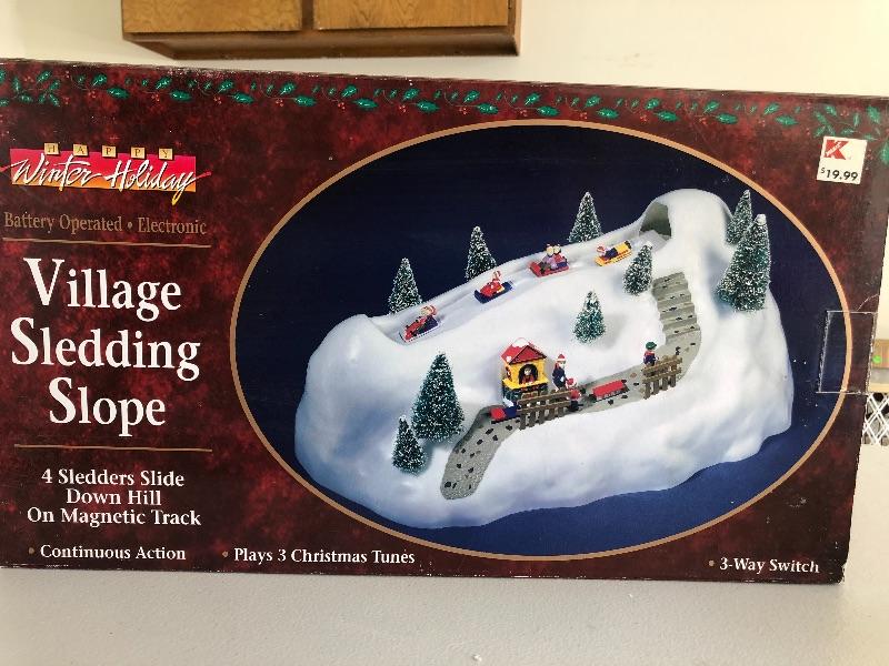 Village sliding slope plays music unsure of functioning appears to be in working condition This is an ONSITE Auction all items will need to be picked up on location. Please see auction description for pick up procedures. Shipping is available on smaller items.