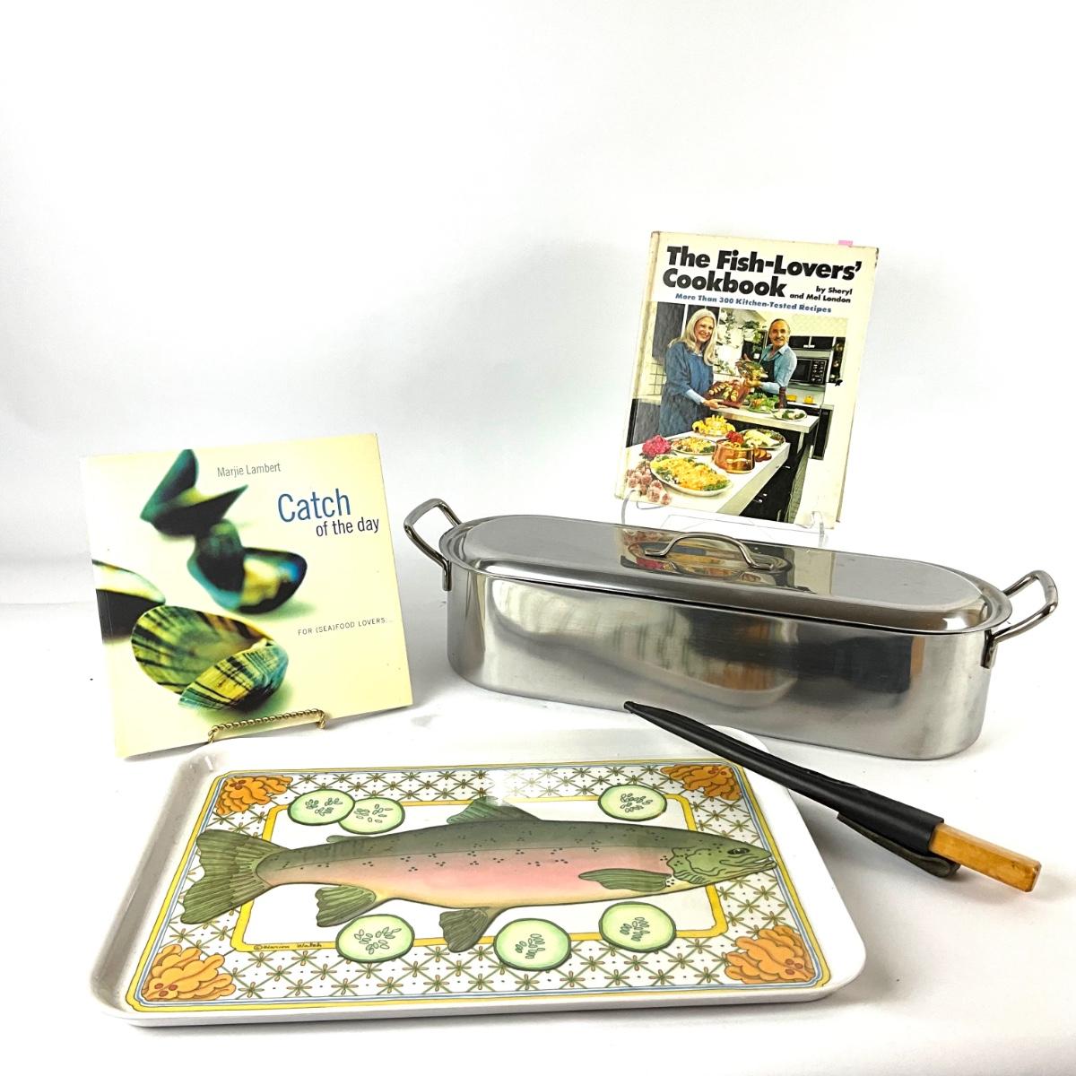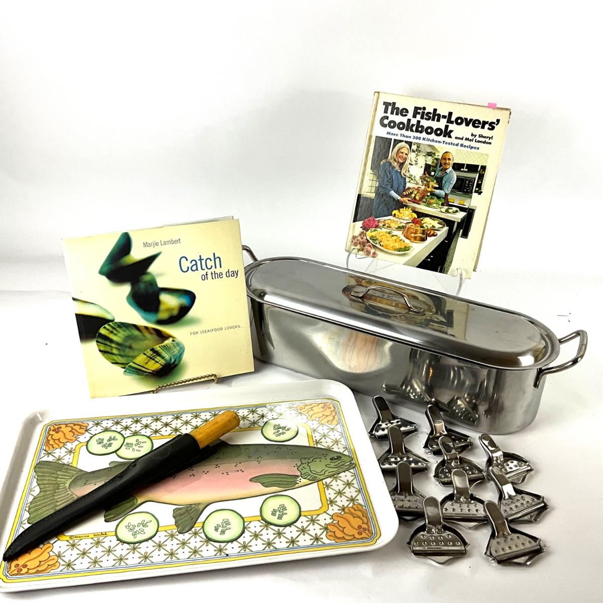 271 Large Inox Stainless Fish Poacher Pan with Tray, Cookbooks, Svenska Fish Knife, Lemon Squeezers