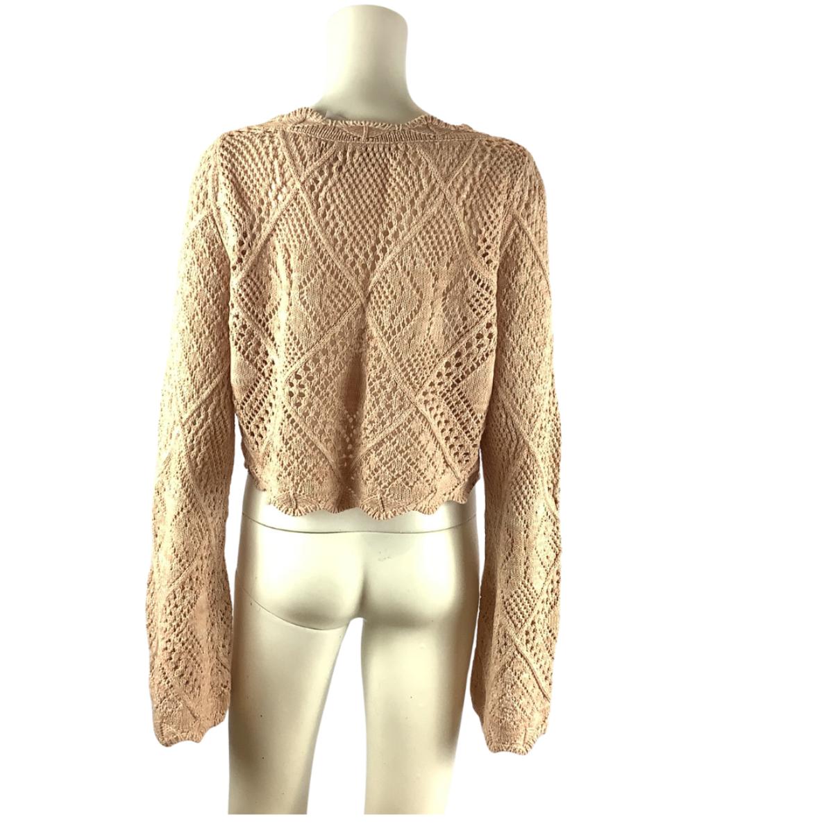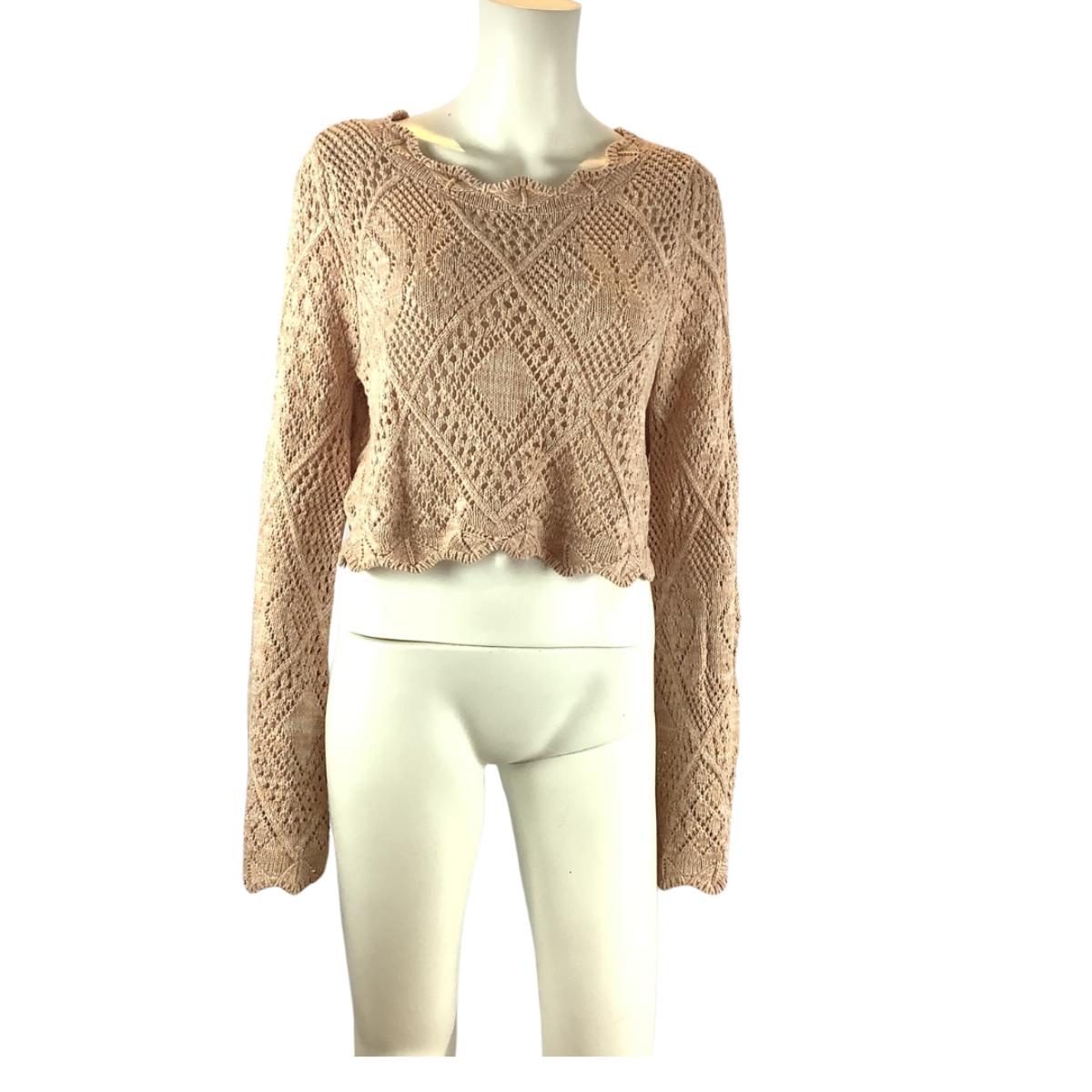 RONNY KOBO Beige Crochet Knit Sweater in a neutral beige color. Featuring a delicate diamond crochet pattern, scalloped edges, and a cropped fit. This long-sleeve top is perfect for layering or wearing as a standalone piece. The unique crochet detailing and lightweight design add a chic and stylish touch to any outfit.