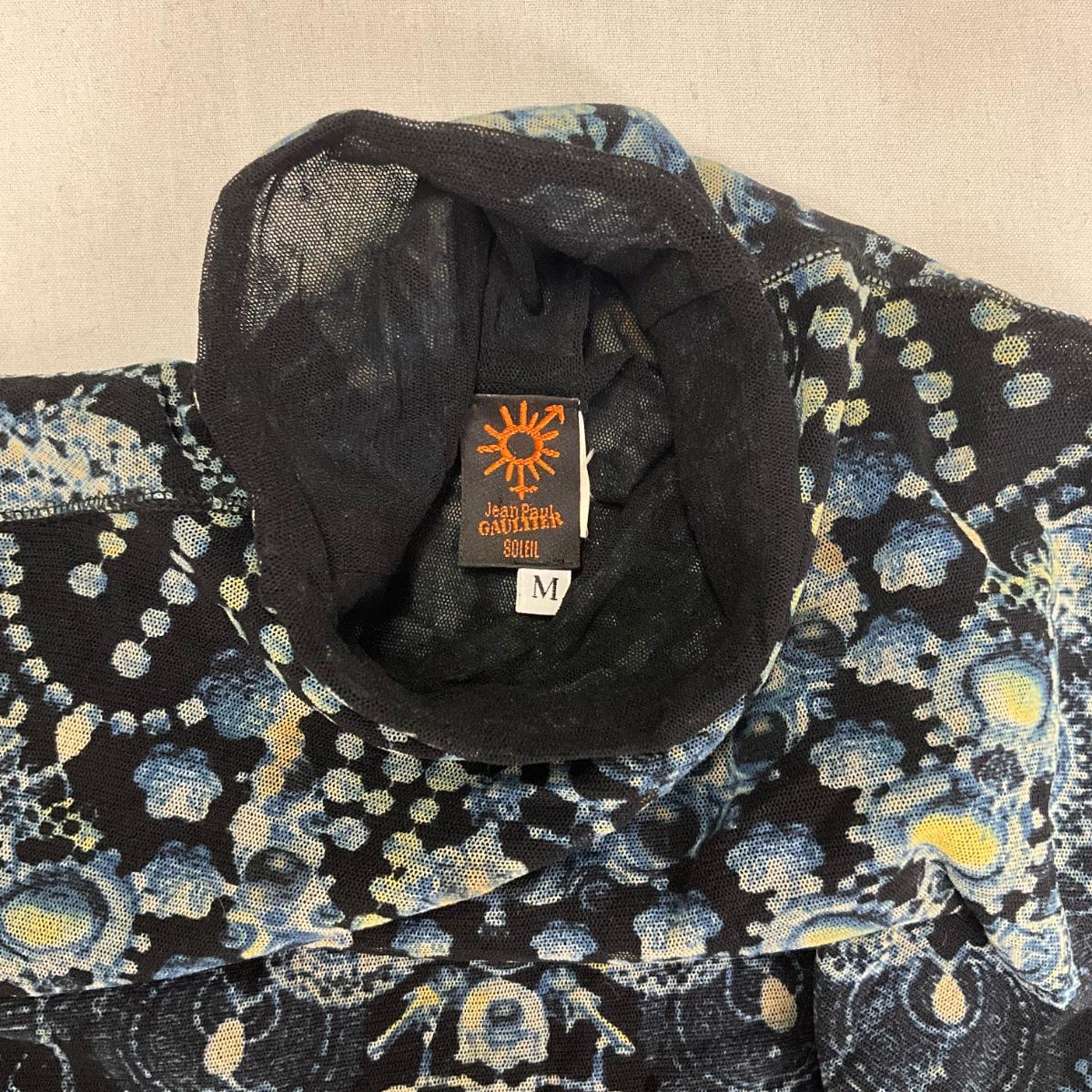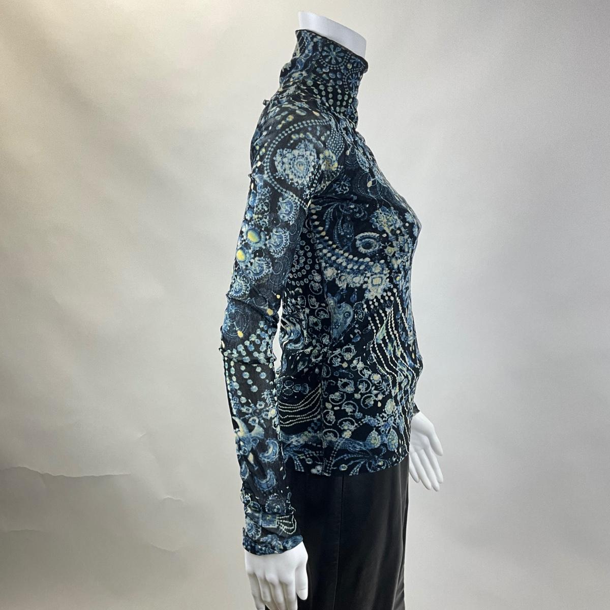 Preowned Jean Paul Gaultier Blue multi pattern, sheer top featuring round neckline, long sleeves, ruching at sides, round hem line, and black mesh lining