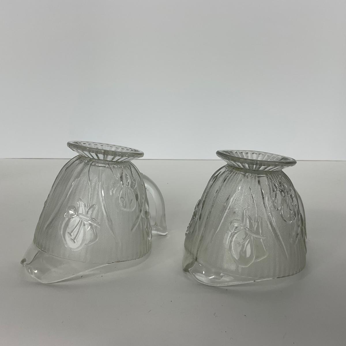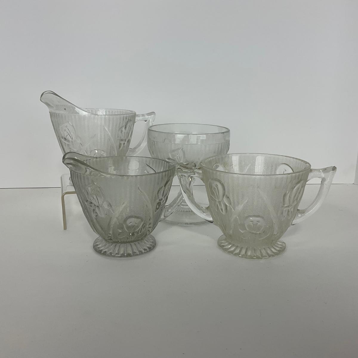 Four pieces of Iris and Herringbone Jeanette Glass Co. (1928-1932) including two creamers, one sugar dish, and one sherbet. These pieces do have damage and chips. Please see photos for details and condition. ::: Shipping is available on this lot. If you require shipping you must let us know at the close of the auction. We will coordinate with you after the item has been won. Shipping fees will include insurance up to or exceeding the value of all items being mailed. If you have any questions regarding this lot please contact the auctioneer either via this website, by direct email or by phone. PICK UP TIMES and other important information can be found in the TERMS and DESCRIPTION of the auction. Please take a look for pertinent information. Thanks!