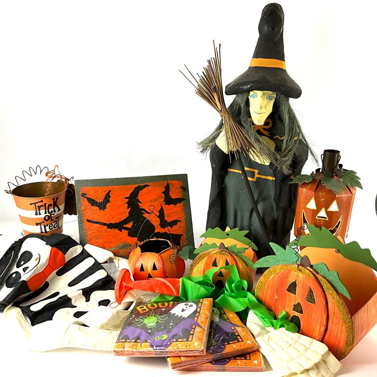 Mr. Bones Flag sock, several pumpkin buckets and plant holders, napkins, tin pumpkins, slate painted witch wall hanging