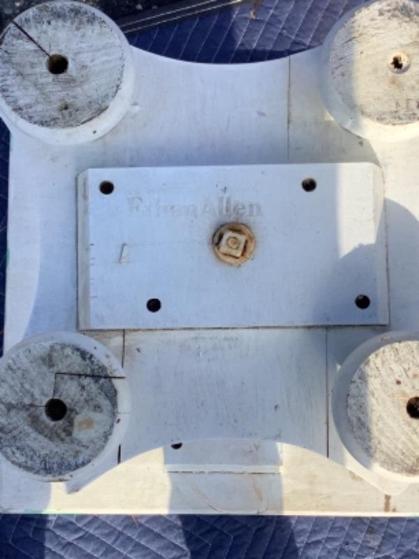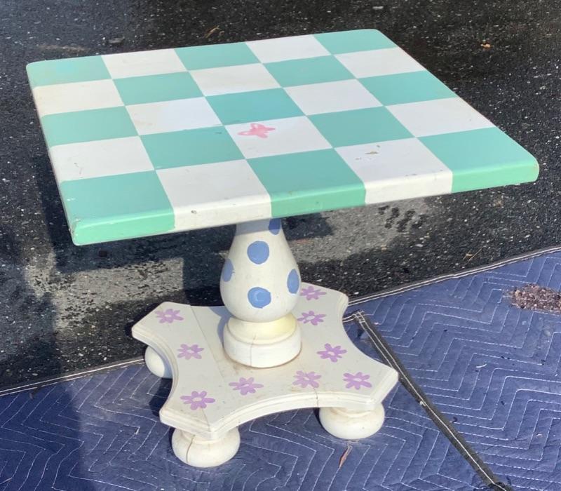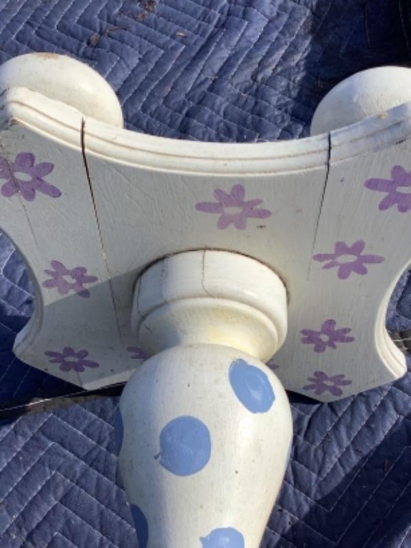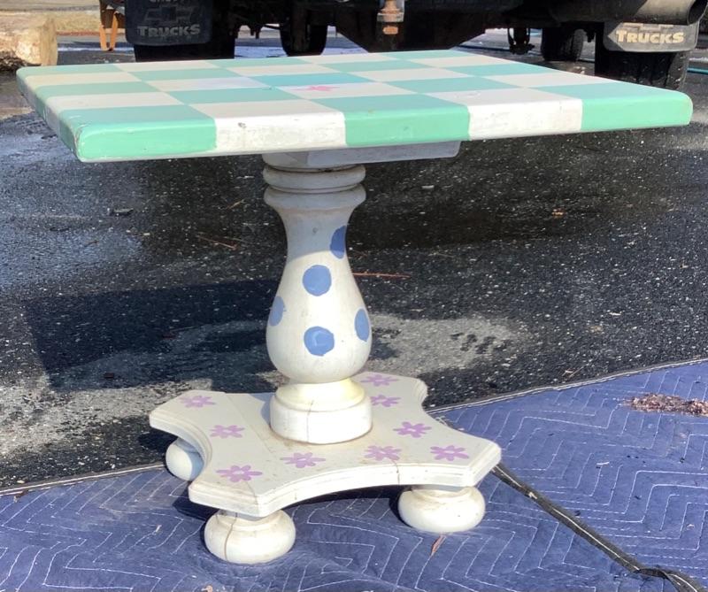 Painted Ethan Allen pedestal end table has some damage (see photos), measures 17” high and 19-1/2” x 19-1/2” top.