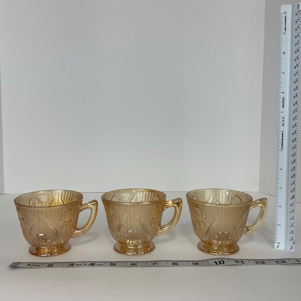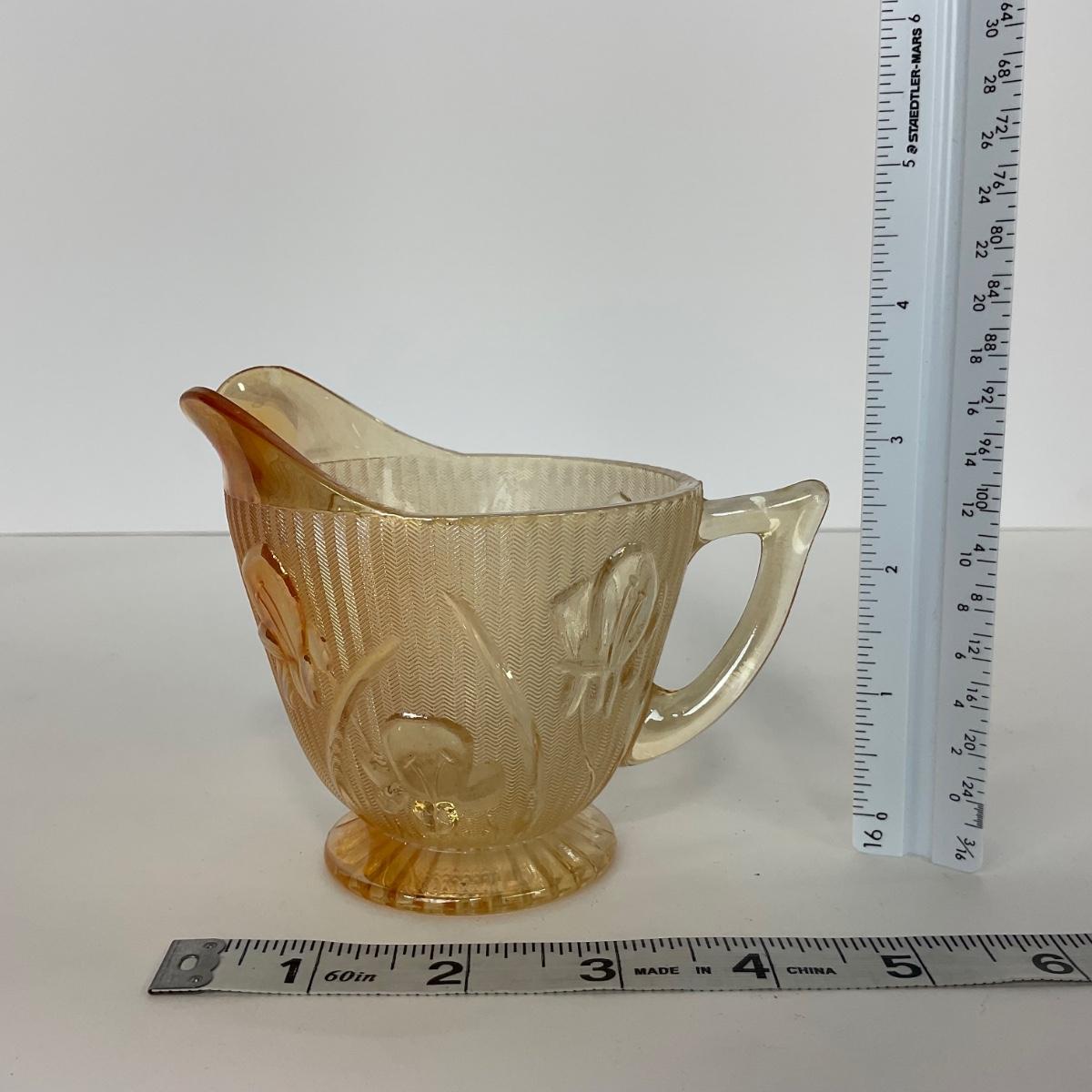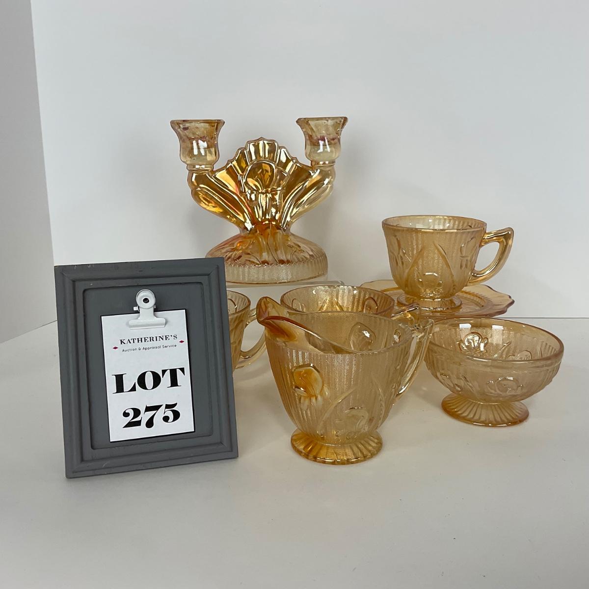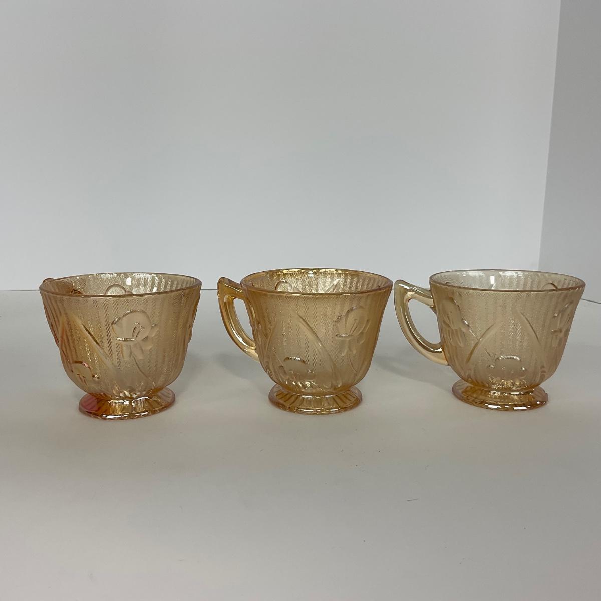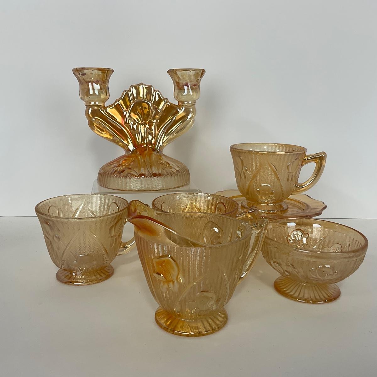 Seven pieces of peach Iris and Herringbone Jeanette Glass Co. (1928-1932) including one candlestick, one creamer, one sherbet, one small plate, and three glasses. Please see photos for details and condition. ::: Shipping is available on this lot. If you require shipping you must let us know at the close of the auction. We will coordinate with you after the item has been won. Shipping fees will include insurance up to or exceeding the value of all items being mailed. If you have any questions regarding this lot please contact the auctioneer either via this website, by direct email or by phone. PICK UP TIMES and other important information can be found in the TERMS and DESCRIPTION of the auction. Please take a look for pertinent information. Thanks!