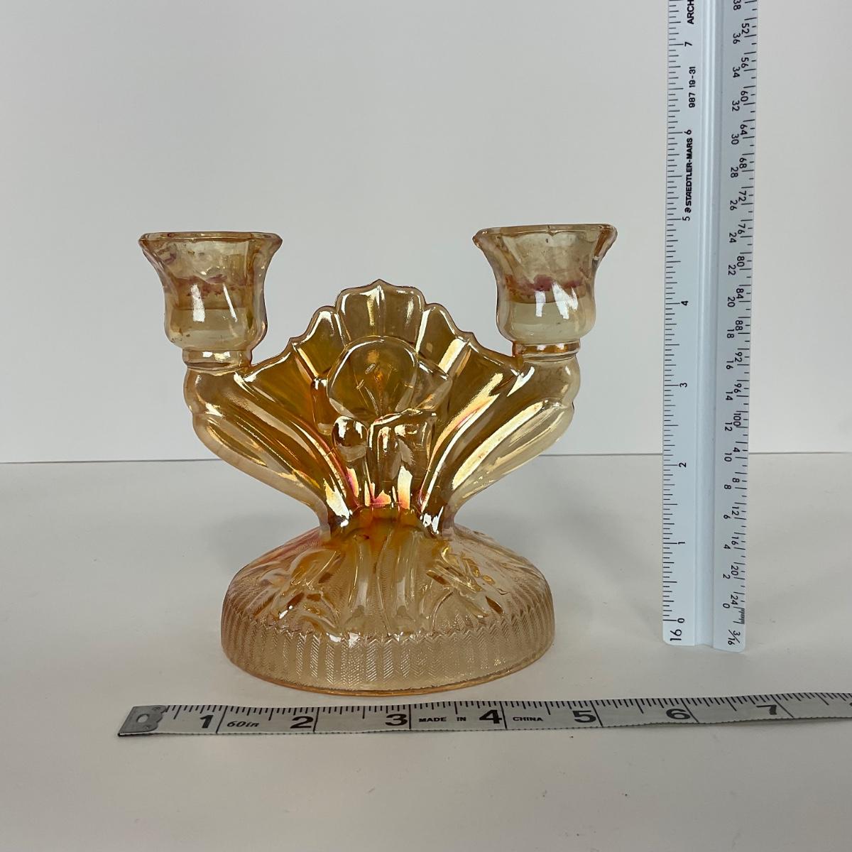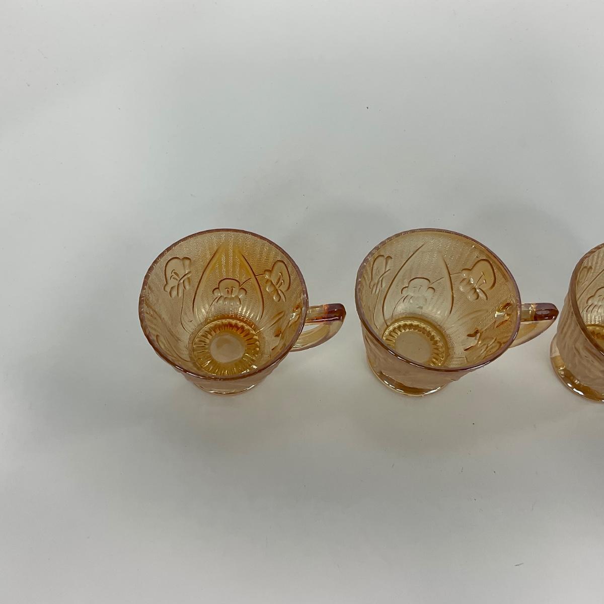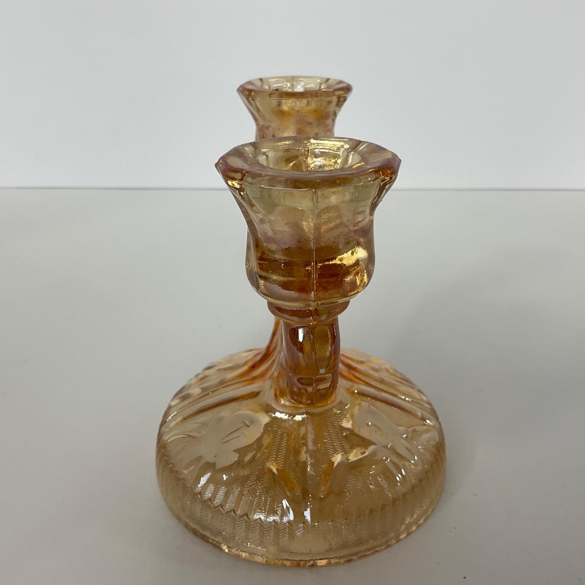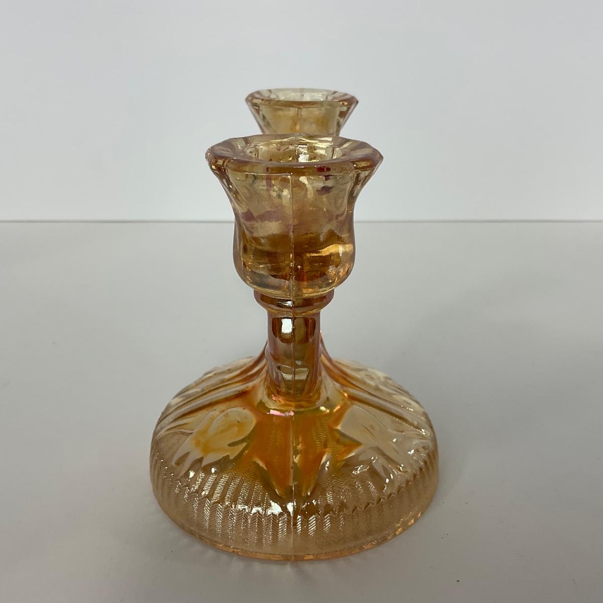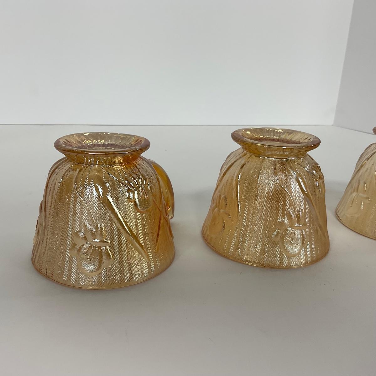 Seven pieces of peach Iris and Herringbone Jeanette Glass Co. (1928-1932) including one candlestick, one creamer, one sherbet, one small plate, and three glasses. Please see photos for details and condition. ::: Shipping is available on this lot. If you require shipping you must let us know at the close of the auction. We will coordinate with you after the item has been won. Shipping fees will include insurance up to or exceeding the value of all items being mailed. If you have any questions regarding this lot please contact the auctioneer either via this website, by direct email or by phone. PICK UP TIMES and other important information can be found in the TERMS and DESCRIPTION of the auction. Please take a look for pertinent information. Thanks!