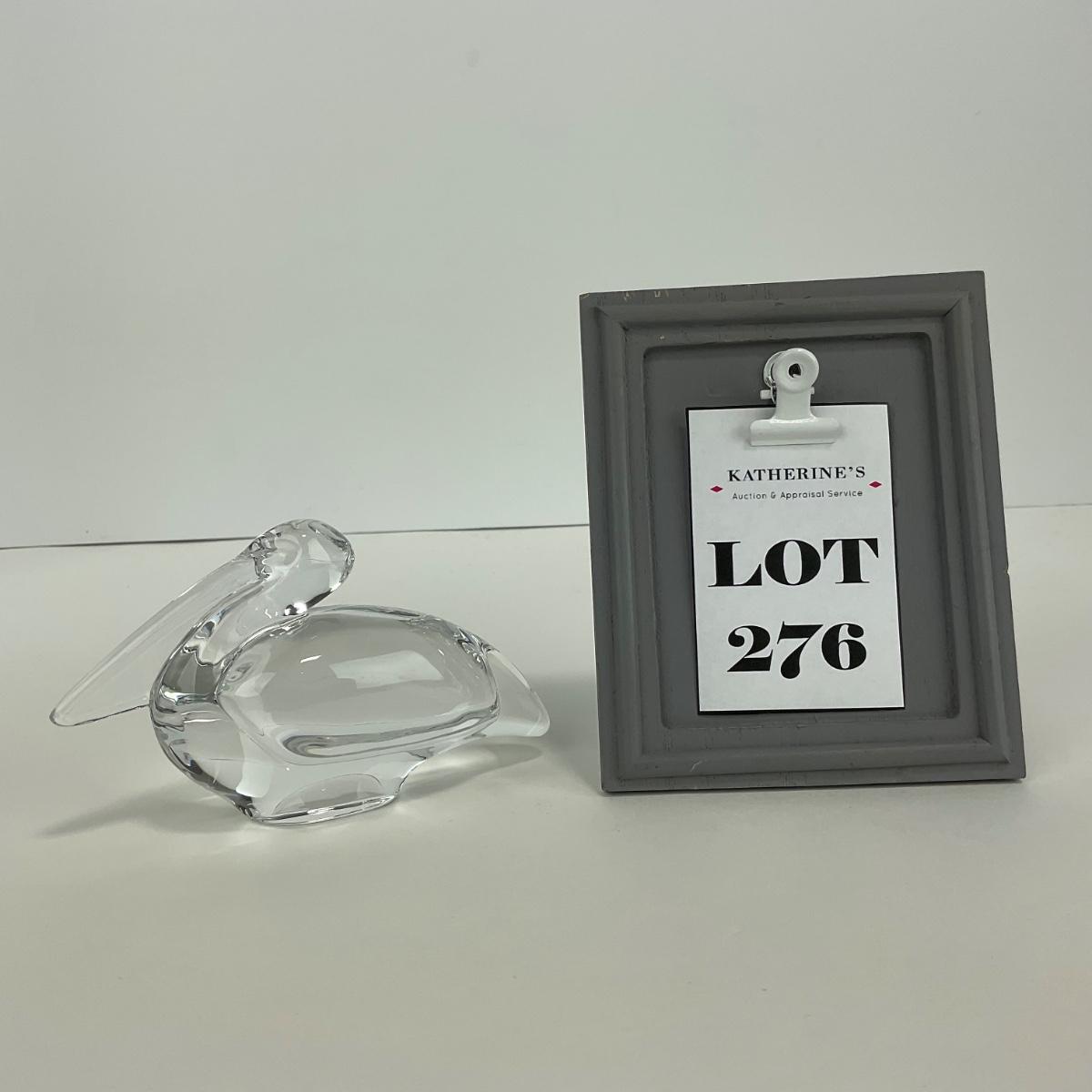 One marked clear crystal pelican figure. This piece has no damage, and appears to be in great shape with no visable chips, cracks, or broken pieces. Please see photos for details and condition. Any condition statement is given as a courtesy to a client, is an opinion, and should not be treated as a statement of fact. Reference to condition written, oral or within a condition report shall not be regarded as a full account of condition and may not include all defects, alterations, or restorations. Absence of a condition report does not imply a lot is flawless or lacking imperfections or damage. Katherine’s Auction & Appraisal Service shall have no responsibility for any error or omission. Returns shall not be accepted on the basis of condition. ::: Shipping is available on this lot. If you require shipping you must let us know at the close of the auction. We will coordinate with you after the item has been won. Shipping fees will include insurance up to or exceeding the value of all items being mailed. If you have any questions regarding this lot please contact the auctioneer either via this website, by direct email or by phone. PICK UP TIMES and other important information can be found in the TERMS and DESCRIPTION of the auction. Please take a look for pertinent information. Thanks!
