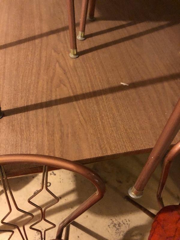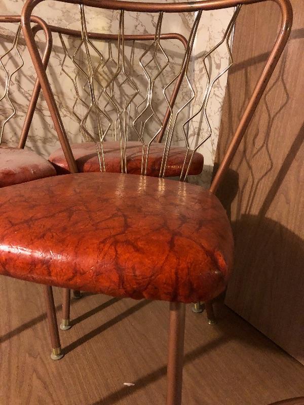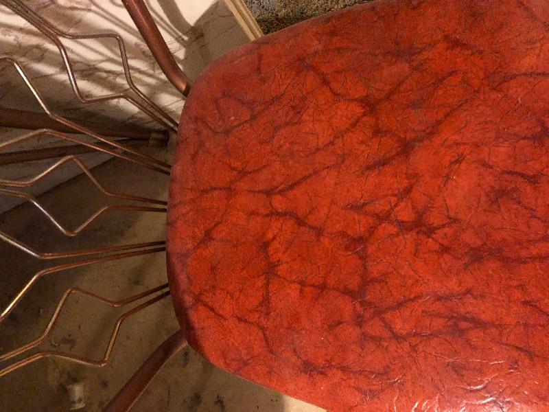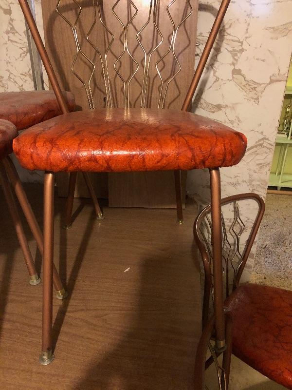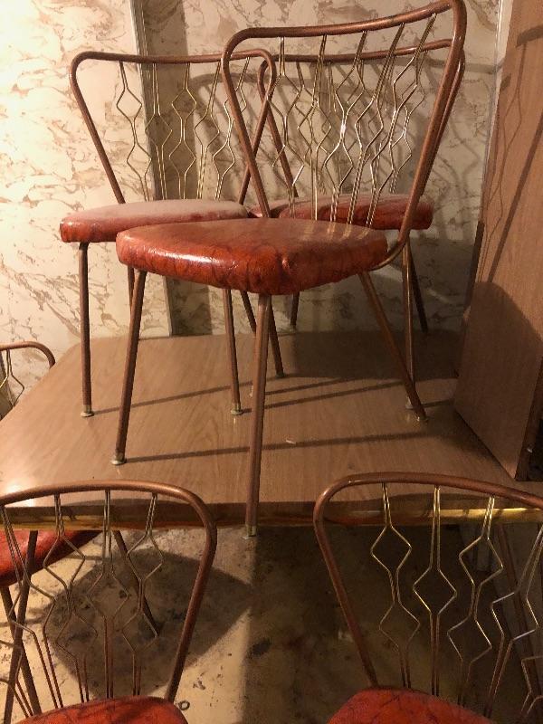 Awesome mid century modern table and chair set table has two leaves six chairs unique style condition is vintage used there are no tears and upholstery. Very sturdy. Great condition. This is an ONSITE Auction all items will need to be picked up on location. Please see auction description for pick up procedures.