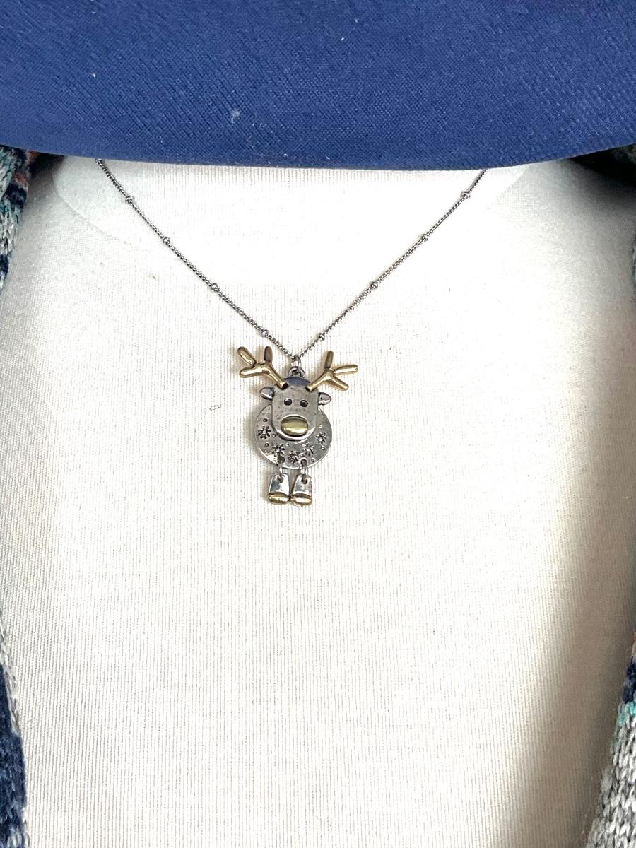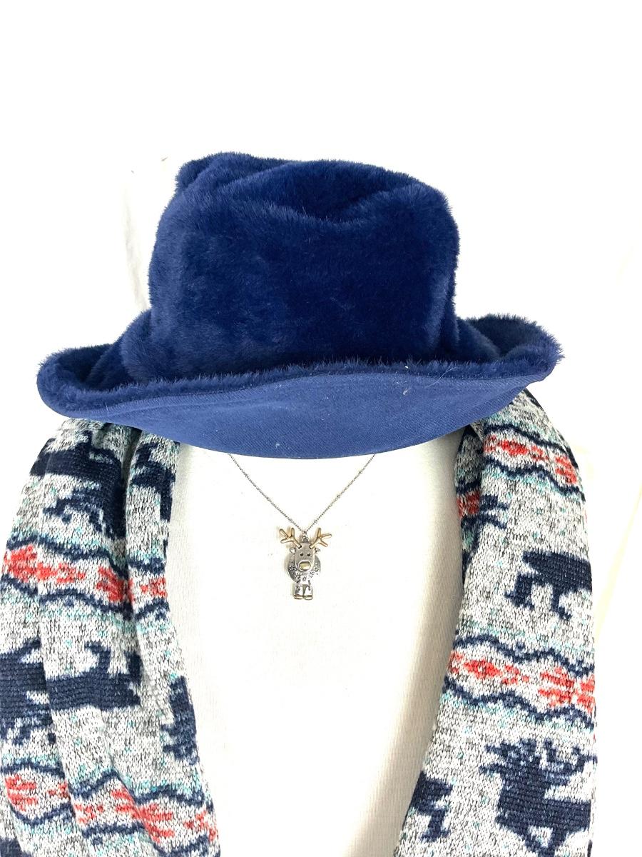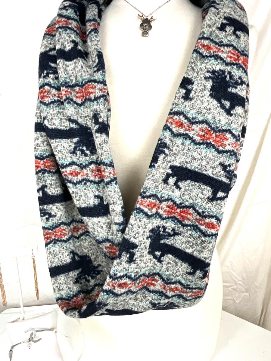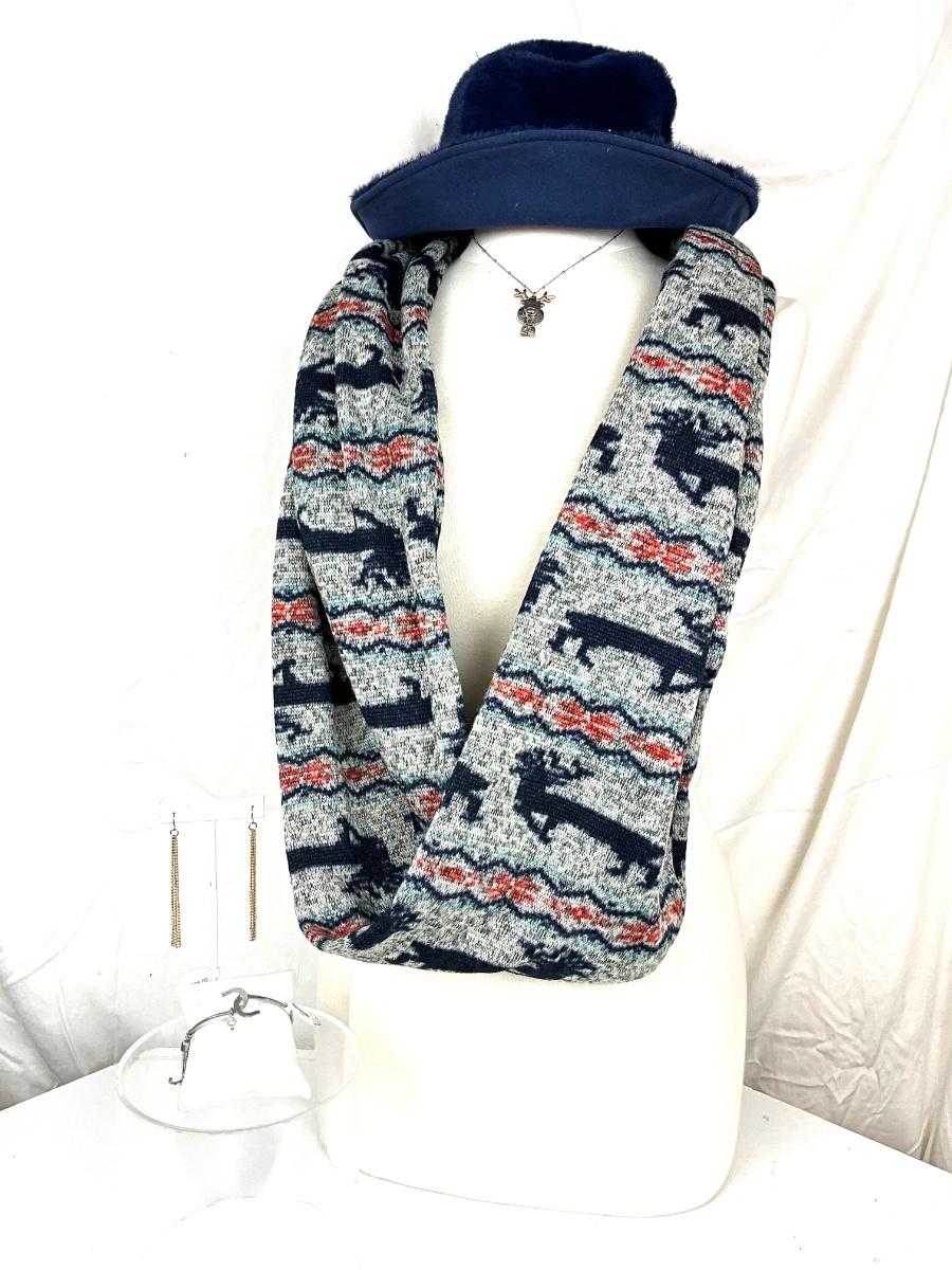276 Reindeer Winter Infinity Scarf, Bucket Hat, Reindeer Necklace and Silvertone Bracelet