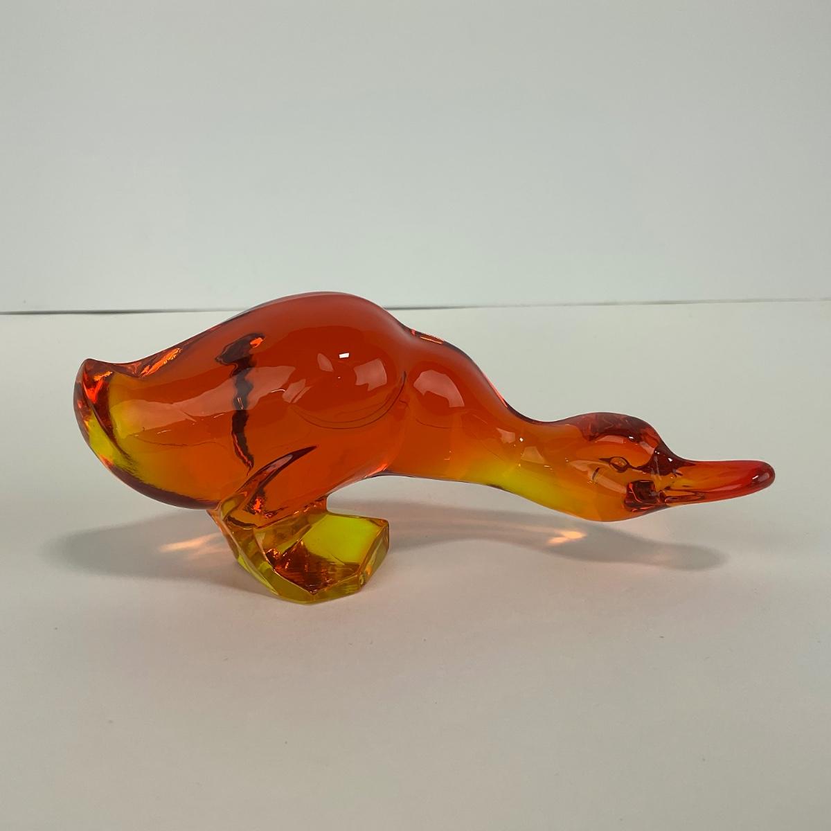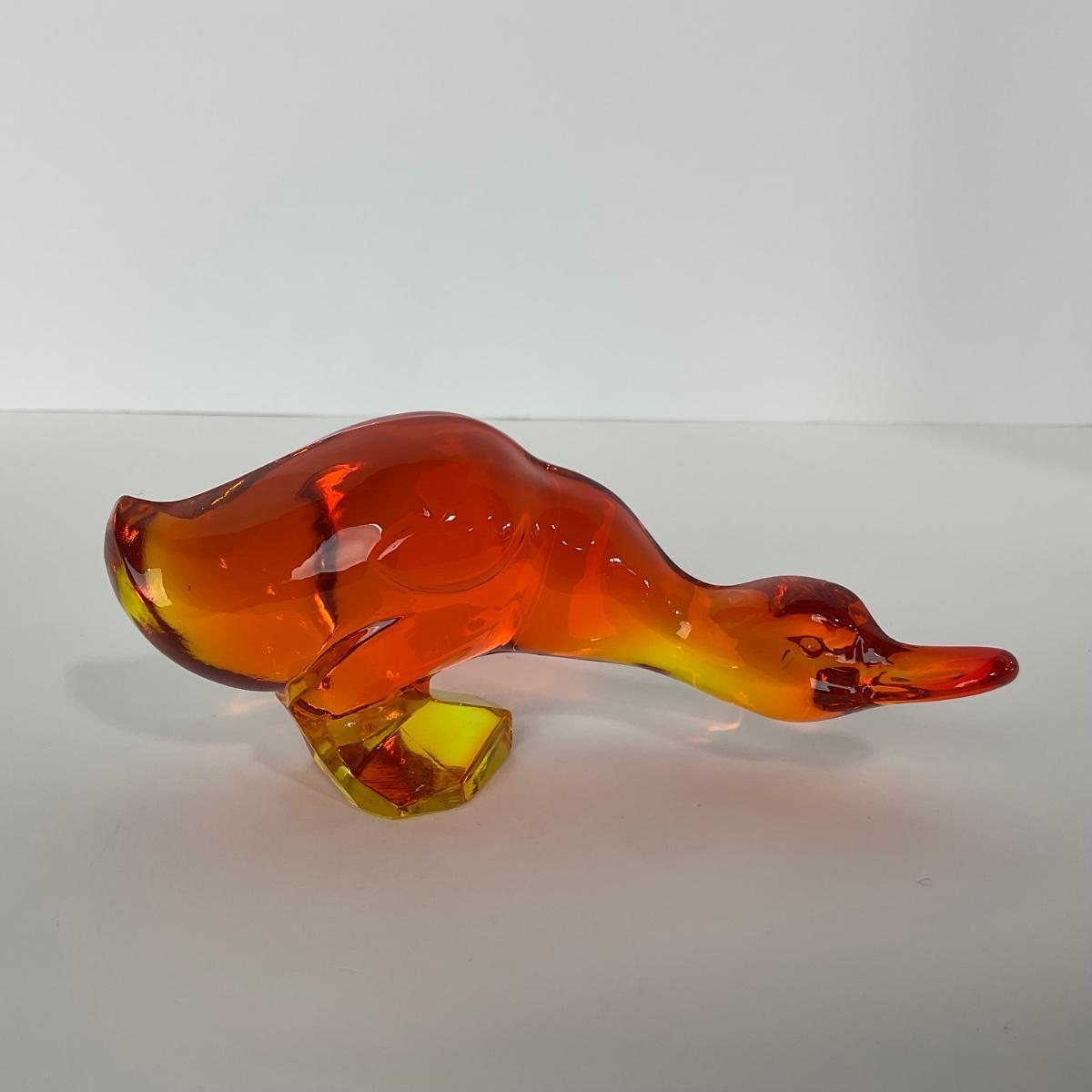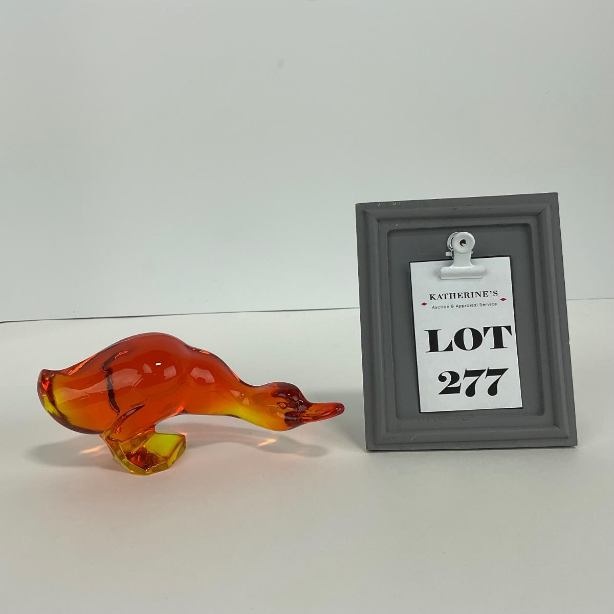 One Viking orange amberina epic fighting duck with head down. 2 1/2 inches tall by 6 inches wide. This piece does have a few scuffs and minor scratches but in otherwise great shape. Please see photos for details and condition. Any condition statement is given as a courtesy to a client, is an opinion, and should not be treated as a statement of fact. Reference to condition written, oral or within a condition report shall not be regarded as a full account of condition and may not include all defects, alterations, or restorations. Absence of a condition report does not imply a lot is flawless or lacking imperfections or damage. Katherine’s Auction & Appraisal Service shall have no responsibility for any error or omission. Returns shall not be accepted on the basis of condition. ::: Shipping is available on this lot. If you require shipping you must let us know at the close of the auction. We will coordinate with you after the item has been won. Shipping fees will include insurance up to or exceeding the value of all items being mailed. If you have any questions regarding this lot please contact the auctioneer either via this website, by direct email or by phone. PICK UP TIMES and other important information can be found in the TERMS and DESCRIPTION of the auction. Please take a look for pertinent information. Thanks!