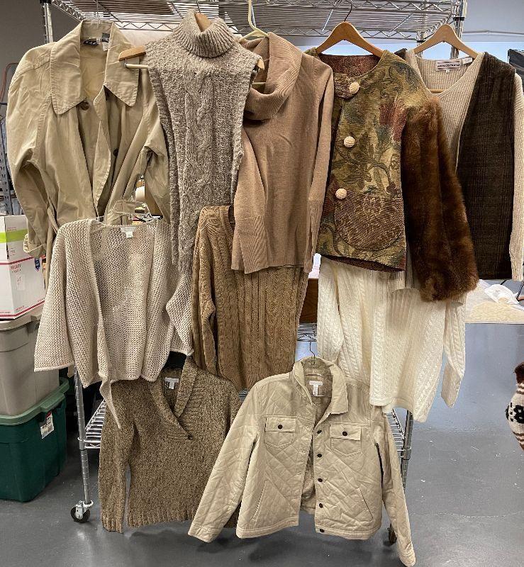 Good Wearable Condition. Banana Republic, Gap, Charter Club etc. Mostly Tan Toned. Medium to Large. Coats and Swearers. All Used.