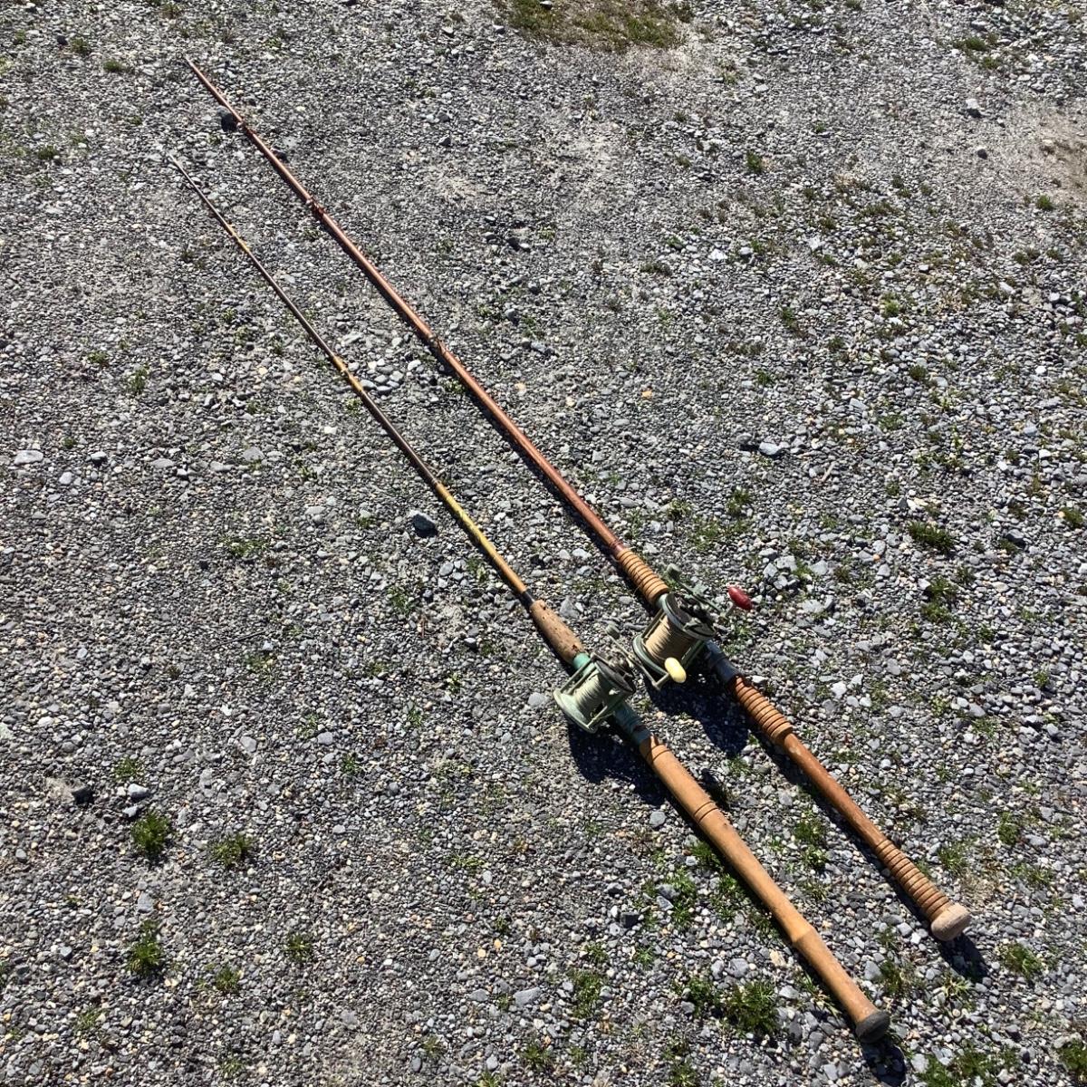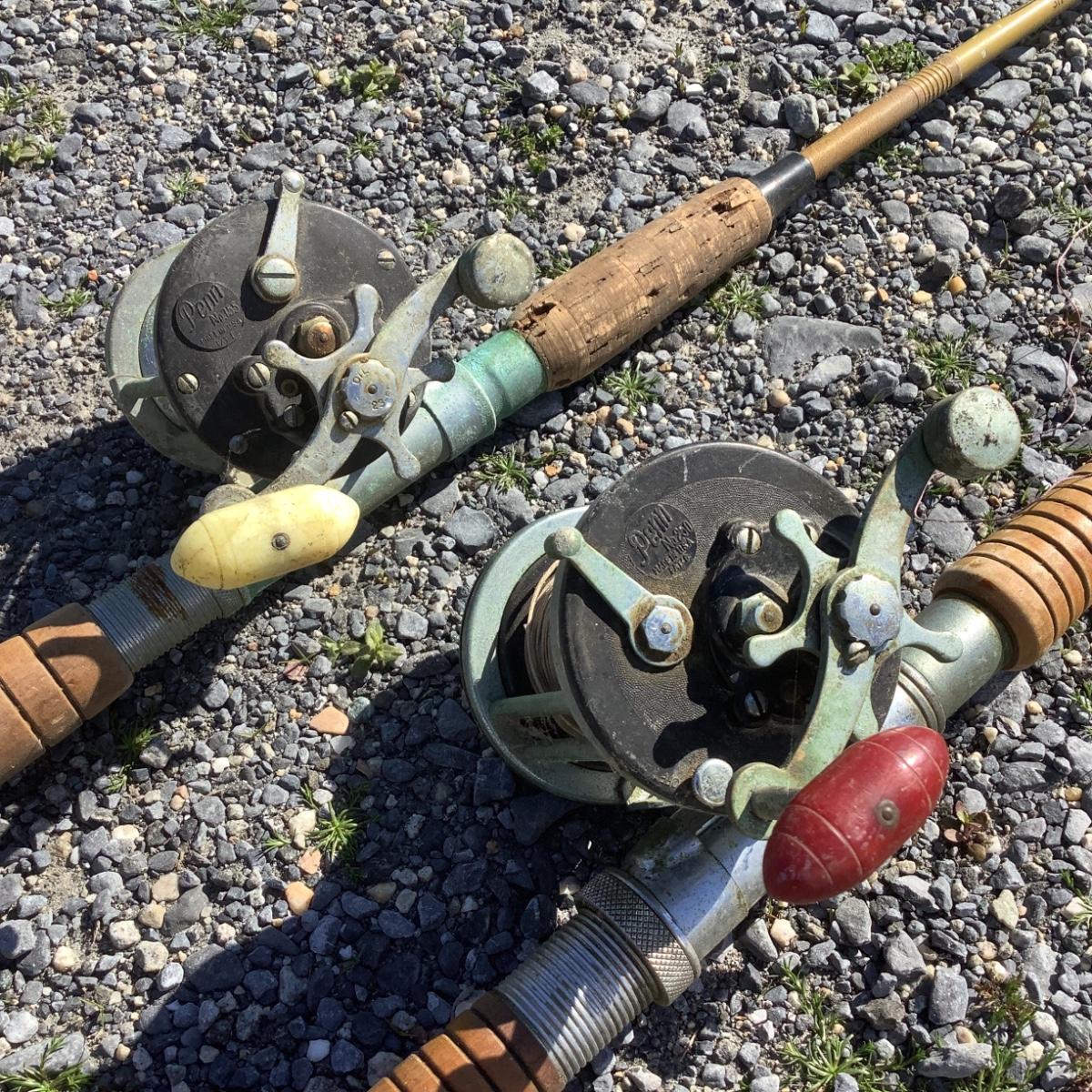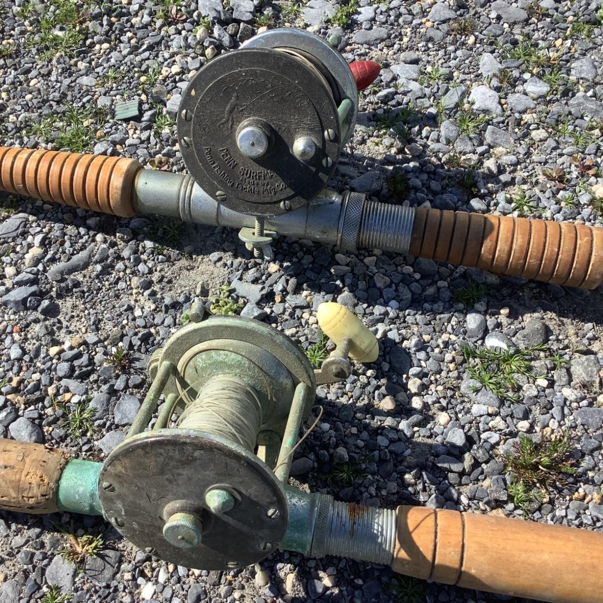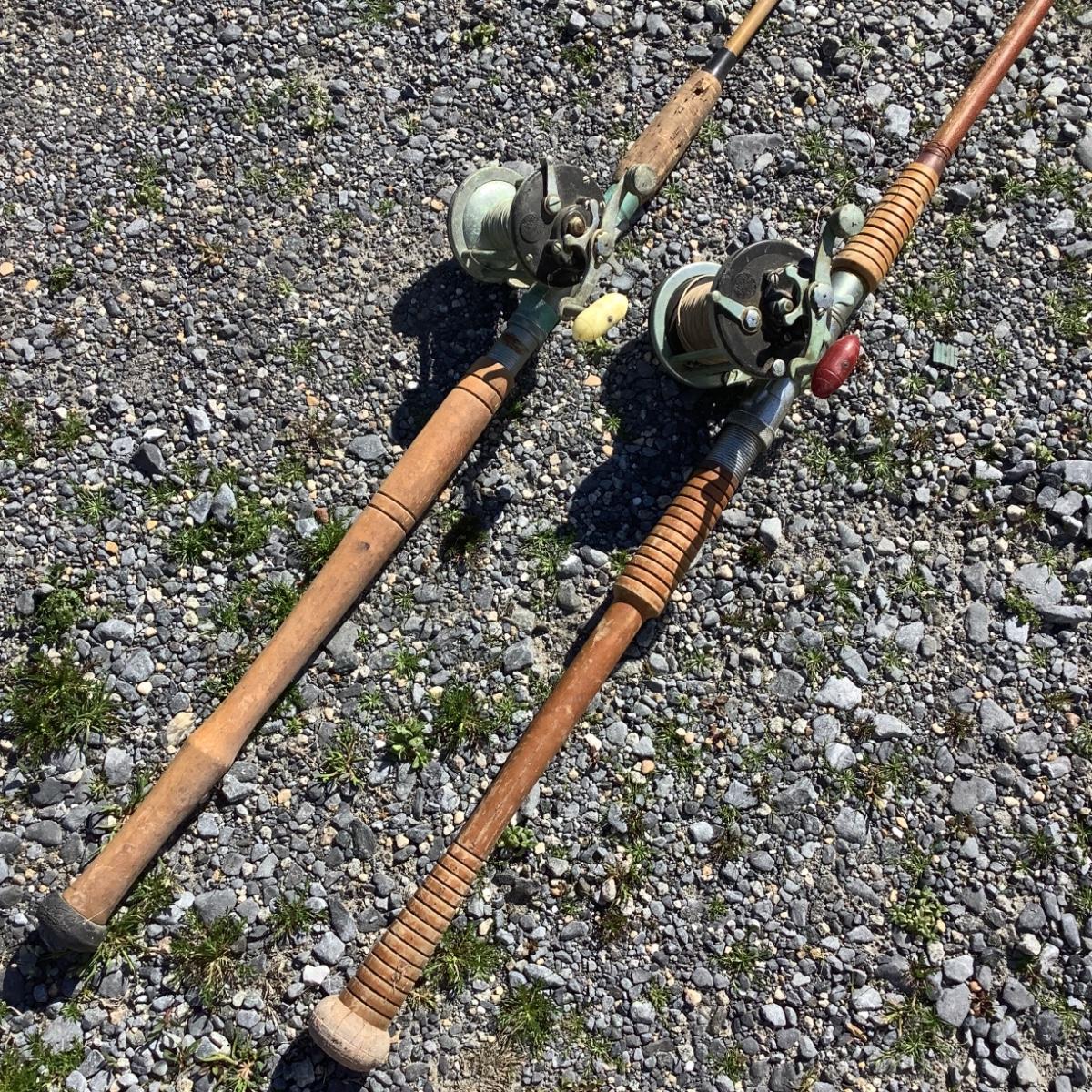 279 Vintage Hand Carved Fishing Poles with Penn Fly Wheels