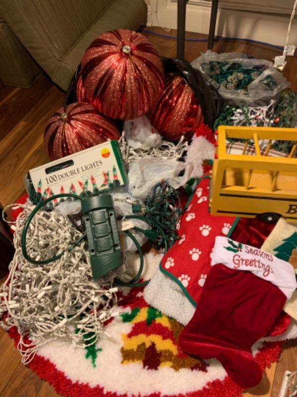 Christmas Decor includes, Large Ornaments, lights, figures, wreaths, tree skirts, Toys, stockings and Storage containers. Was $65