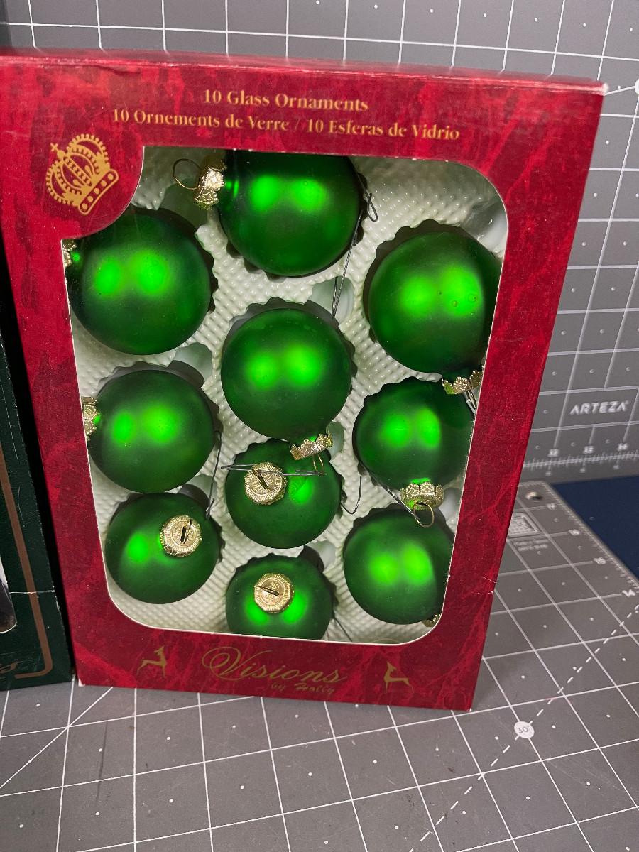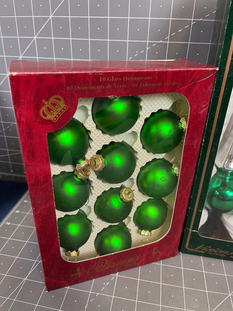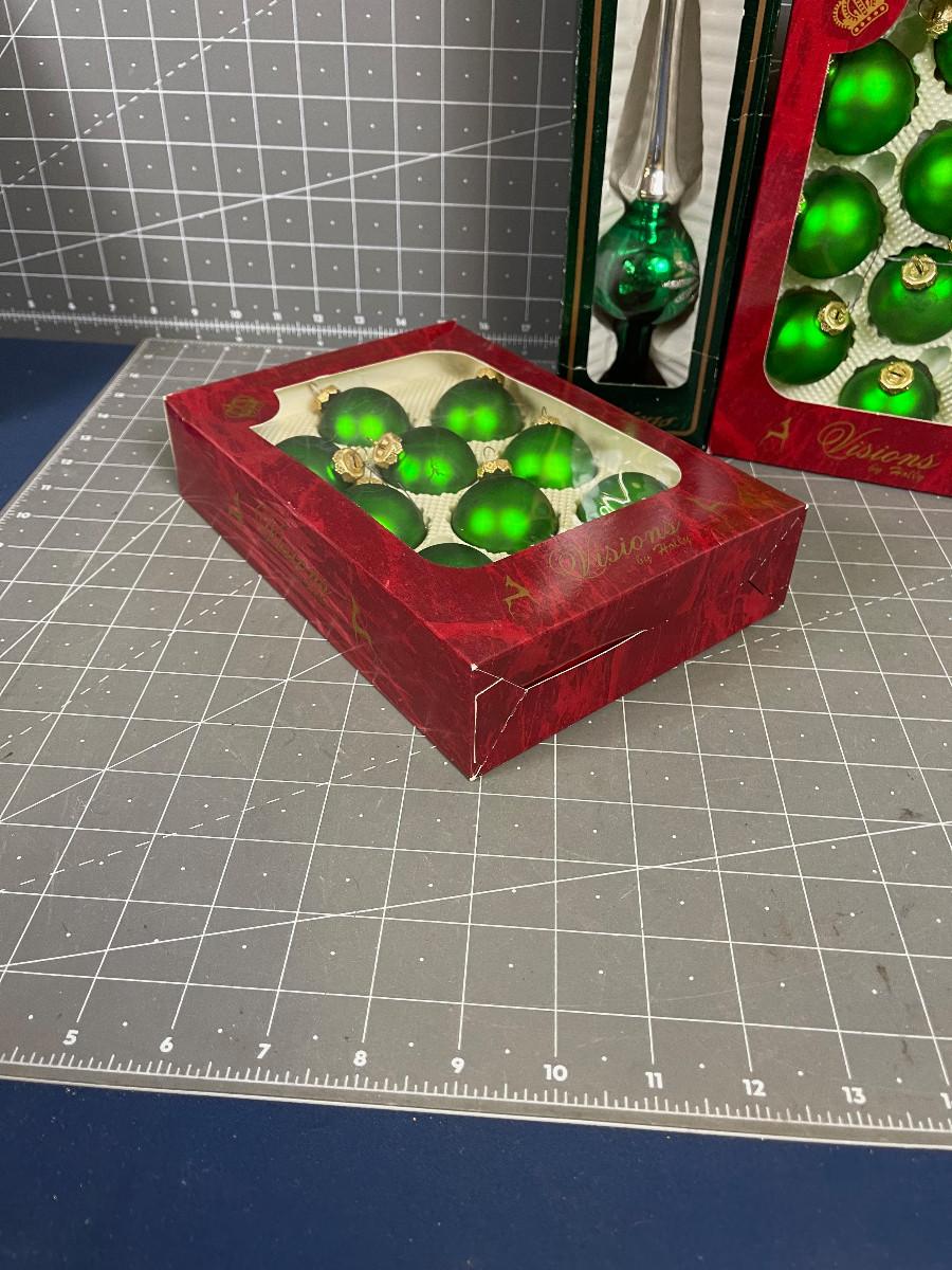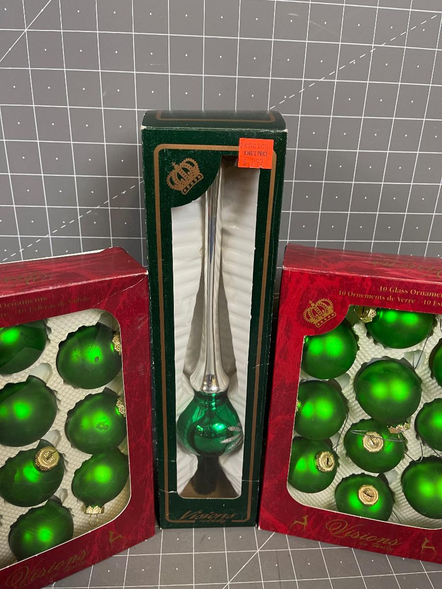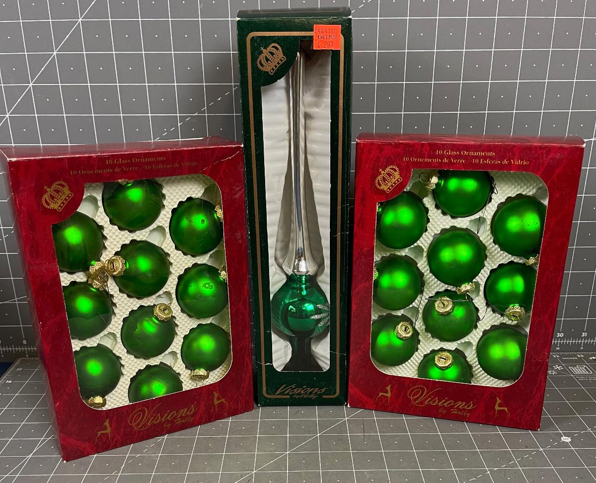 #28 Christmas GREEN Bulbs by Visions by Holly 2 Bx and tree Topper