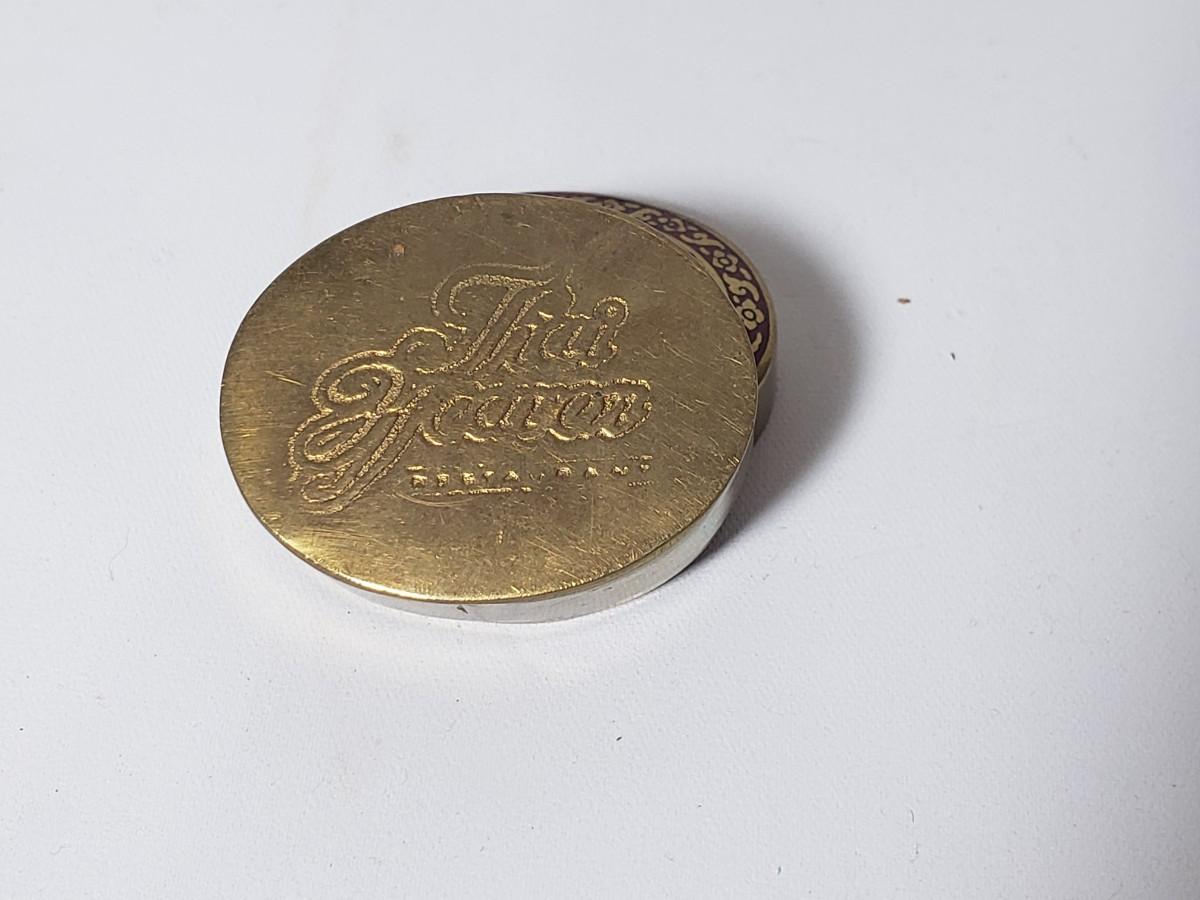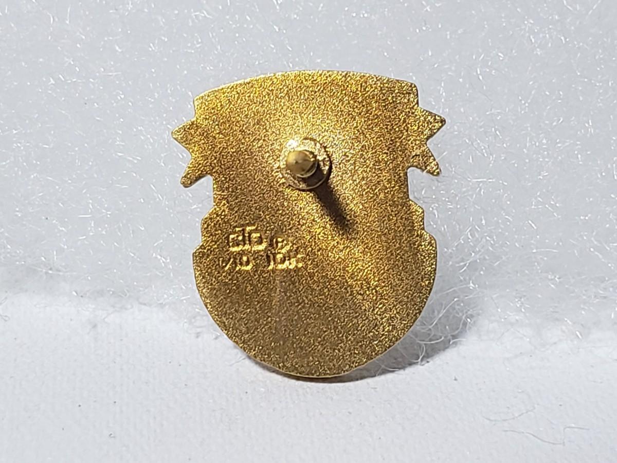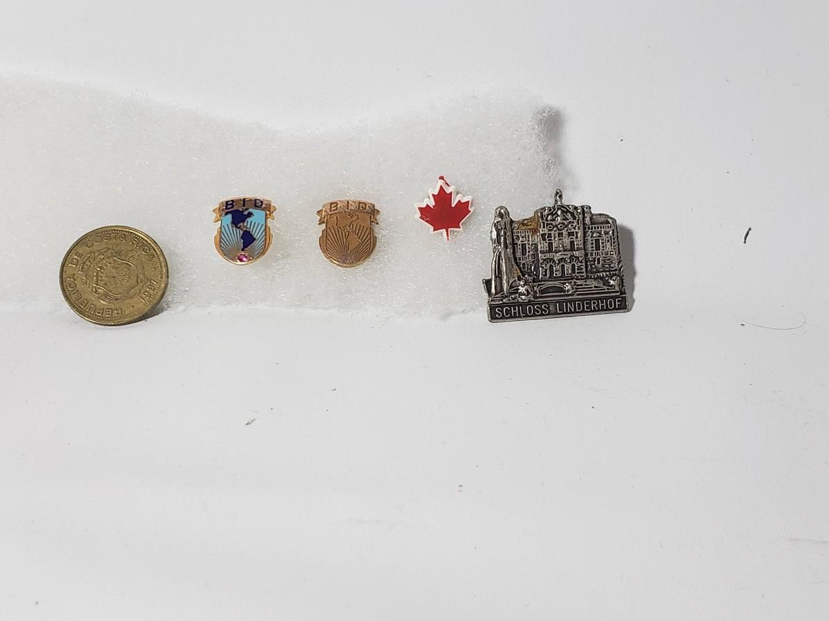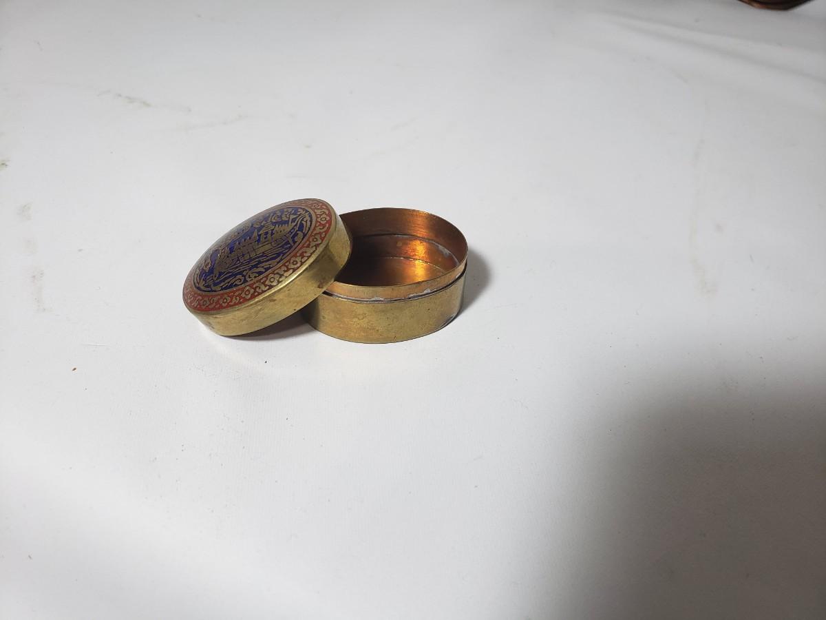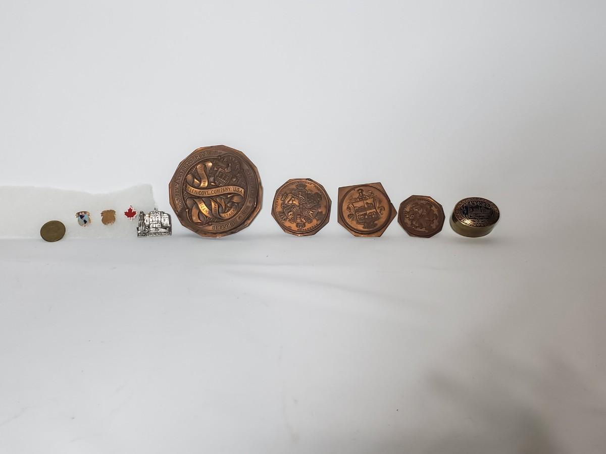 2 - 10K BID pins, Costa Rica coin, German pin, pill box, nesting copper colored trays.