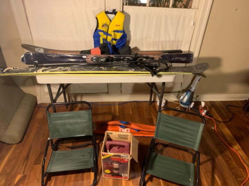 Lot of Sporting Equipment. Includes 2 Camping Chairs, Coleman lantern, Water Ski with Case, Water Vest Childs size, 2 sets of skis , one set of poles. Was $65