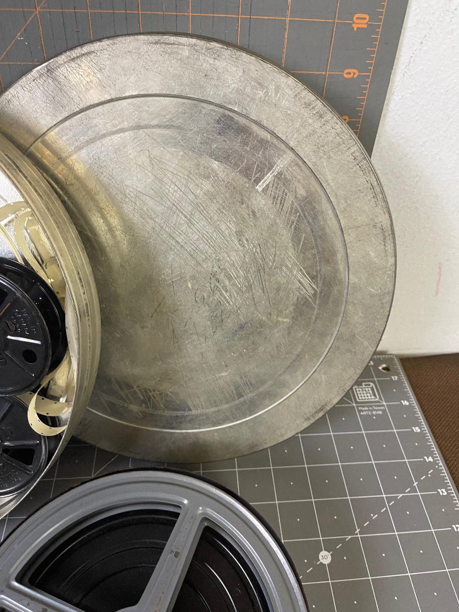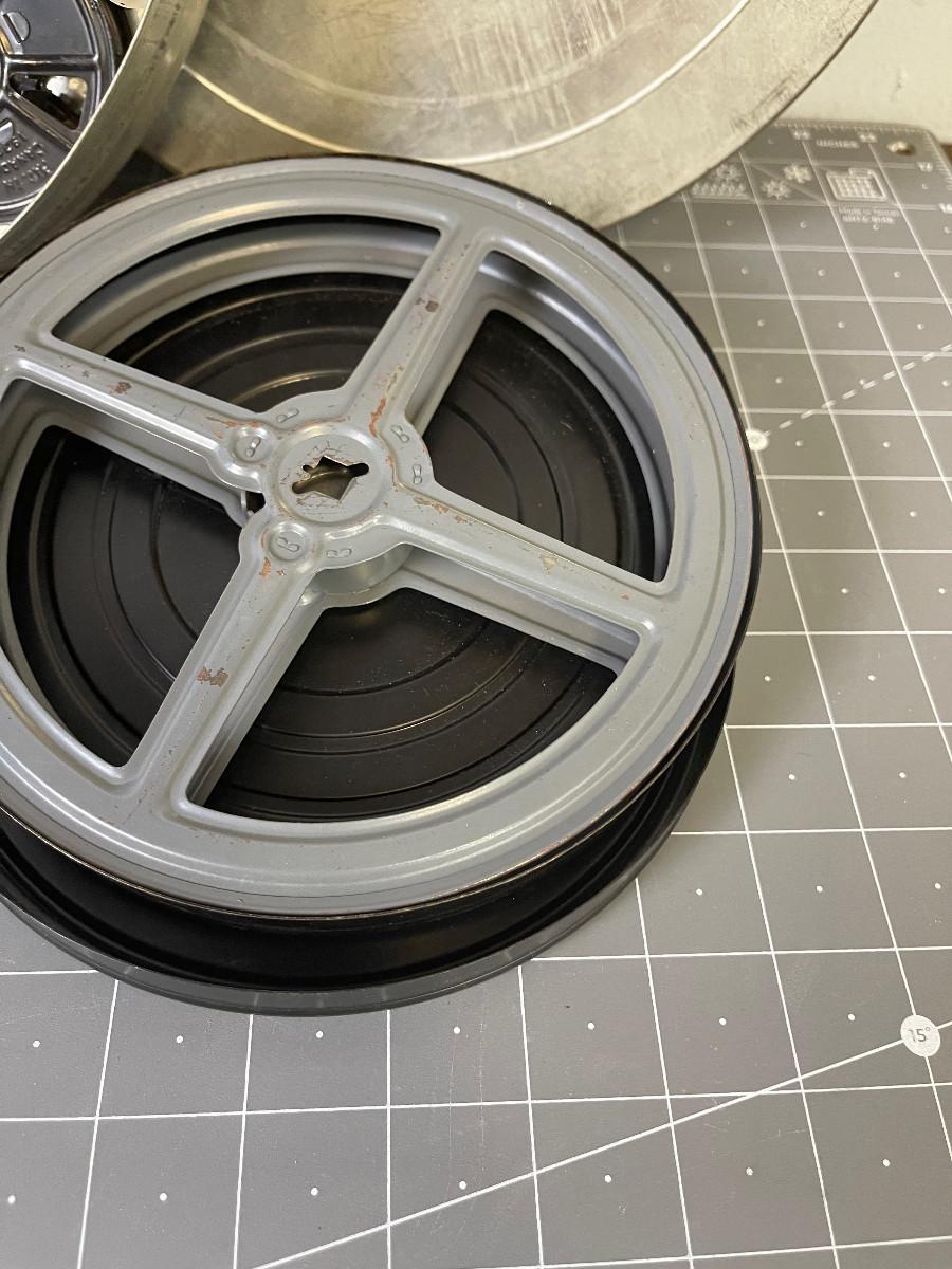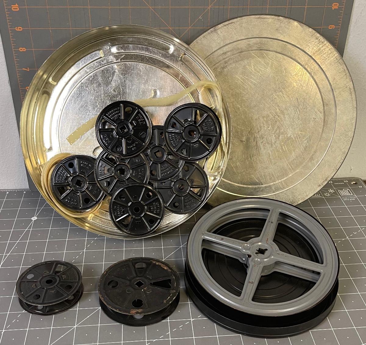 #28 Stack of 16 mm movie reels and tins