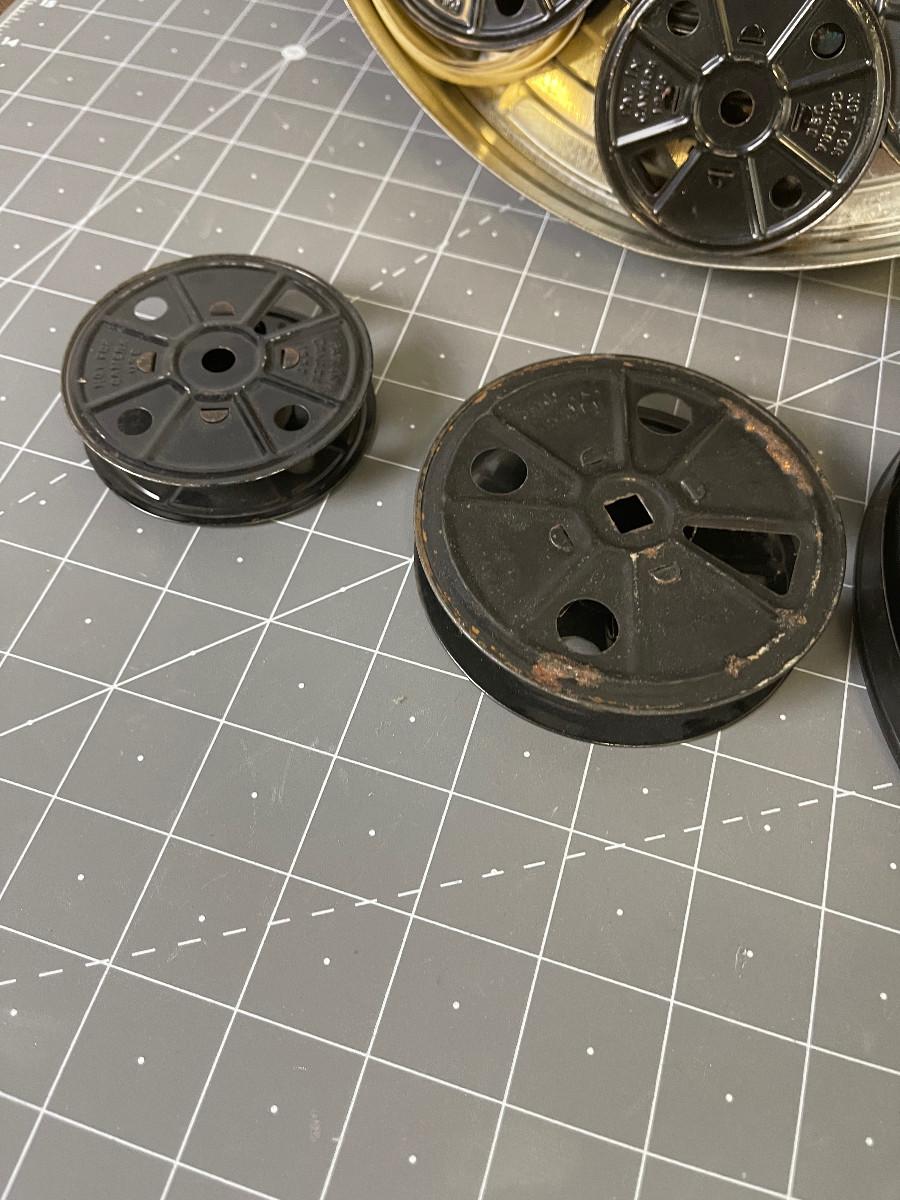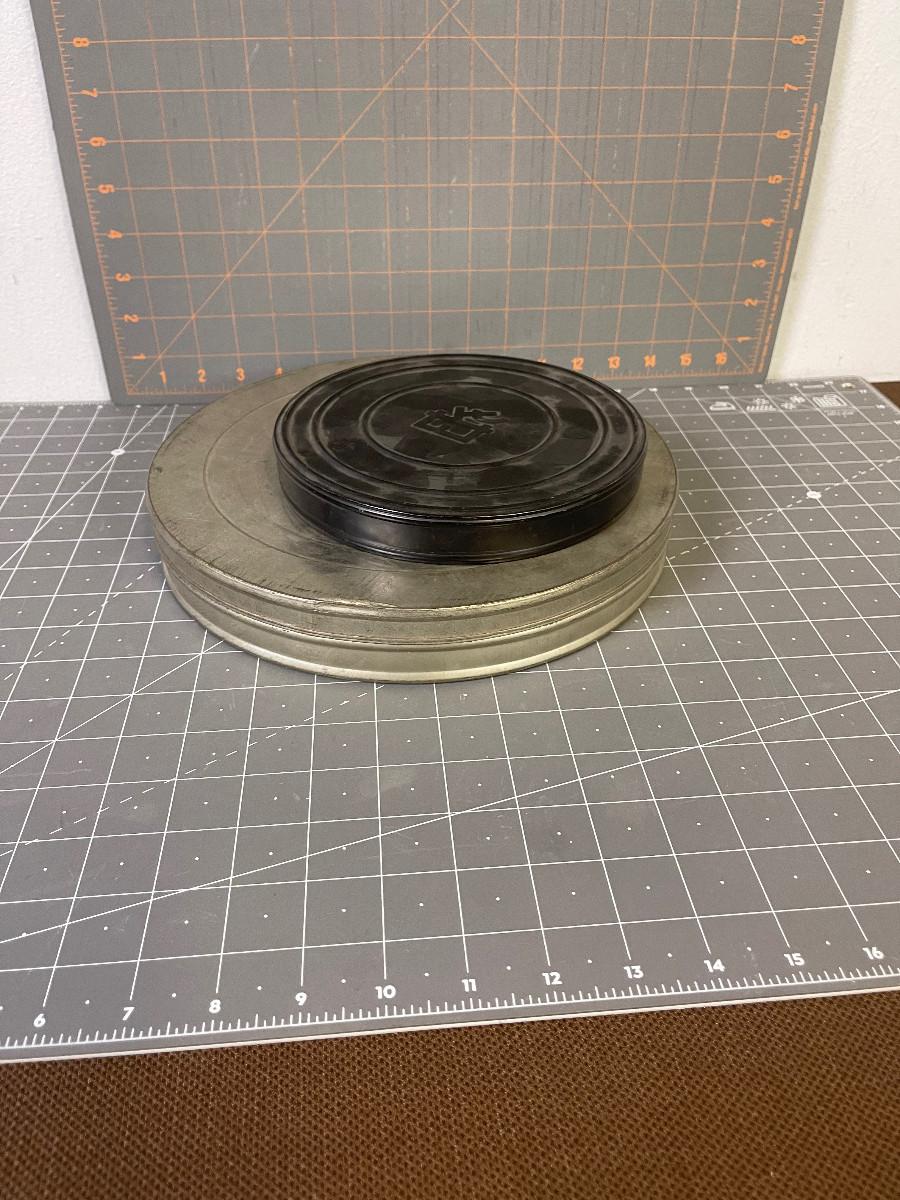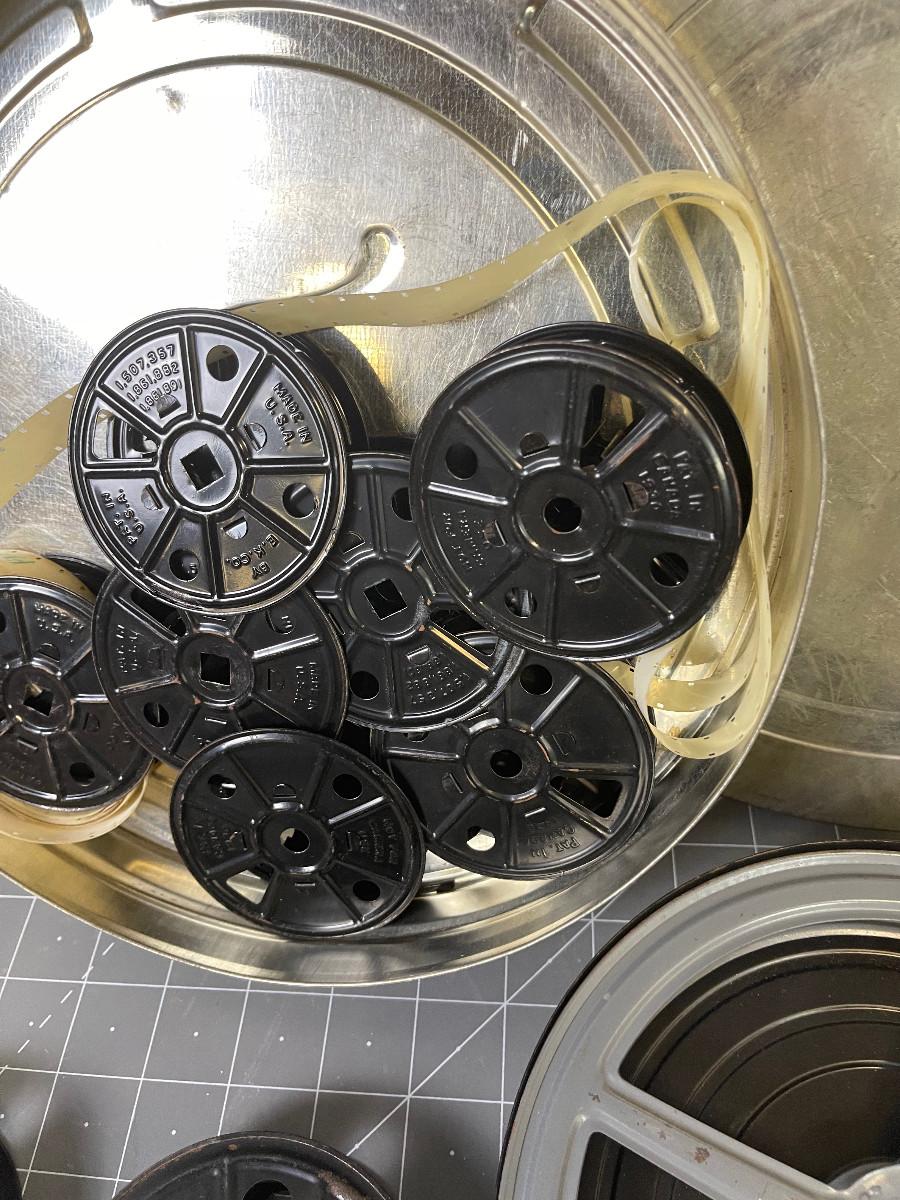 #28 Stack of 16 mm movie reels and tins