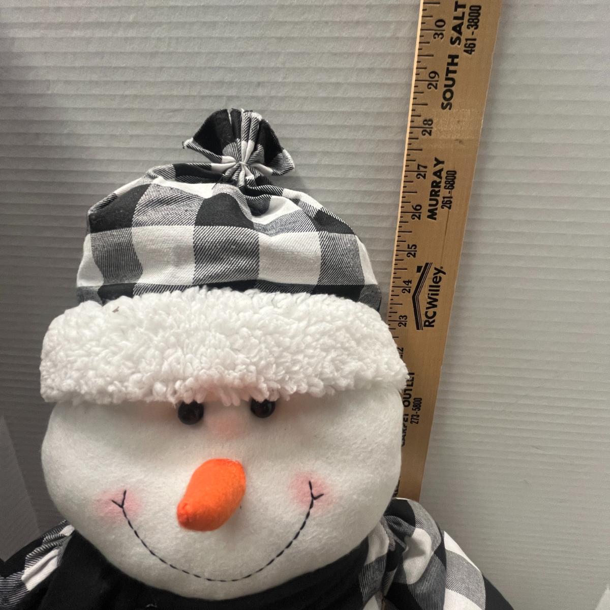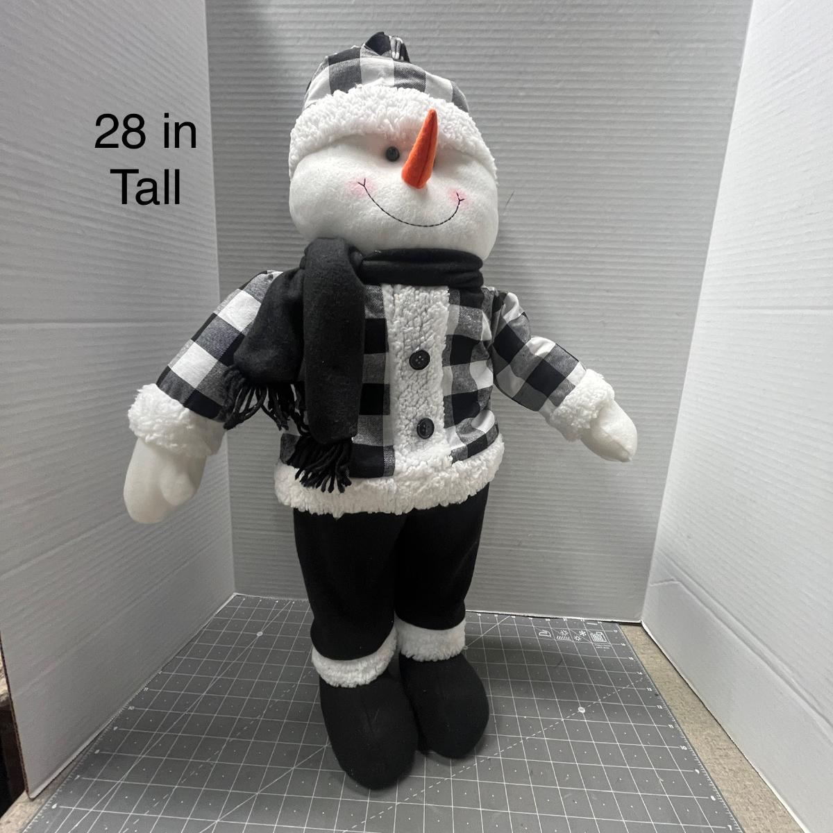 Wears checkered outfit, faux fur trim, scarf, and hat.