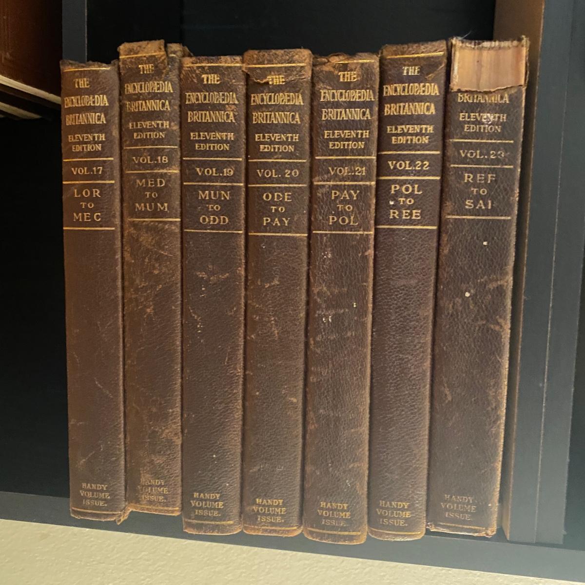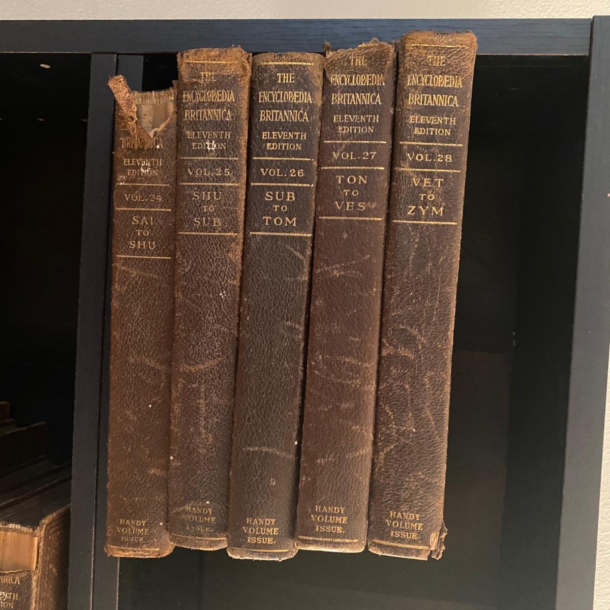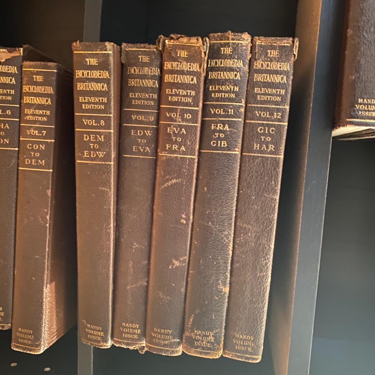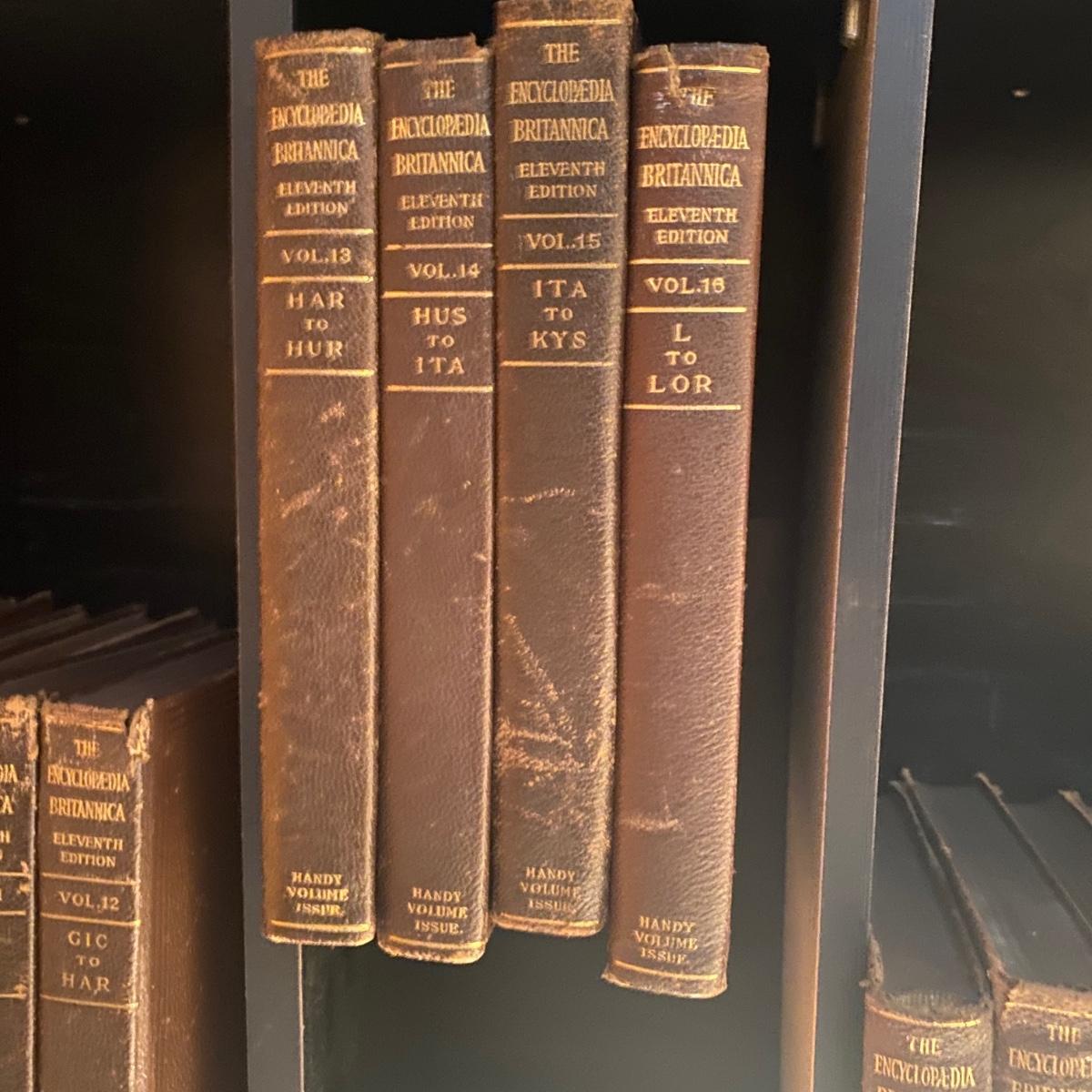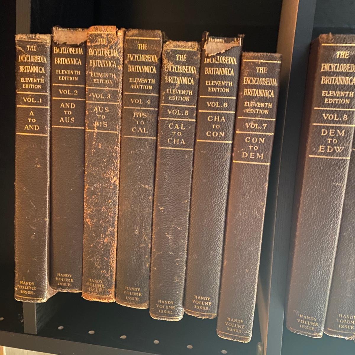This leather set of Encyclopedia Britannica is an 11th edition published in 1911. Fascinating to see a snapshot of knowledge at that time. Volumes 1 through 28 are included. Some wear on some of the bindings but pages and pull outs appear to be intact. Arch binding says “Handy Volume Issue” on the bottom. Shipping available. Bookshelf in photos is not included.