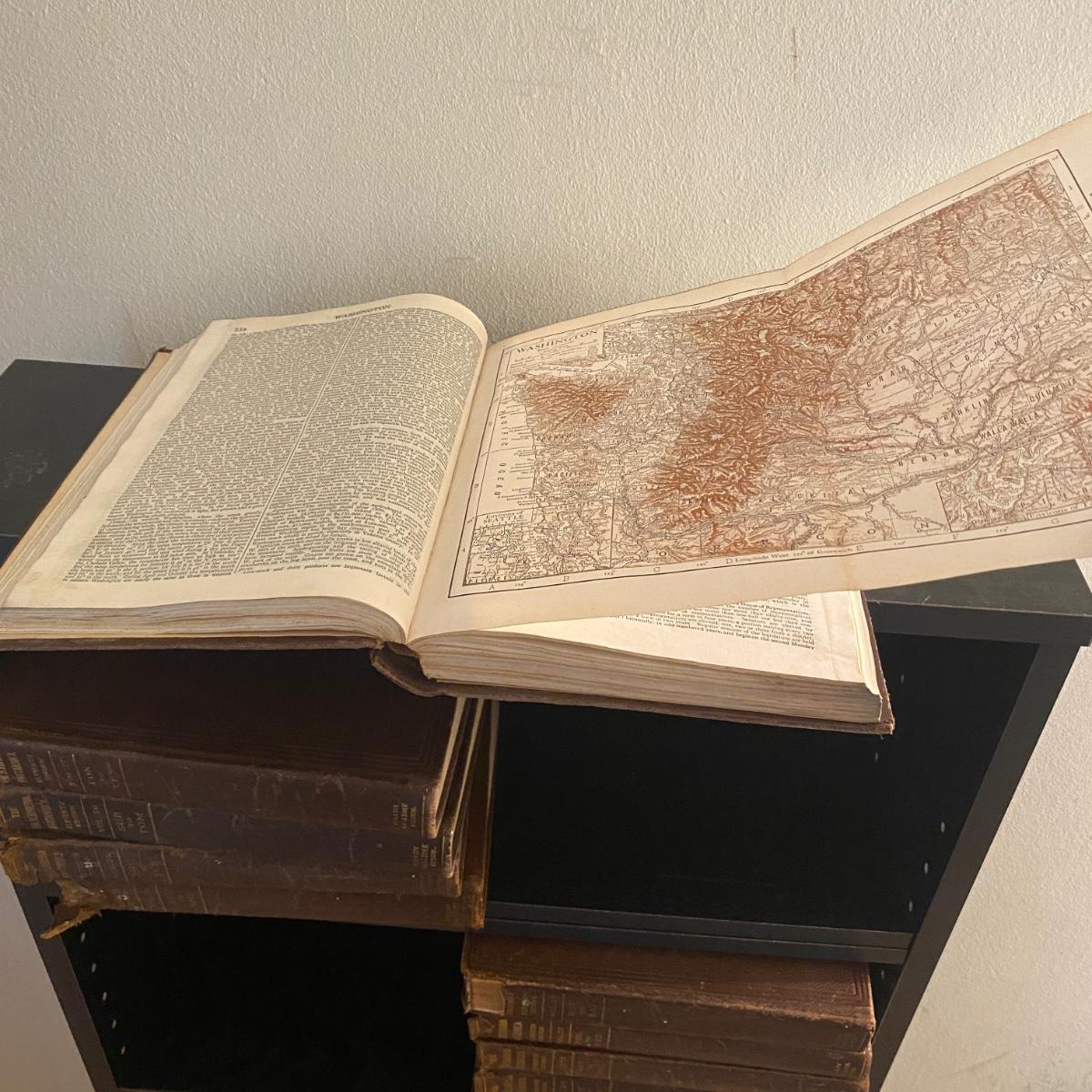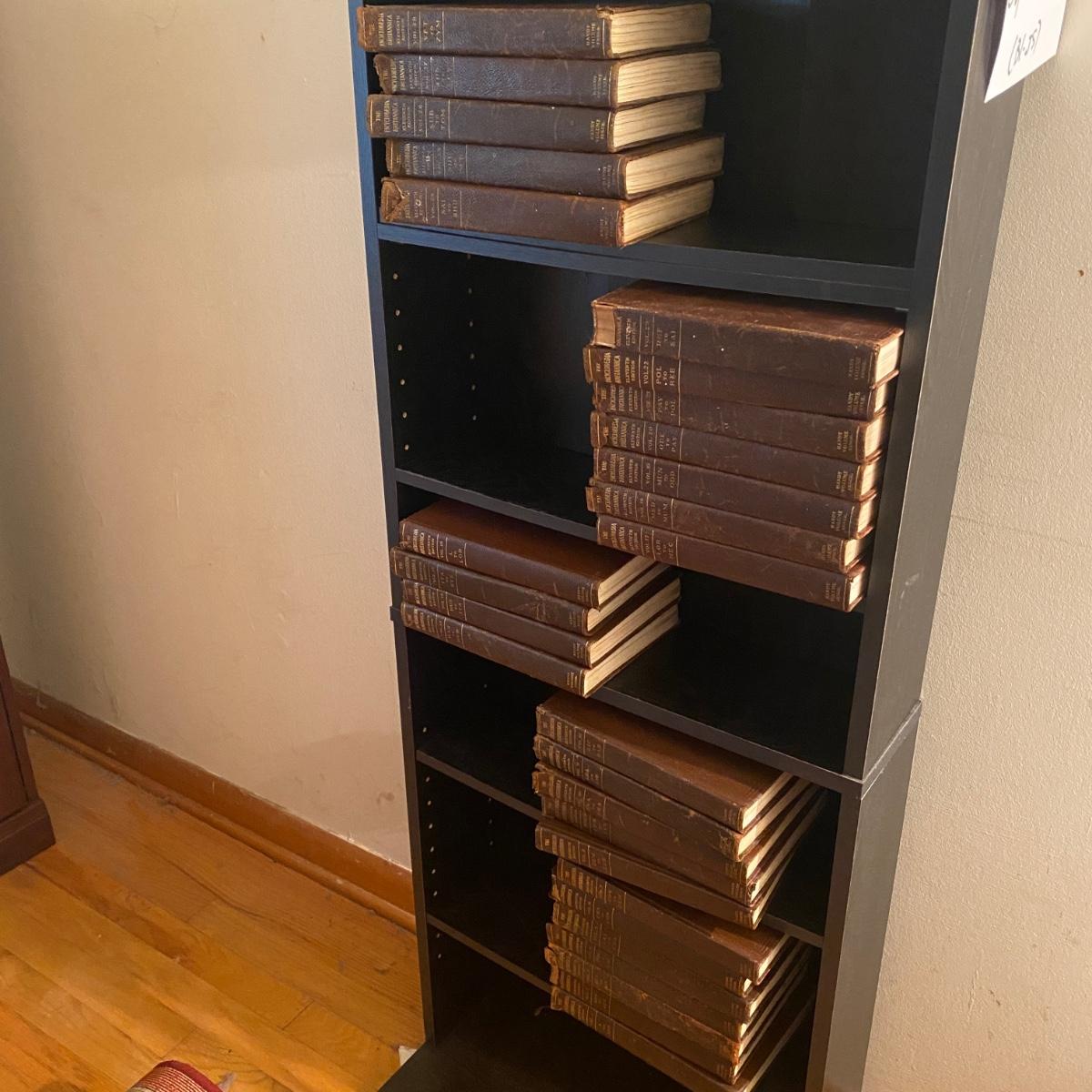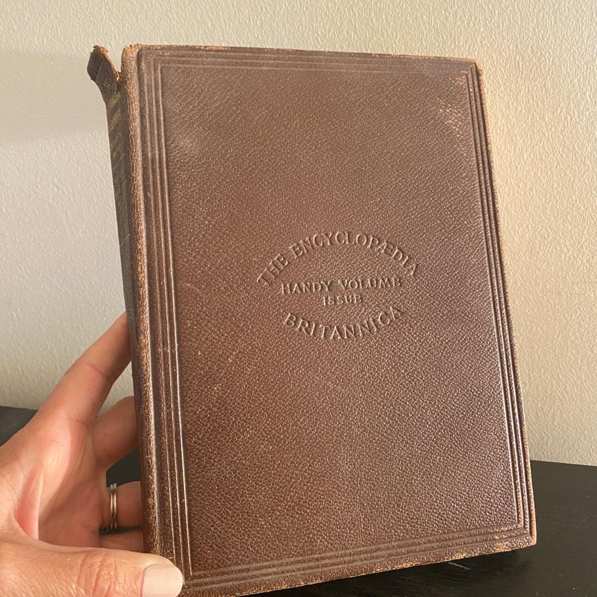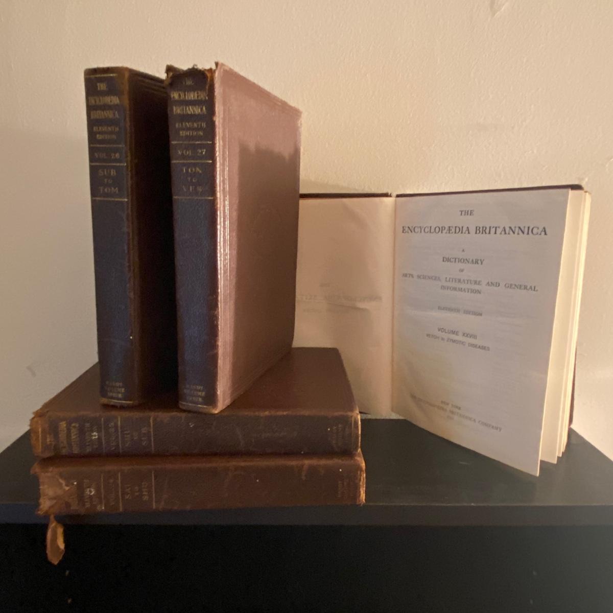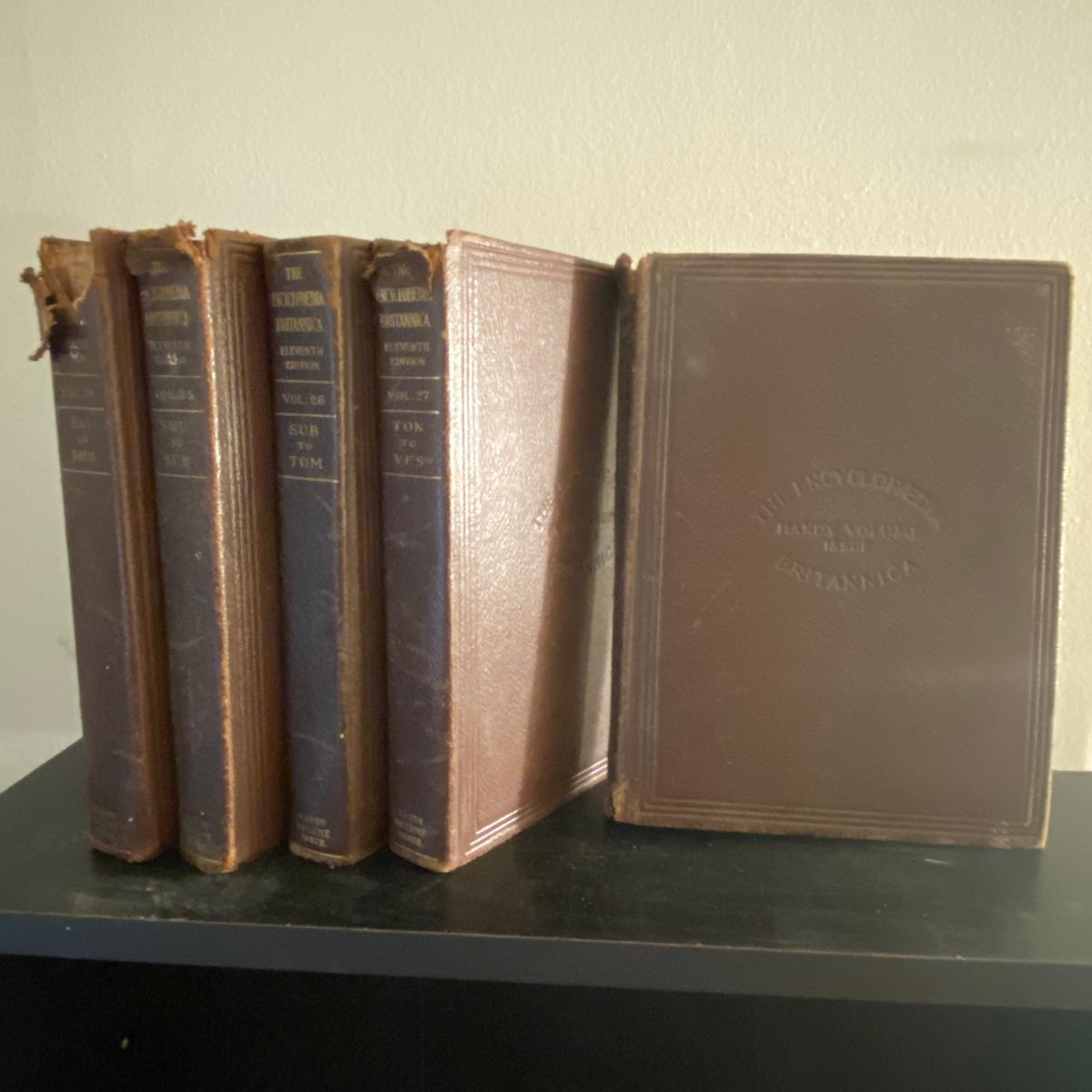 This leather set of Encyclopedia Britannica is an 11th edition published in 1911. Fascinating to see a snapshot of knowledge at that time. Volumes 1 through 28 are included. Some wear on some of the bindings but pages and pull outs appear to be intact. Arch binding says “Handy Volume Issue” on the bottom. Shipping available. Bookshelf in photos is not included.