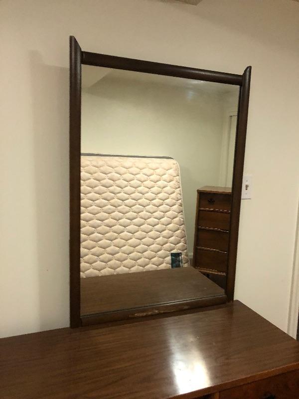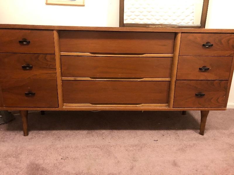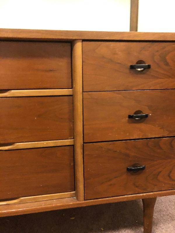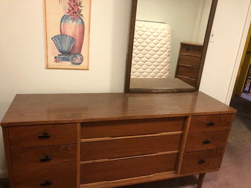 Montgomery Ward MCM dresser with mirror measures 30 tall by 61 wide and 17 1/2 why my 40 tall vintage used condition. Great condition. This is an ONSITE Auction all items will need to be picked up on location. Please see auction description for pick up procedures.