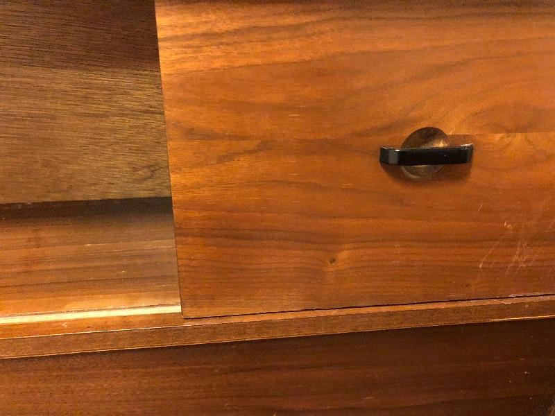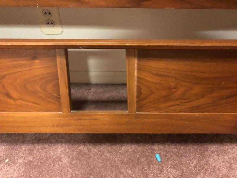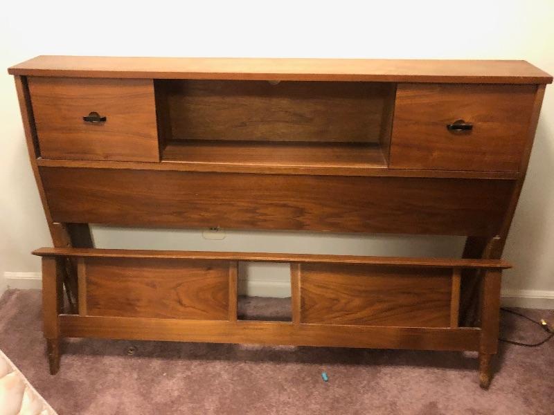 Montgomery Ward MCM headboard and foot board with rails slide-able cupboard space on dresser vintage used condition size full. Great condition, although the top rail on the foot board is loose, a bit of glue should remedy it. . This is an ONSITE Auction all items will need to be picked up on location. Please see auction description for pick up procedures.