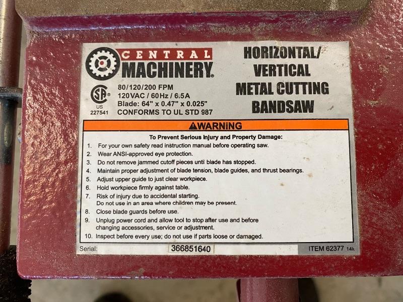 Central Machinery horizontal/vertical Metal cutting bandsaw with a 64” blade