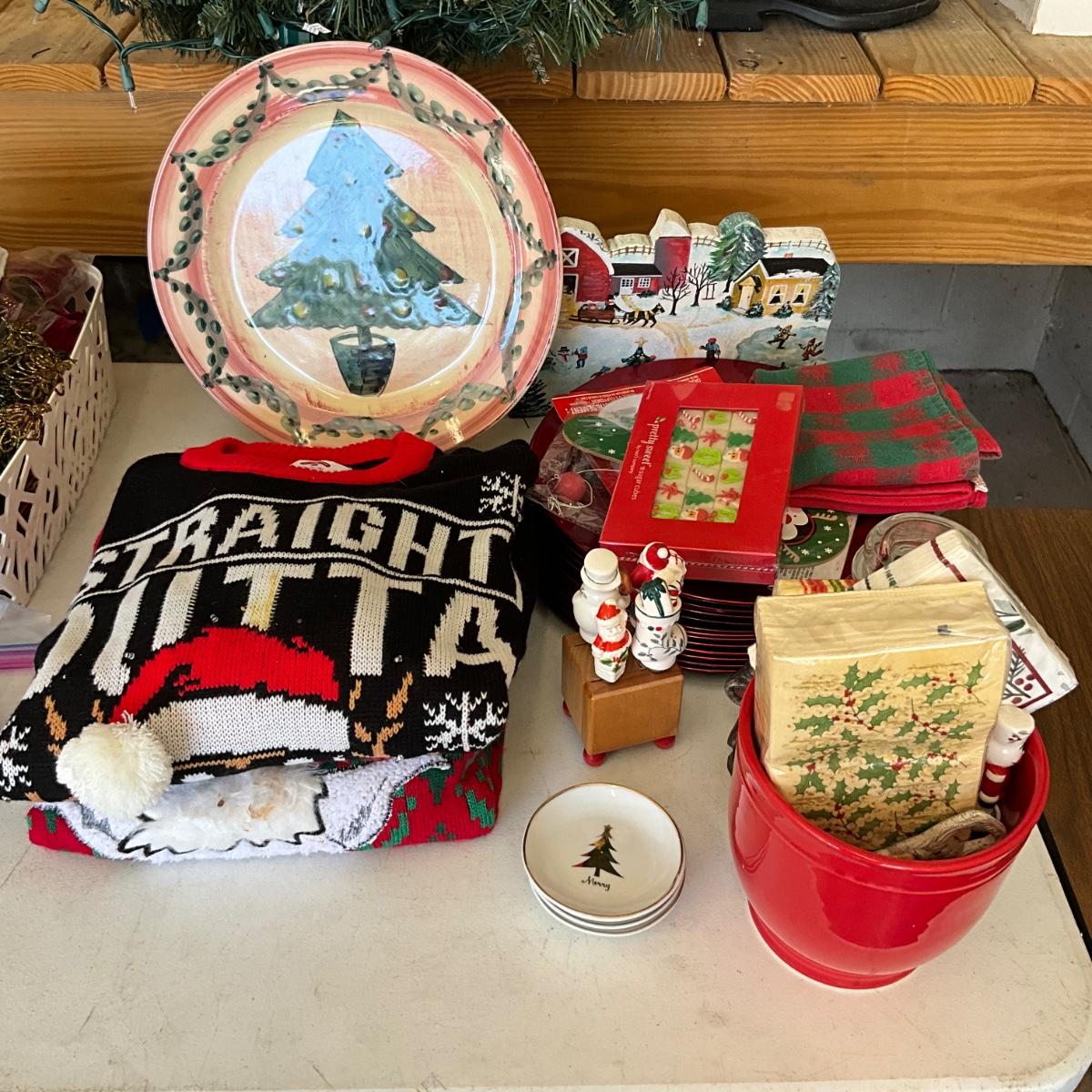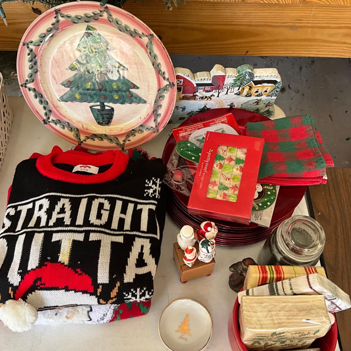 Lot contains sweaters, plates, napkins, painted scene, candles, platter and more.