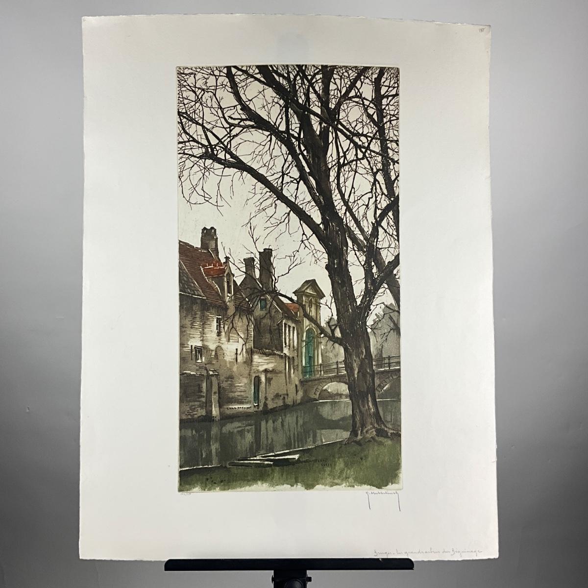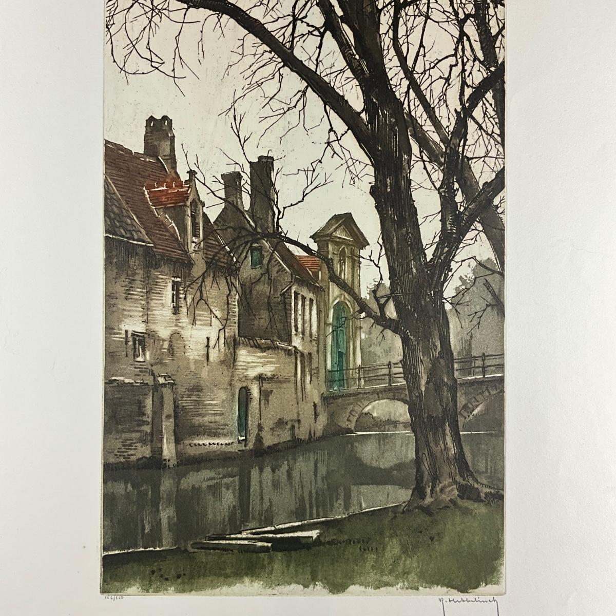 188 Flemish Hand Colored Etching Signed & Numbered #152/350 "Bruges" Trees, Canal & Architecture R. Hebbelinck