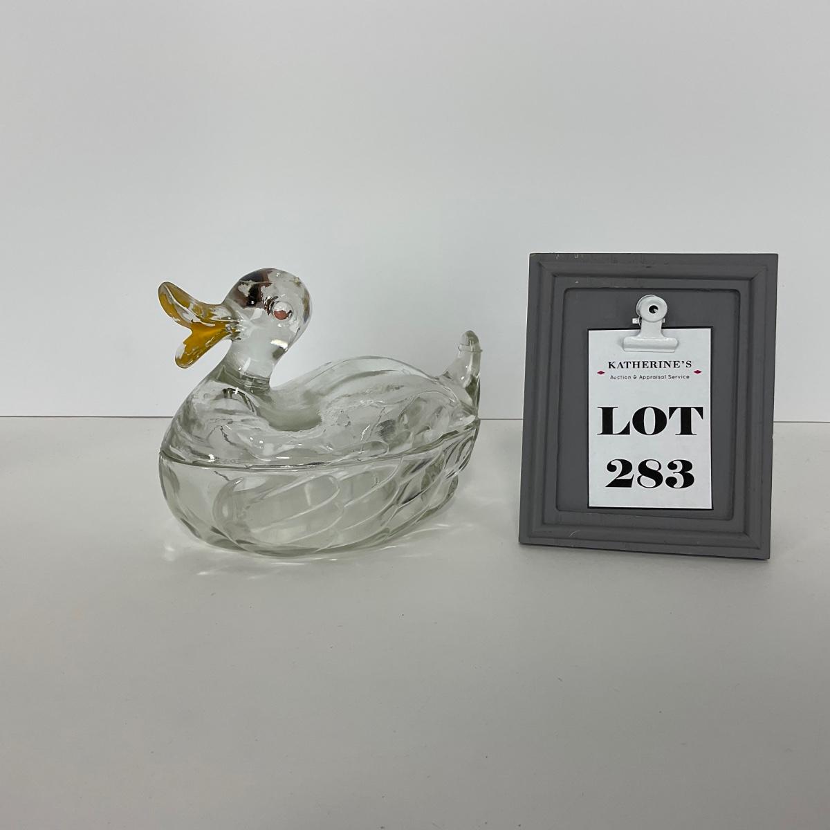 One vintage depression glass duck painted trinket box. Please see photos for details and condition. ::: Shipping is available on this lot. If you require shipping you must let us know at the close of the auction. We will coordinate with you after the item has been won. Shipping fees will include insurance up to or exceeding the value of all items being mailed. If you have any questions regarding this lot please contact the auctioneer either via this website, by direct email or by phone. PICK UP TIMES and other important information can be found in the TERMS and DESCRIPTION of the auction. Please take a look for pertinent information. Thanks!