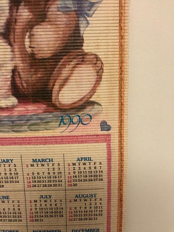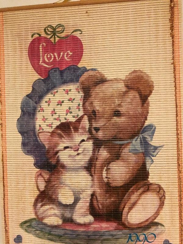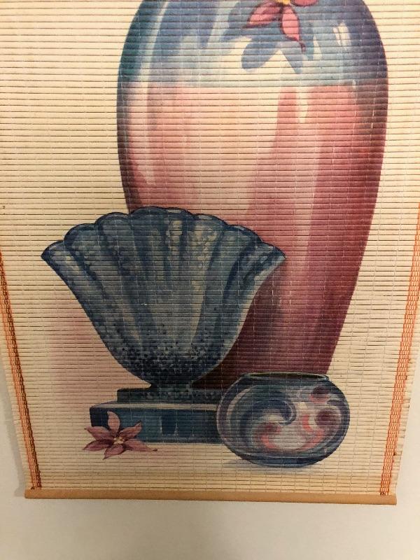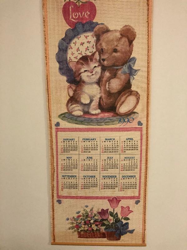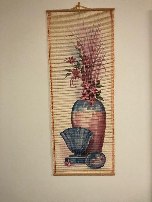 Retro wall hanging with potted plant and shells measures 32 12 1/2 Rolls up Has 1990 calendar on the back with teddy bear and kitten. Great condition. This is an ONSITE Auction all items will need to be picked up on location. Please see auction description for pick up procedures.