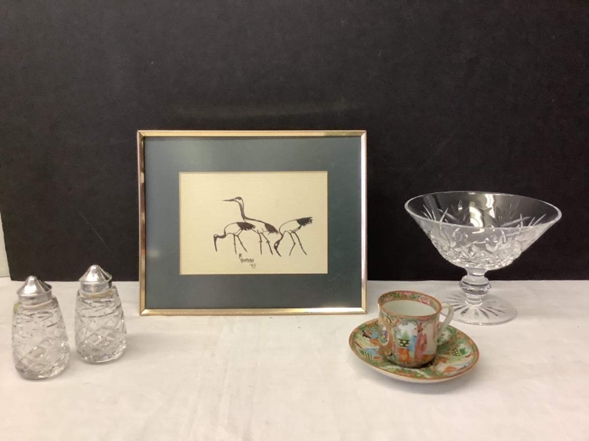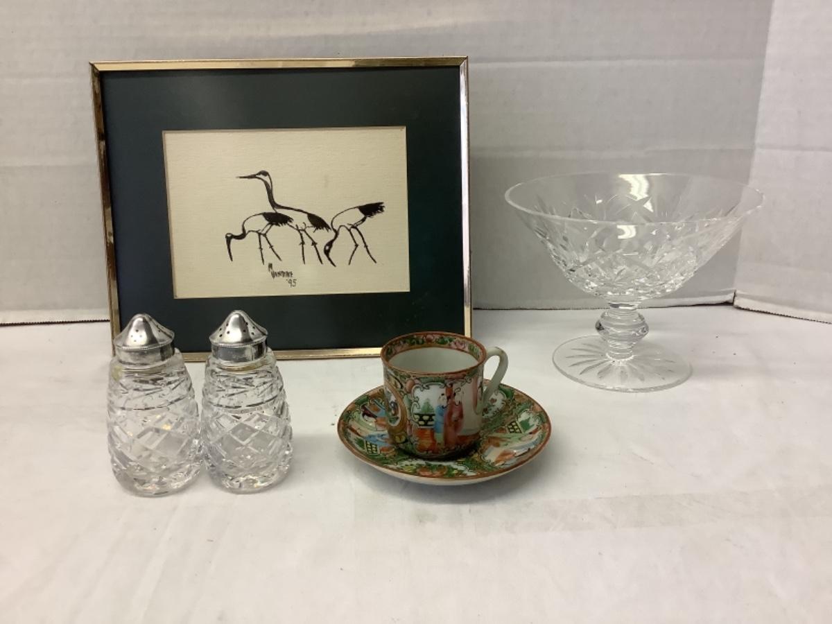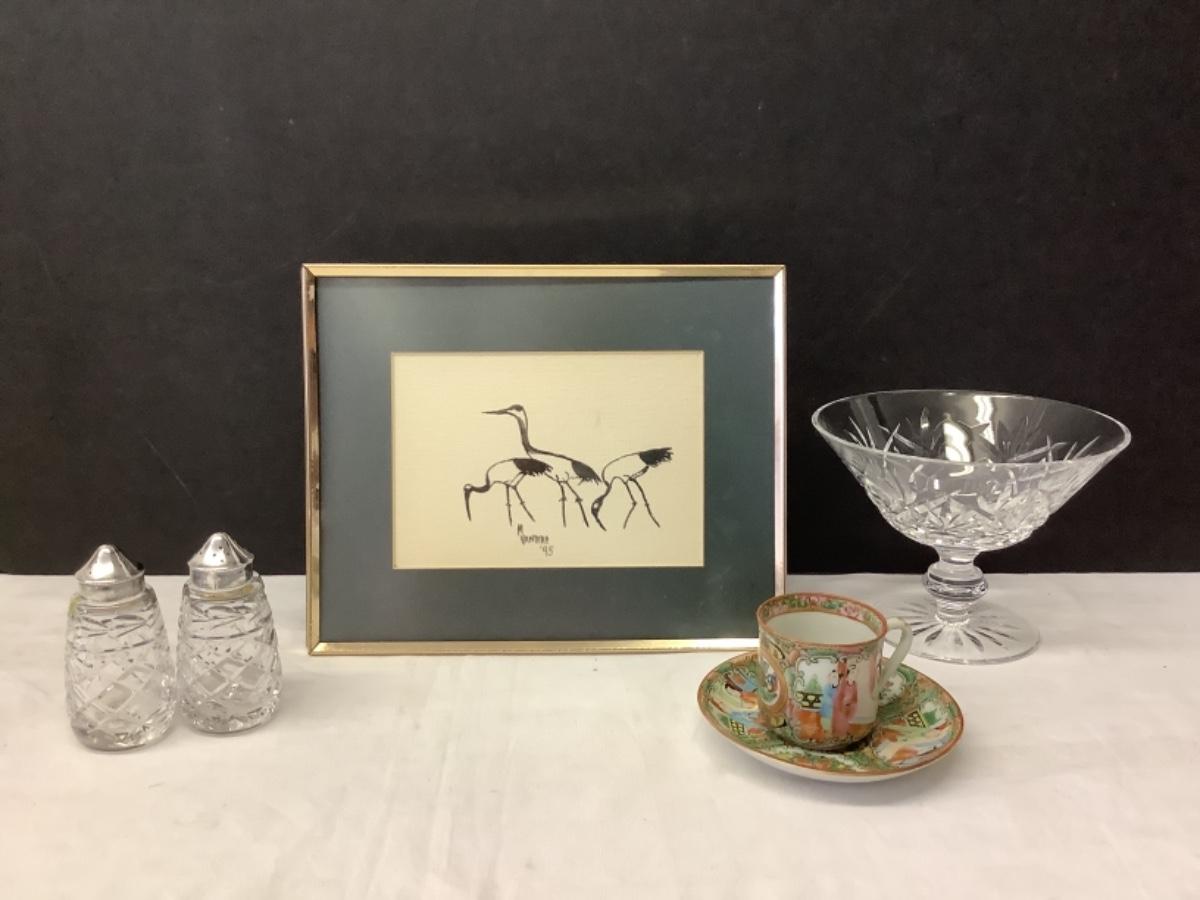 283  Rose Medallion  Demitasse , Waterford Salt/Pepper, Waterford Compote & Signed Sketch by M. Vandike