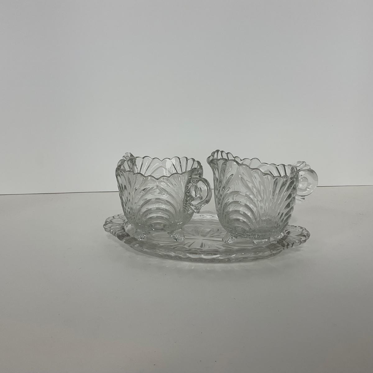Three pieces of Caprice Cambridge Glass Co. (1940’s-1950’s) including creamer, sugar, and tray. Please see photos for details and condition. ::: Shipping is available on this lot. If you require shipping you must let us know at the close of the auction. We will coordinate with you after the item has been won. Shipping fees will include insurance up to or exceeding the value of all items being mailed. If you have any questions regarding this lot please contact the auctioneer either via this website, by direct email or by phone. PICK UP TIMES and other important information can be found in the TERMS and DESCRIPTION of the auction. Please take a look for pertinent information. Thanks!