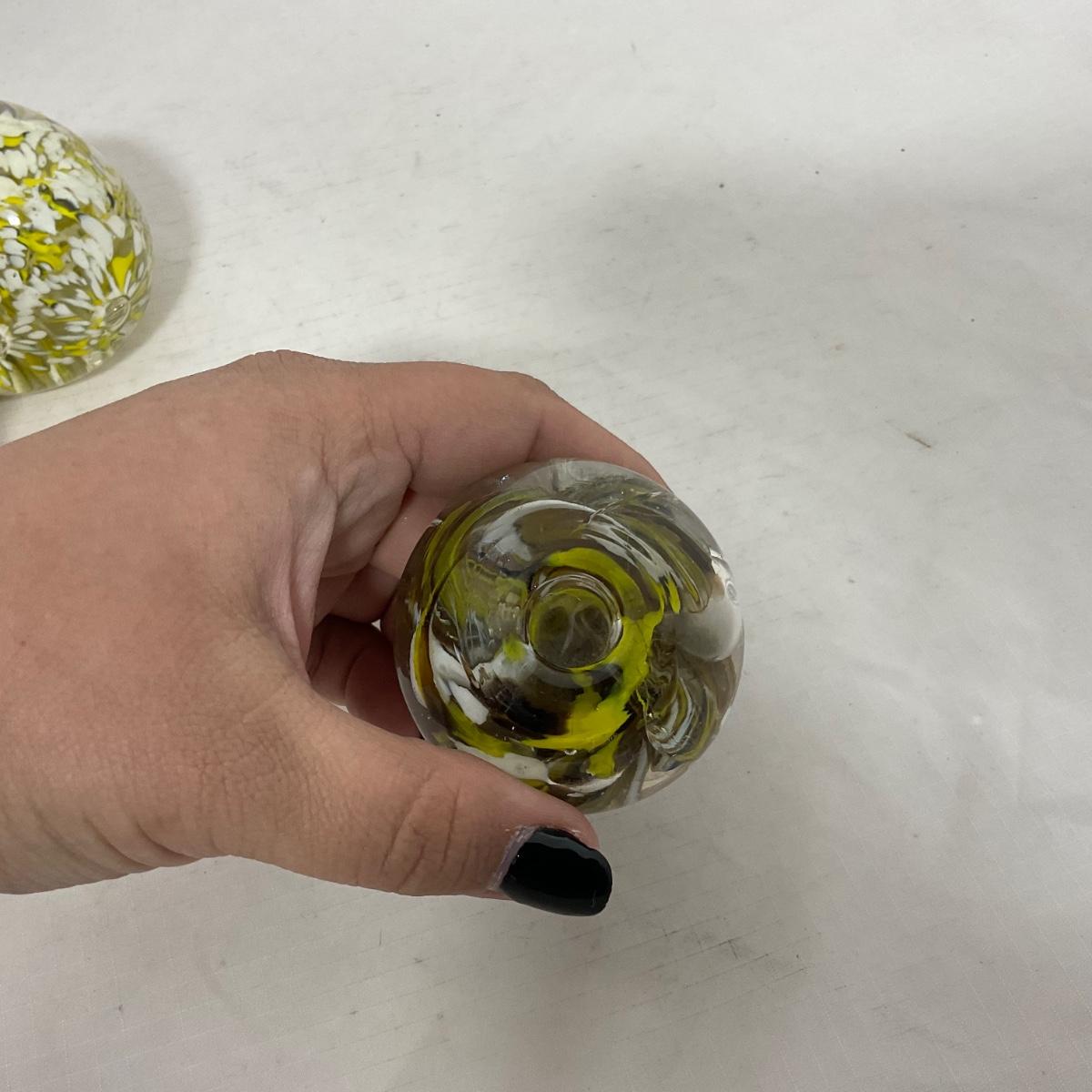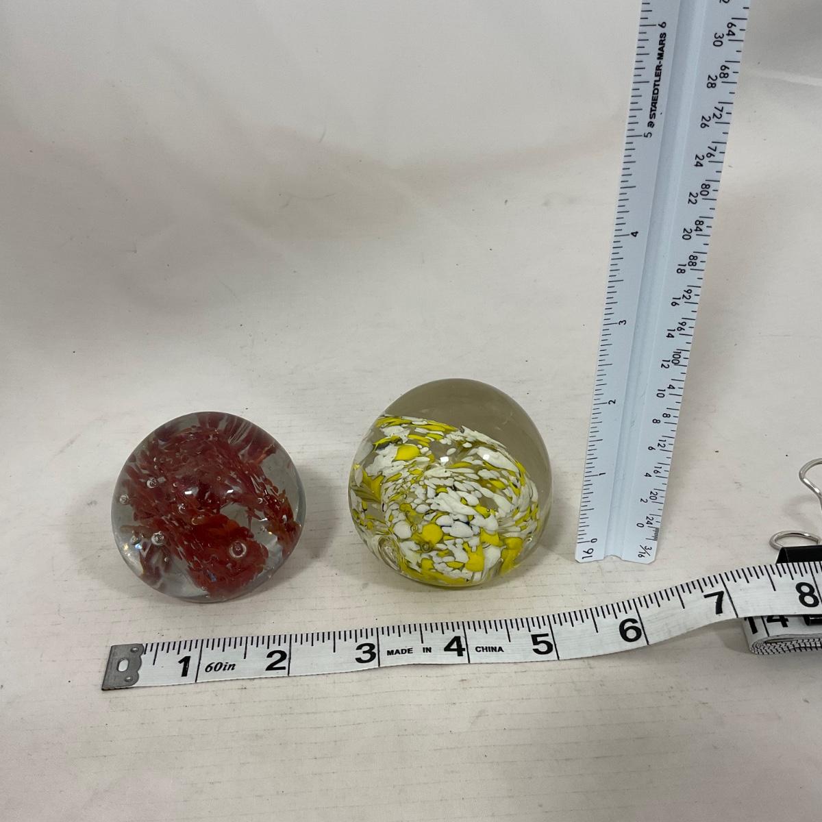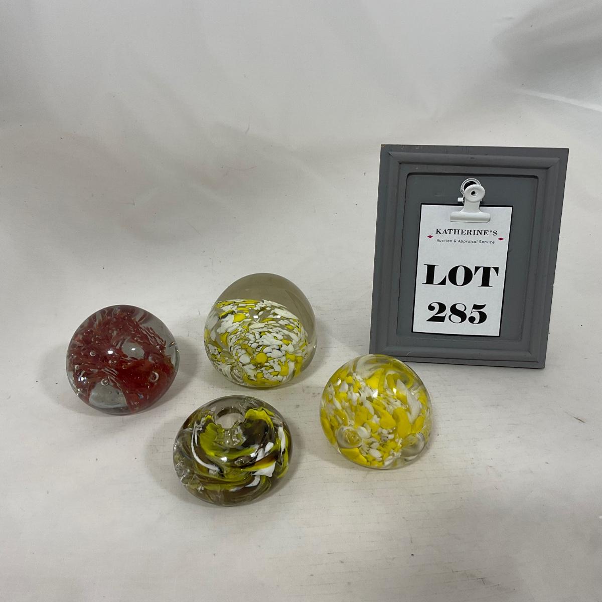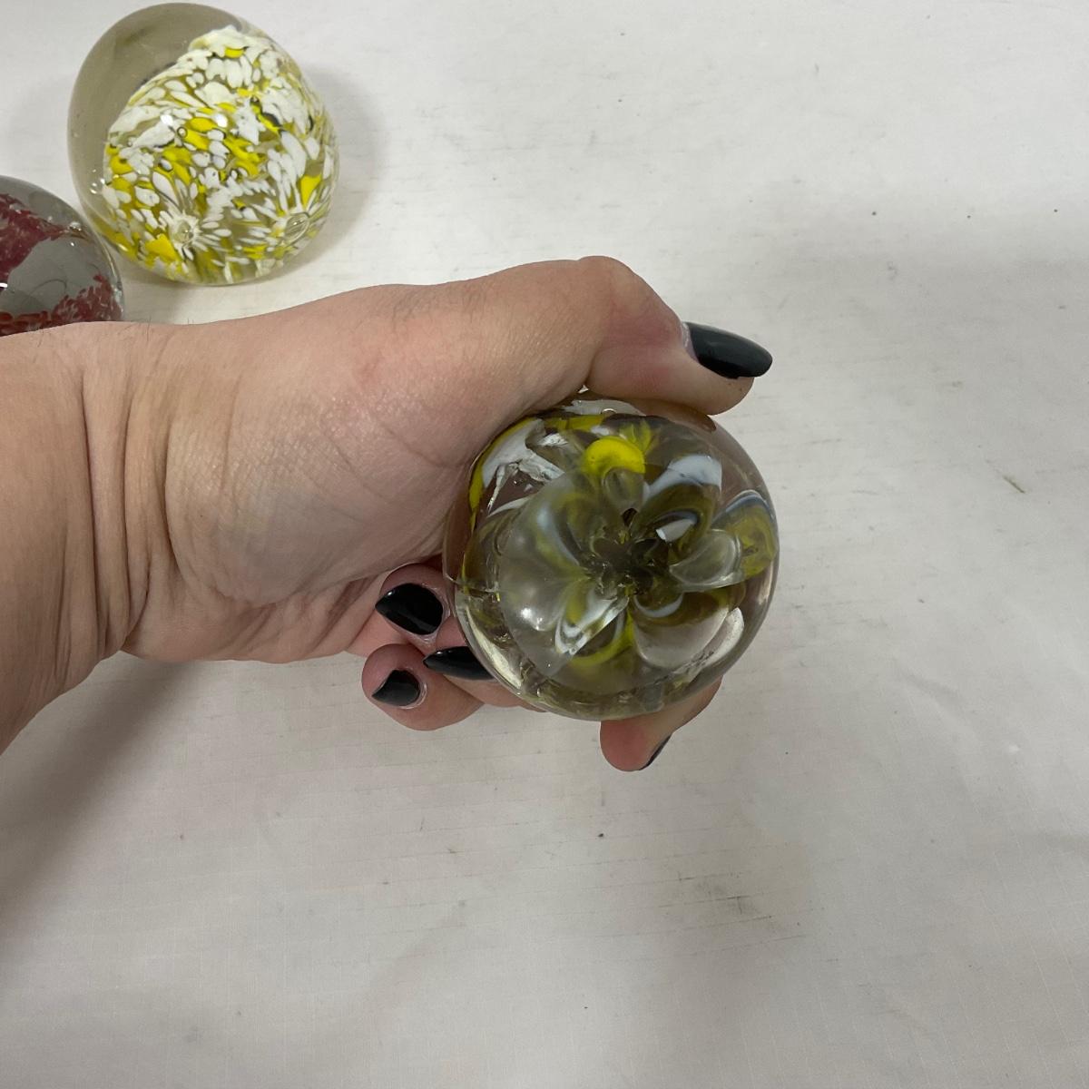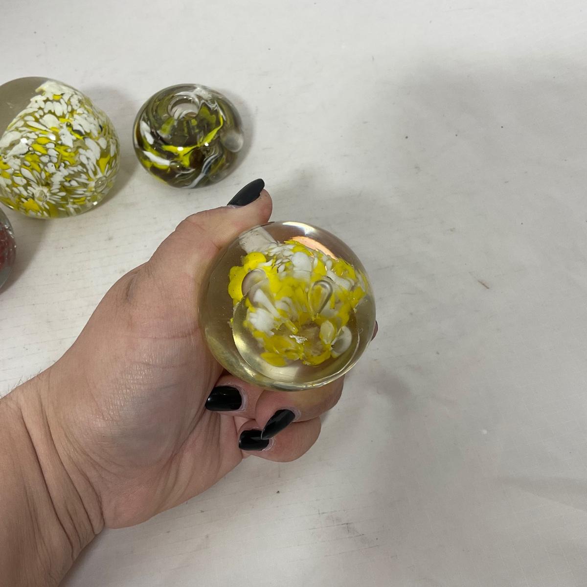 Four vintage glass paper weights. There is some damage (Pictured). Please see photos for details and condition. ::: Shipping is available on this lot. If you require shipping you must let us know at the close of the auction. We will coordinate with you after the item has been won. Shipping fees will include insurance up to or exceeding the value of all items being mailed. If you have any questions regarding this lot please contact the auctioneer either via this website, by direct email or by phone. PICK UP TIMES and other important information can be found in the TERMS and DESCRIPTION of the auction. Please take a look for pertinent information. Thanks!