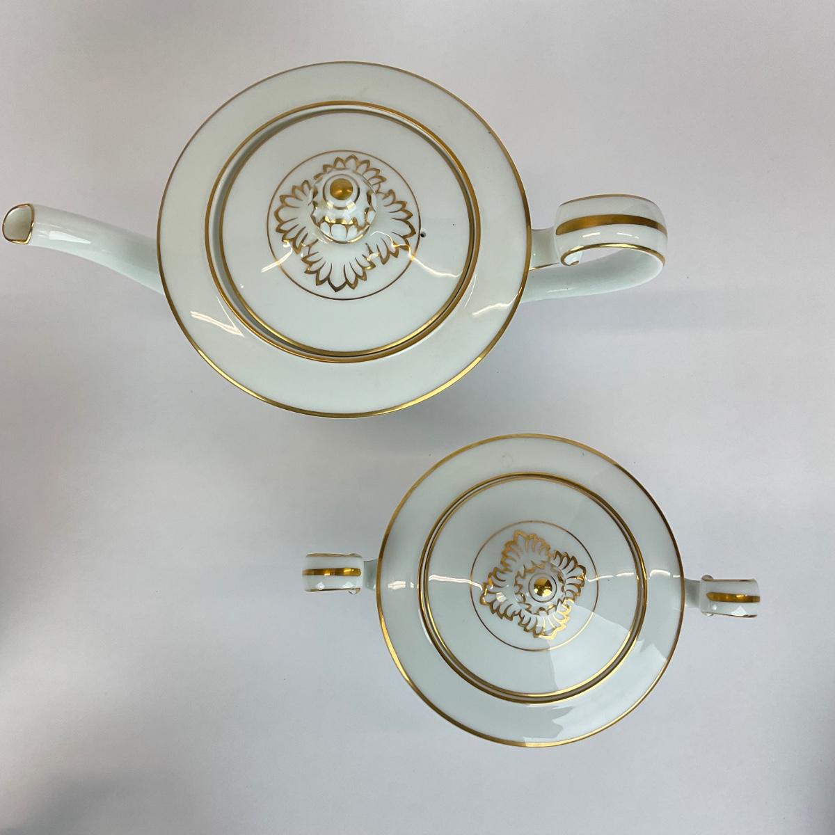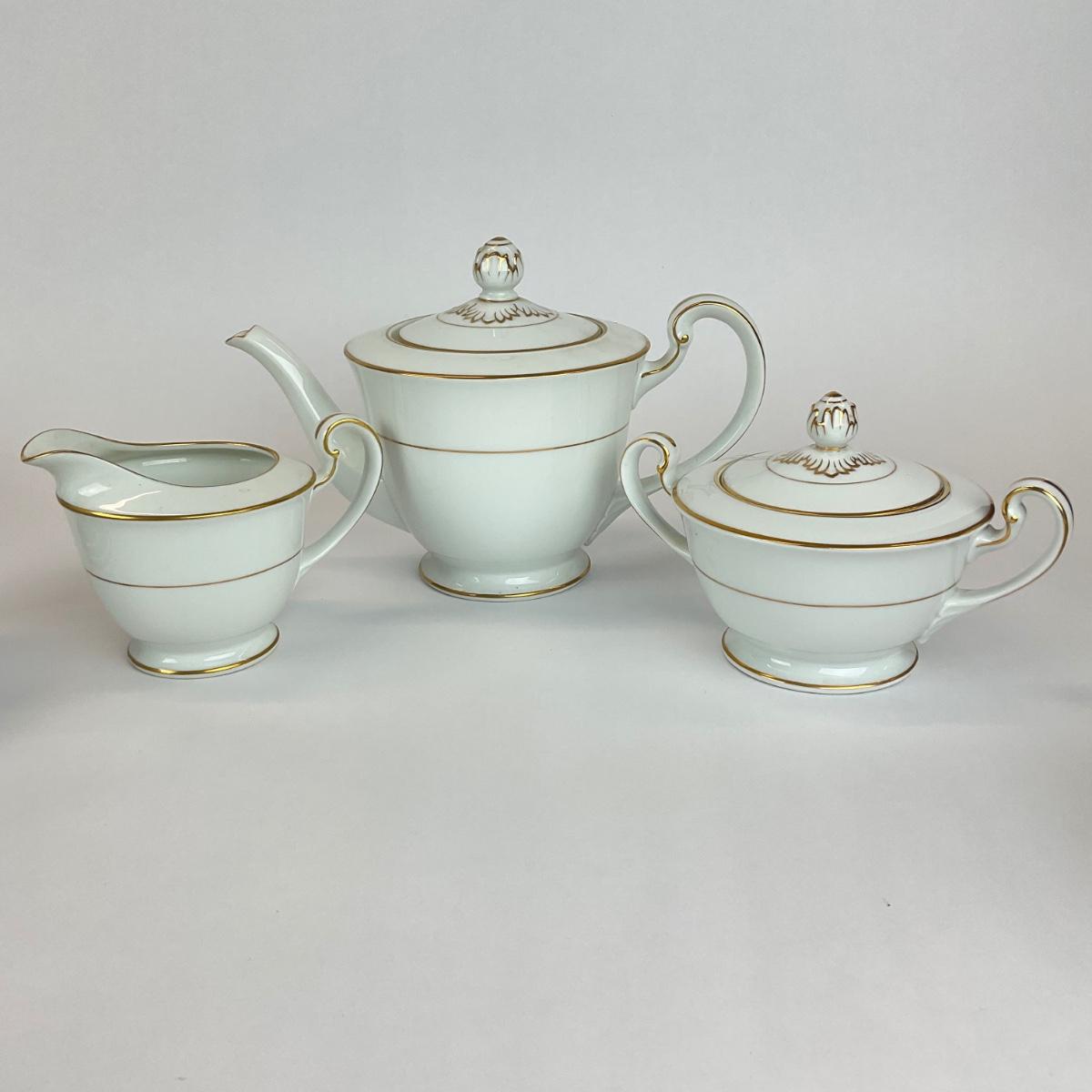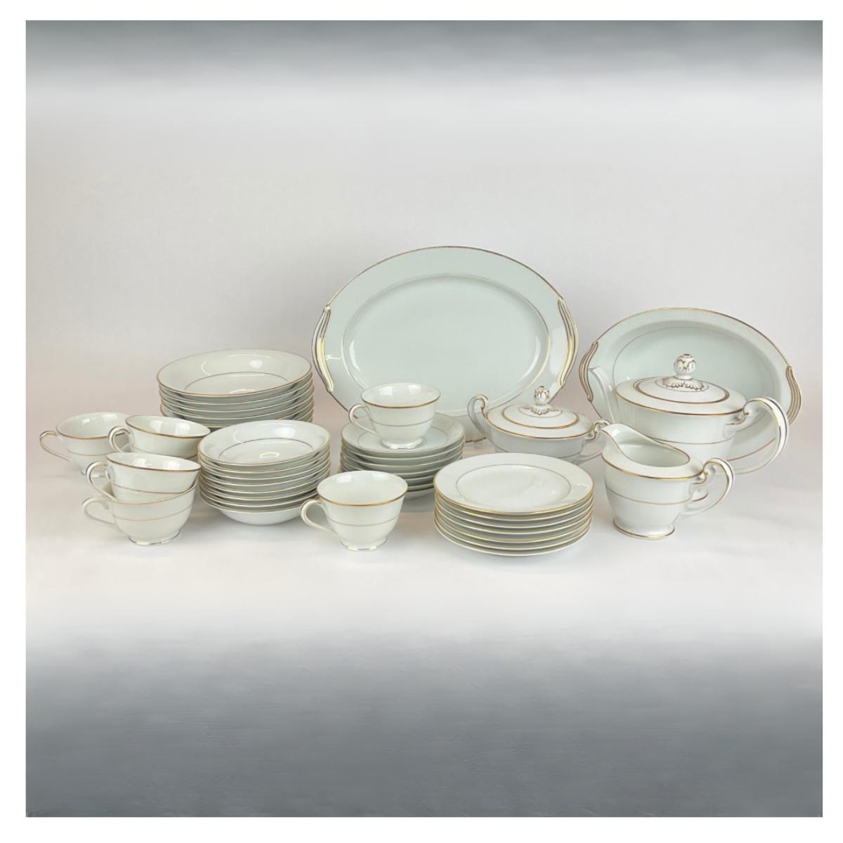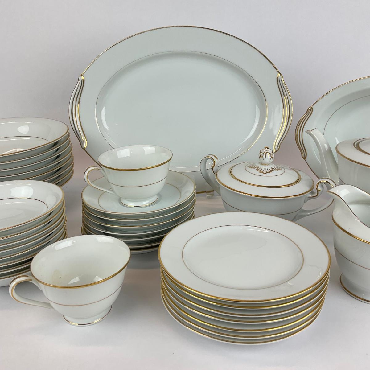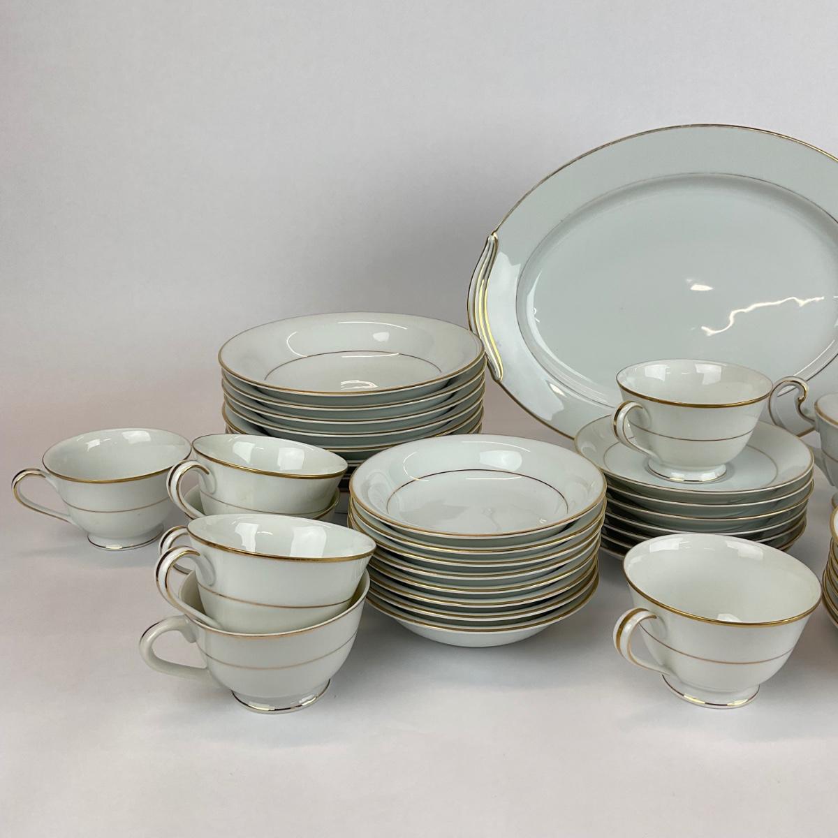 This lot includes a tea pot, a creamer, sugar, 7 teacups, 7 saucers, 7 bread and butter dishes, 16 bowls 8 large bowls and 8 small bowls, one platter dish and one oval bowl.