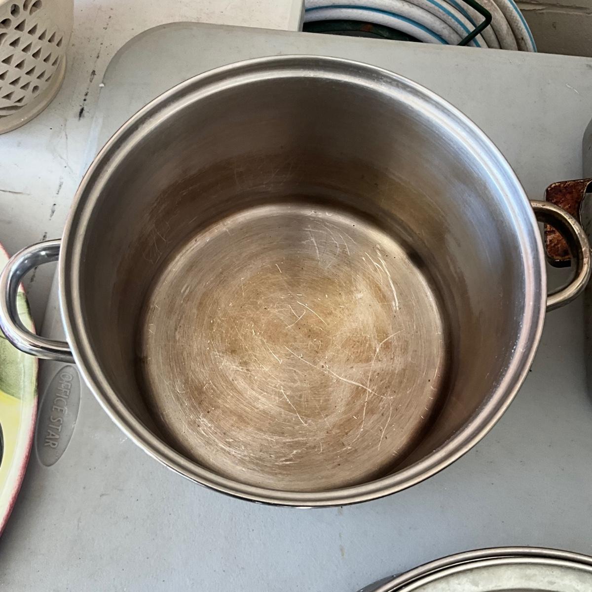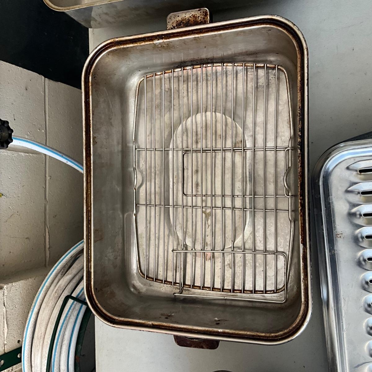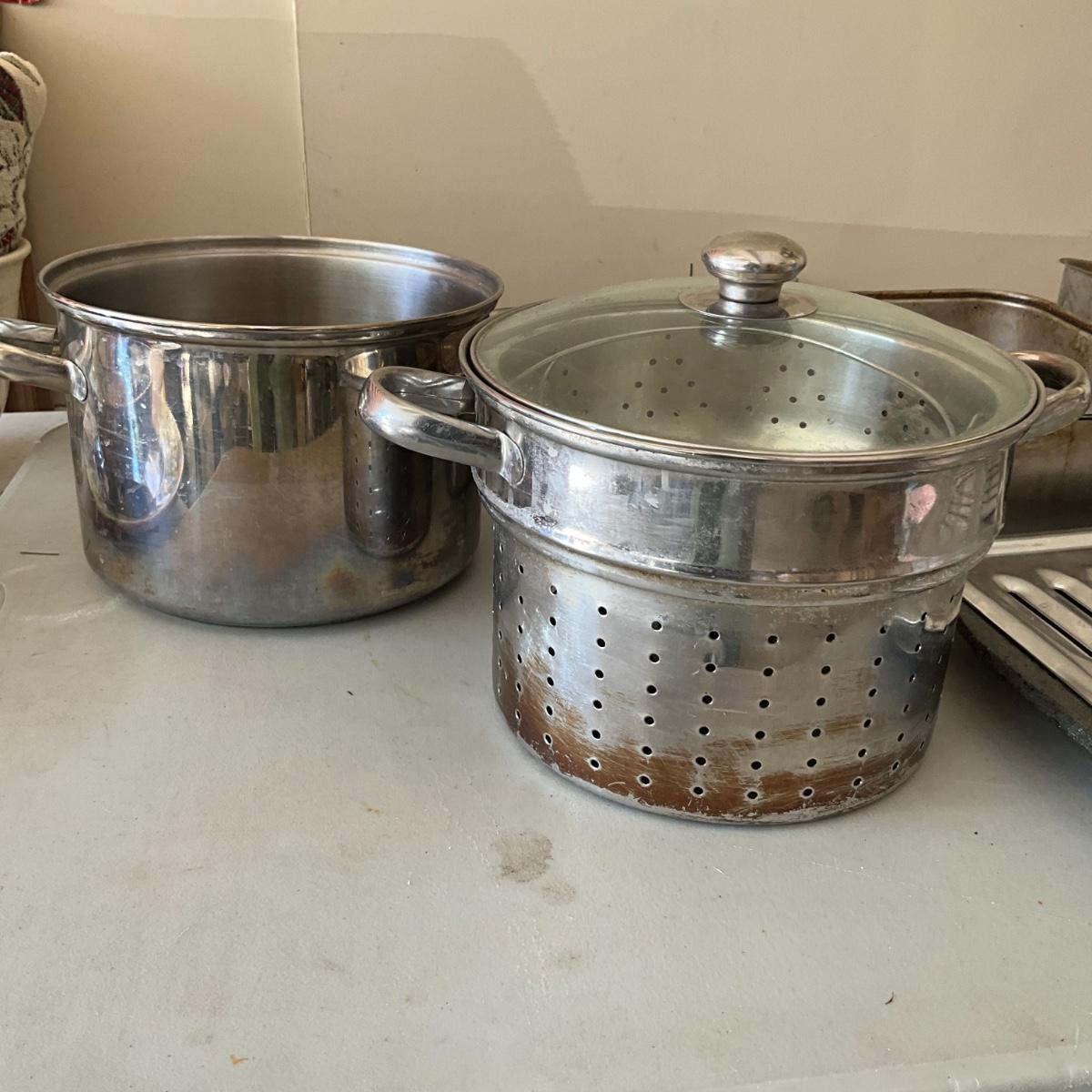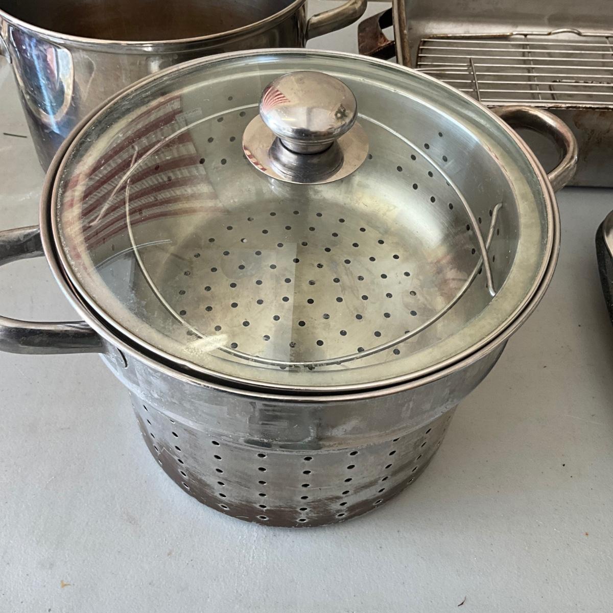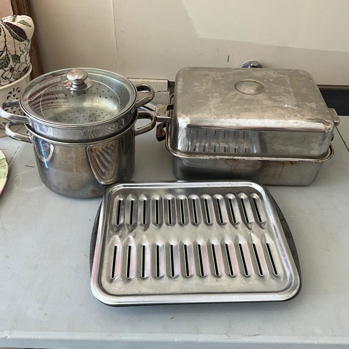 There is steamer pot with insert, roasting pan and grill pan.