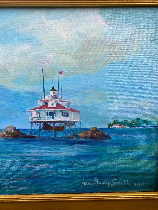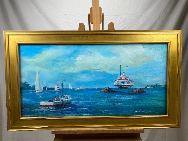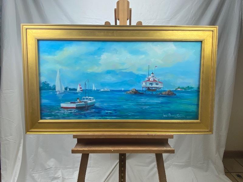 Beautiful Original Oil Painting of a “ Workboat and the Lighthouse “ by Jean Ranney Smith 2011, measures 42” W x 24” T