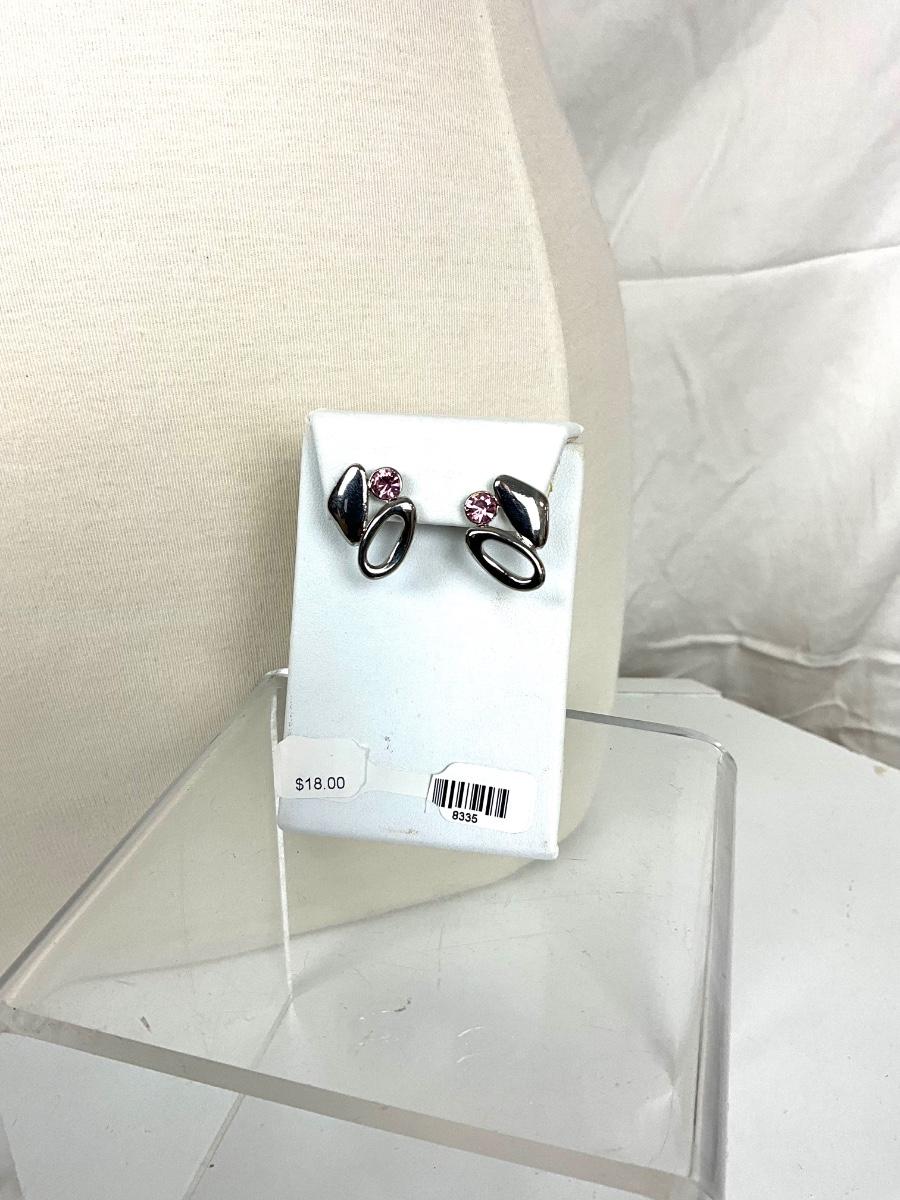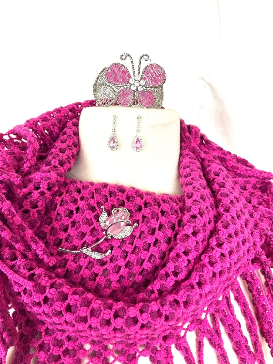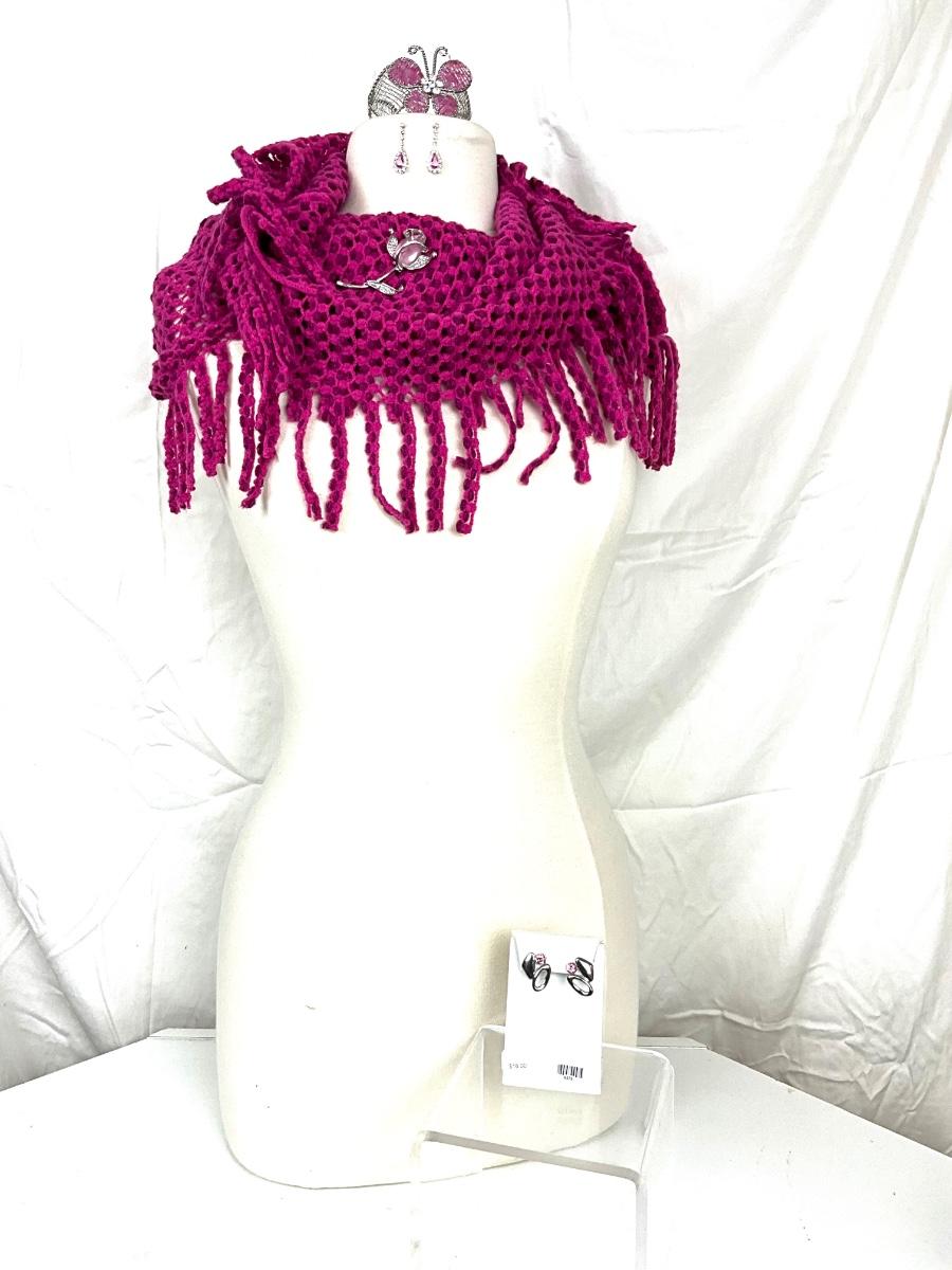 286 Pink Tubular Knit Infinity Scarf with Rhinestone Brooch, Two Pairs of Earrings, Butterfly Cuff Bracelet