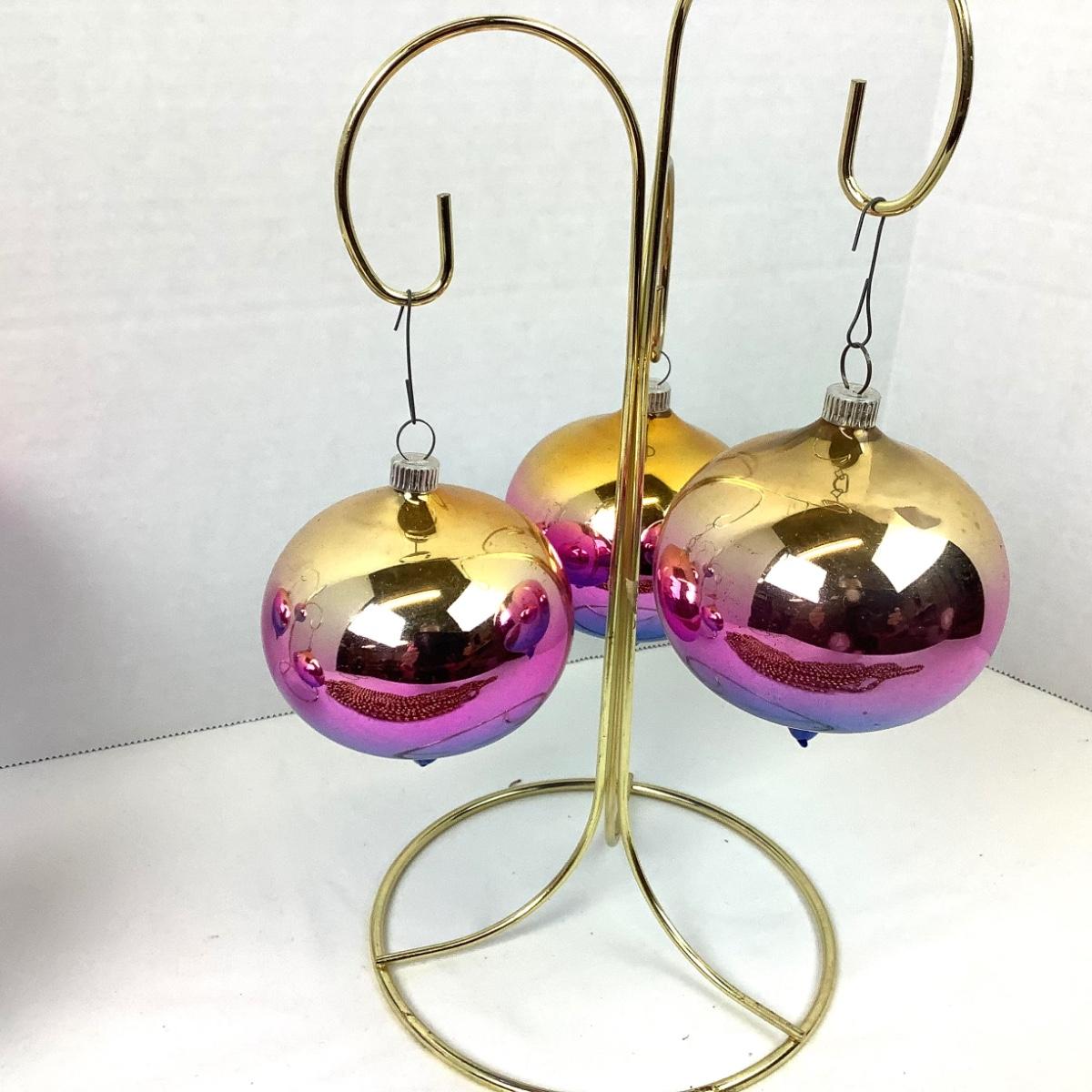 There is 23 feet of golden glass ball garland, there are a few that are broken. There are 6 ombre ball ornaments that are about 3" in diameter.