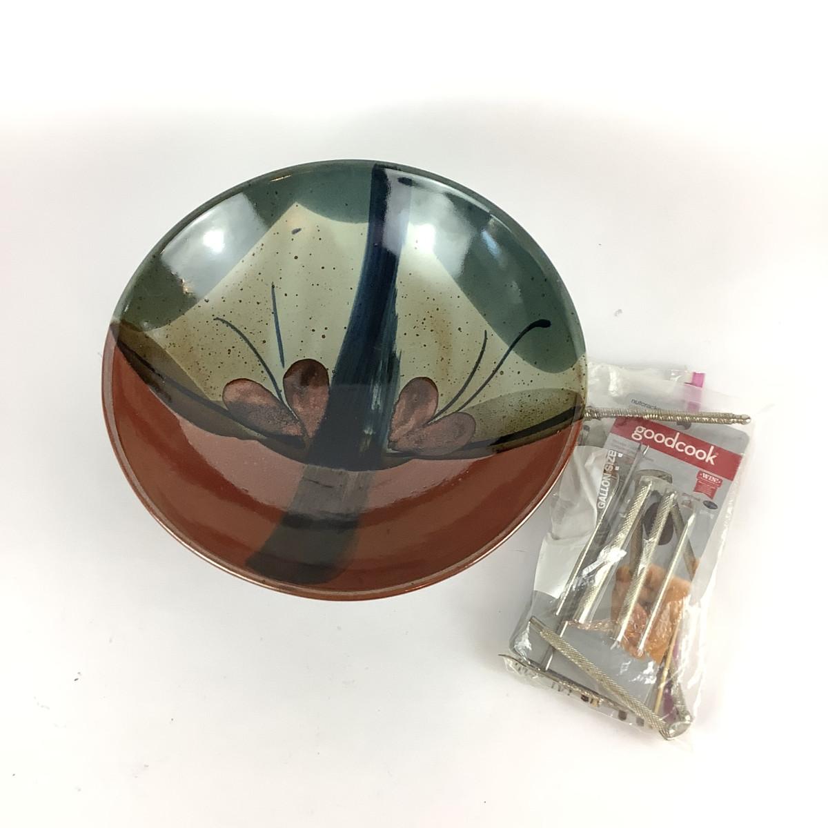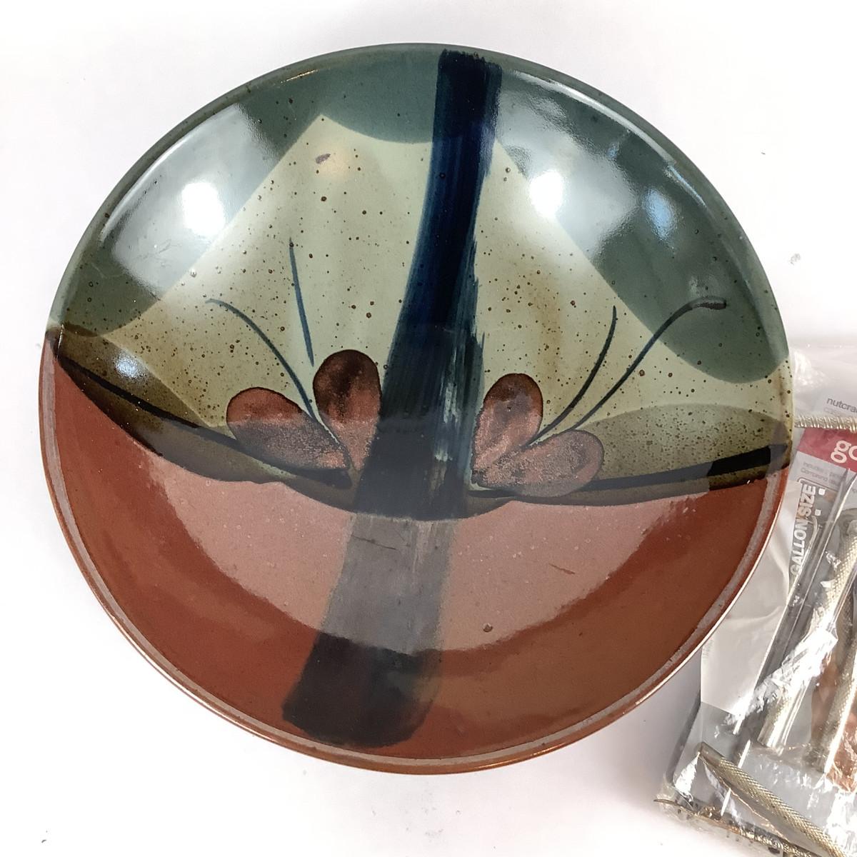 Center piece bowl is brown, maroon, grey and black in color, measures: 13" diameter x 4" high