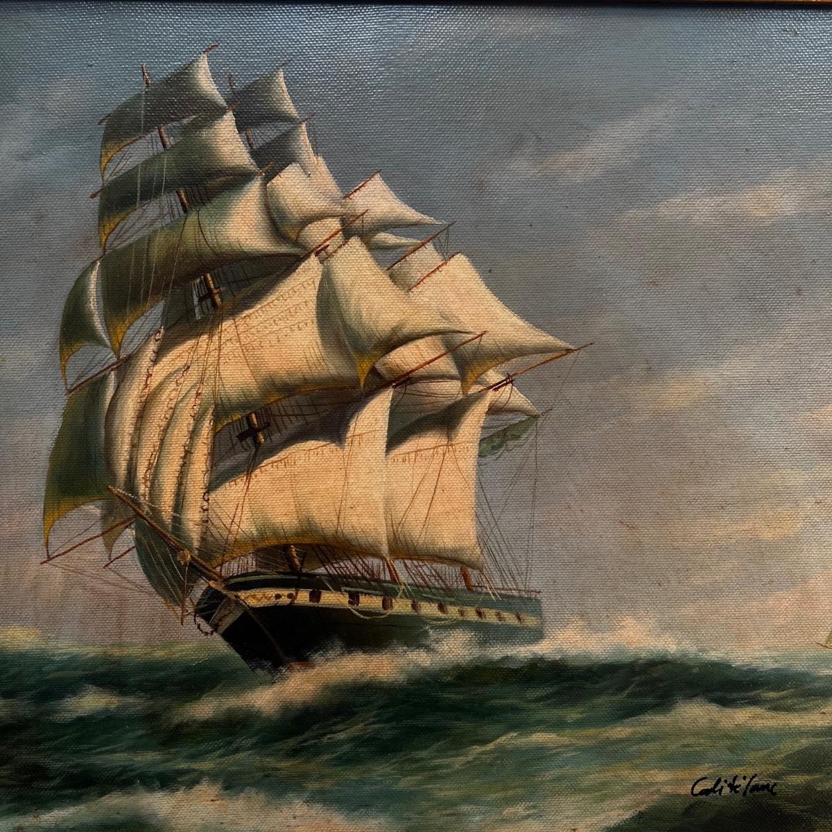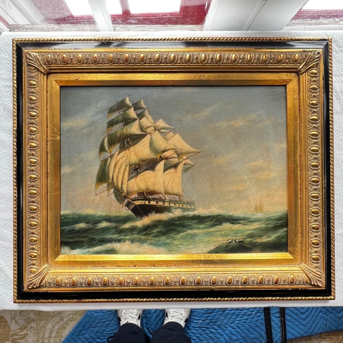 N287 Early 20th Century Antique Oil Painting of Ship & Seascape