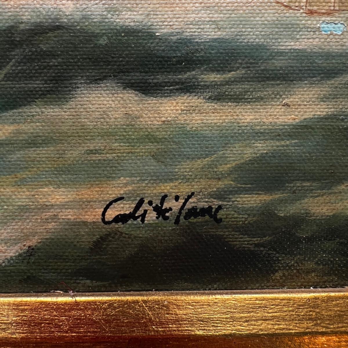 Oil painting is framed in a beautiful black and gold gilded frame.