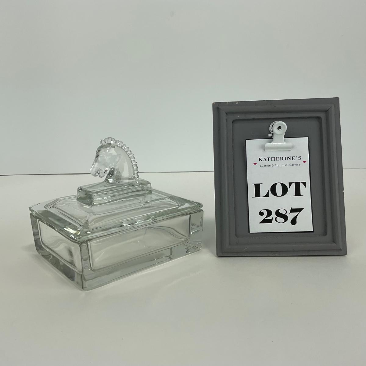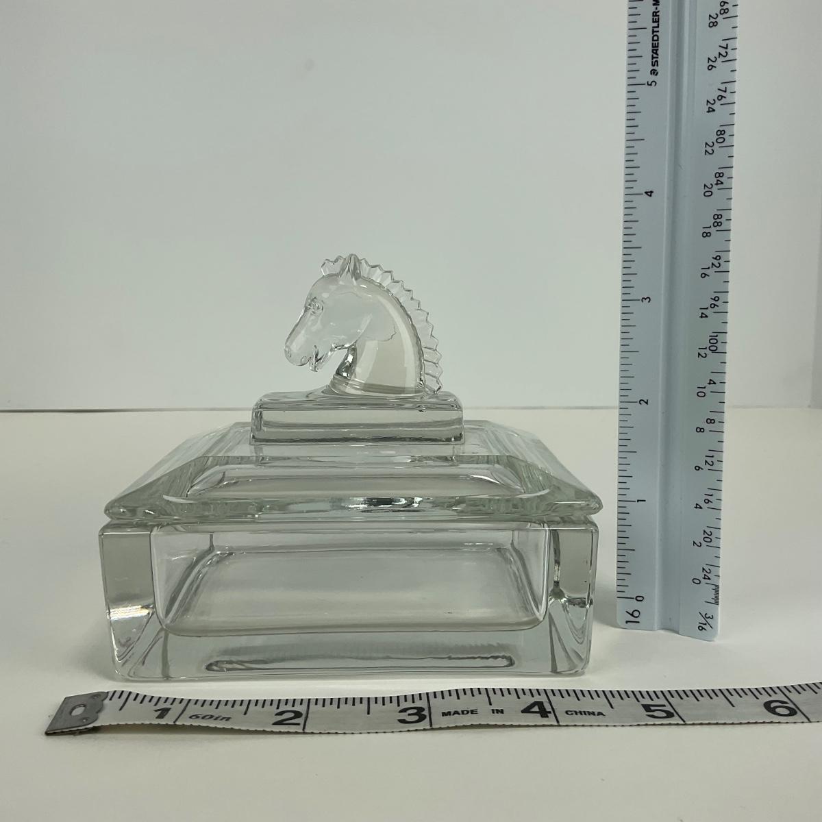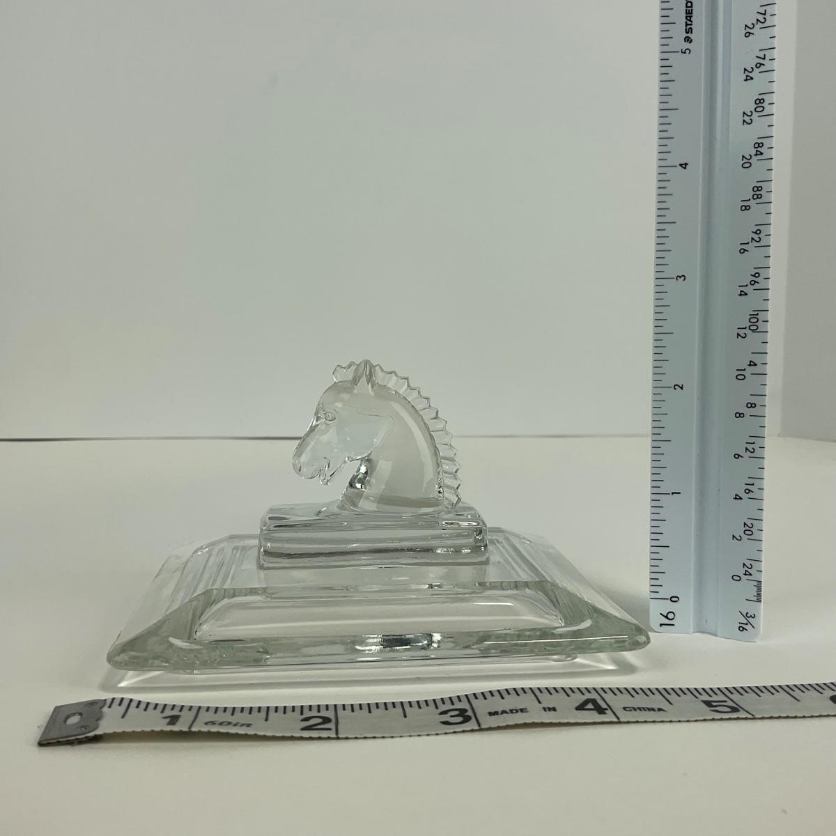 One clear glass Heisey horsehead figural cigarette box. This piece does have some scuffs, scratches, marks, or slight damage, but otherwise appears to be in great shape. Please see photos for details and condition. Any condition statement is given as a courtesy to a client, is an opinion, and should not be treated as a statement of fact. Reference to condition written, oral or within a condition report shall not be regarded as a full account of condition and may not include all defects, alterations, or restorations. Absence of a condition report does not imply a lot is flawless or lacking imperfections or damage. Katherine’s Auction & Appraisal Service shall have no responsibility for any error or omission. Returns shall not be accepted on the basis of condition. ::: Shipping is available on this lot. If you require shipping you must let us know at the close of the auction. We will coordinate with you after the item has been won. Shipping fees will include insurance up to or exceeding the value of all items being mailed. If you have any questions regarding this lot please contact the auctioneer either via this website, by direct email or by phone. PICK UP TIMES and other important information can be found in the TERMS and DESCRIPTION of the auction. Please take a look for pertinent information. Thanks!