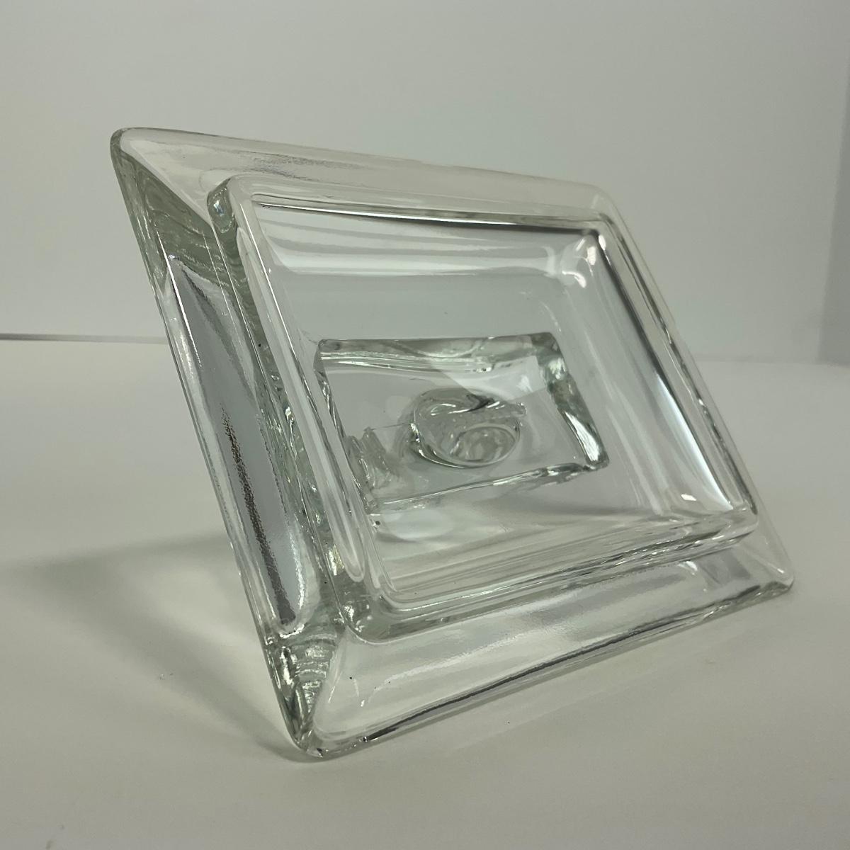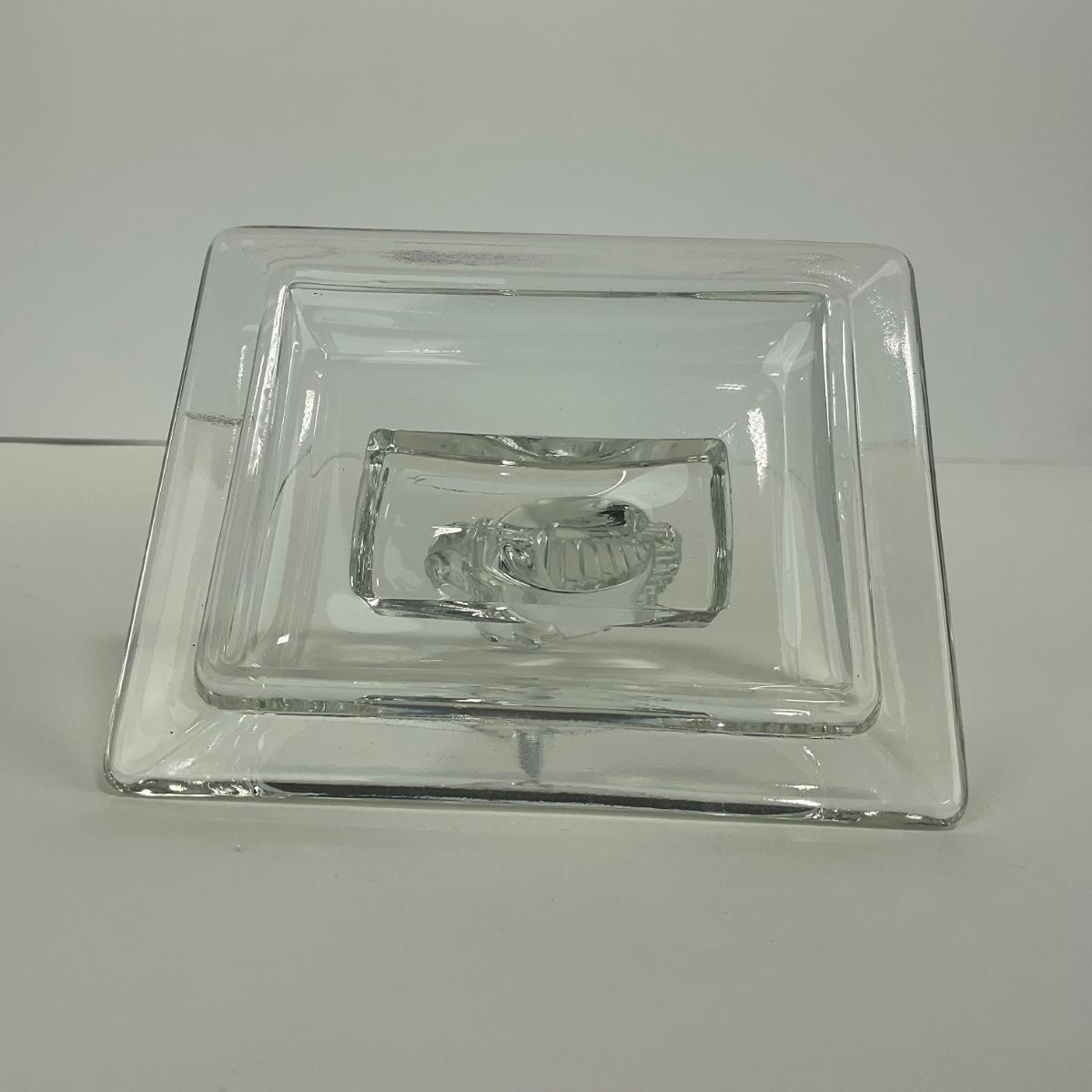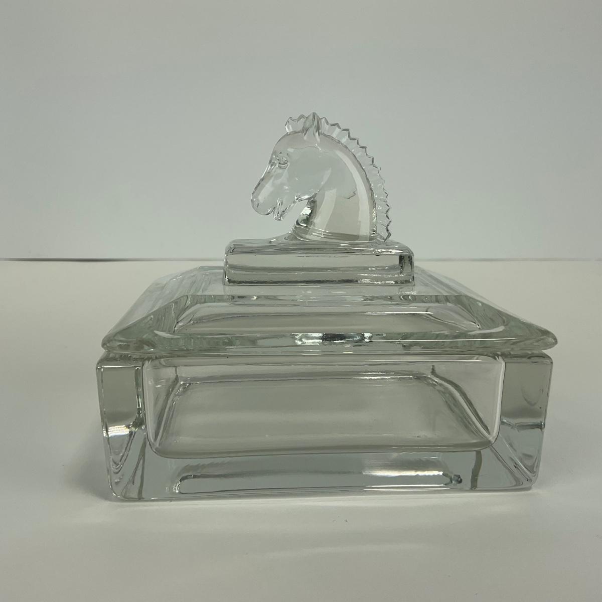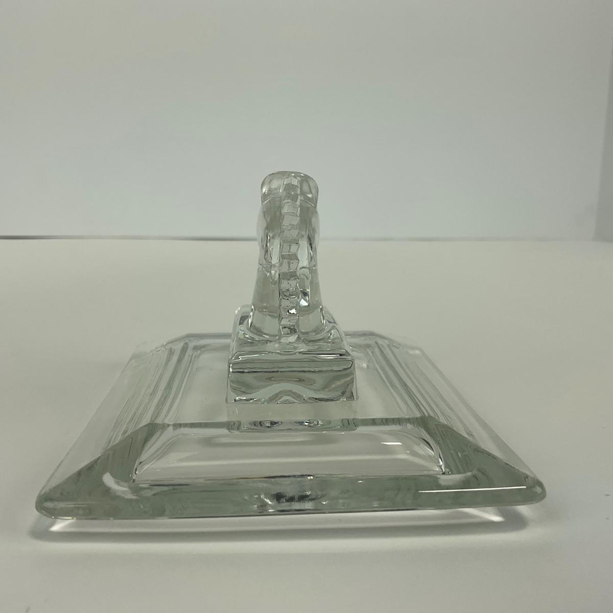 One clear glass Heisey horsehead figural cigarette box. This piece does have some scuffs, scratches, marks, or slight damage, but otherwise appears to be in great shape. Please see photos for details and condition. Any condition statement is given as a courtesy to a client, is an opinion, and should not be treated as a statement of fact. Reference to condition written, oral or within a condition report shall not be regarded as a full account of condition and may not include all defects, alterations, or restorations. Absence of a condition report does not imply a lot is flawless or lacking imperfections or damage. Katherine’s Auction & Appraisal Service shall have no responsibility for any error or omission. Returns shall not be accepted on the basis of condition. ::: Shipping is available on this lot. If you require shipping you must let us know at the close of the auction. We will coordinate with you after the item has been won. Shipping fees will include insurance up to or exceeding the value of all items being mailed. If you have any questions regarding this lot please contact the auctioneer either via this website, by direct email or by phone. PICK UP TIMES and other important information can be found in the TERMS and DESCRIPTION of the auction. Please take a look for pertinent information. Thanks!