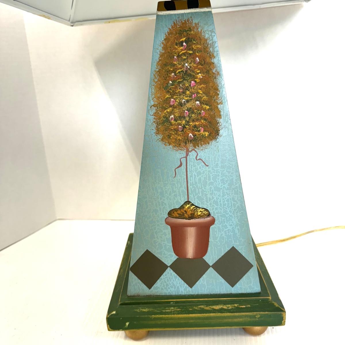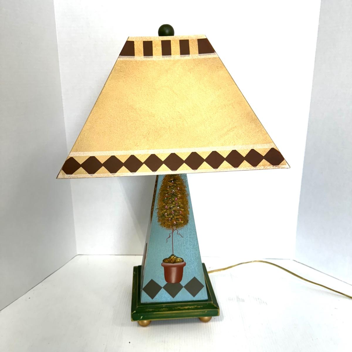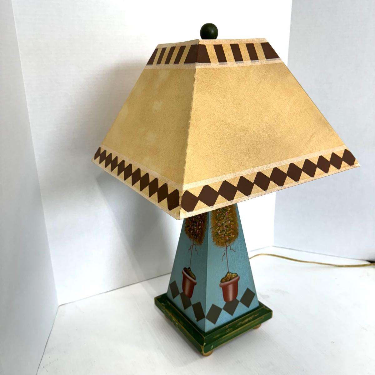 Measuring 22” high x base is 7” square x shade is 14” diameter for shade.
