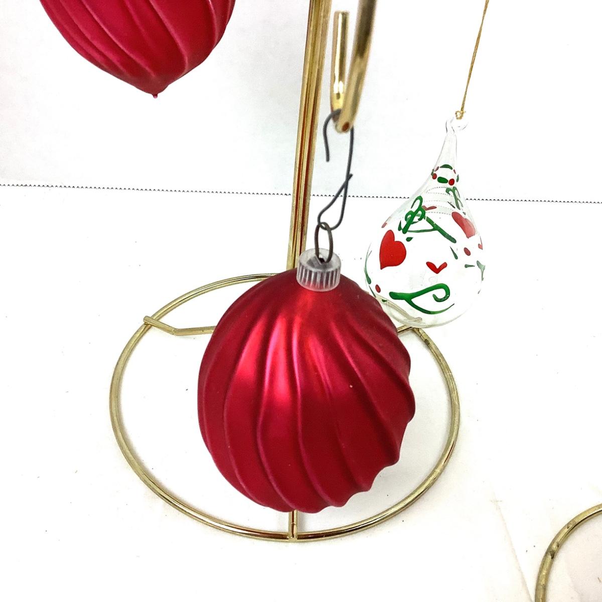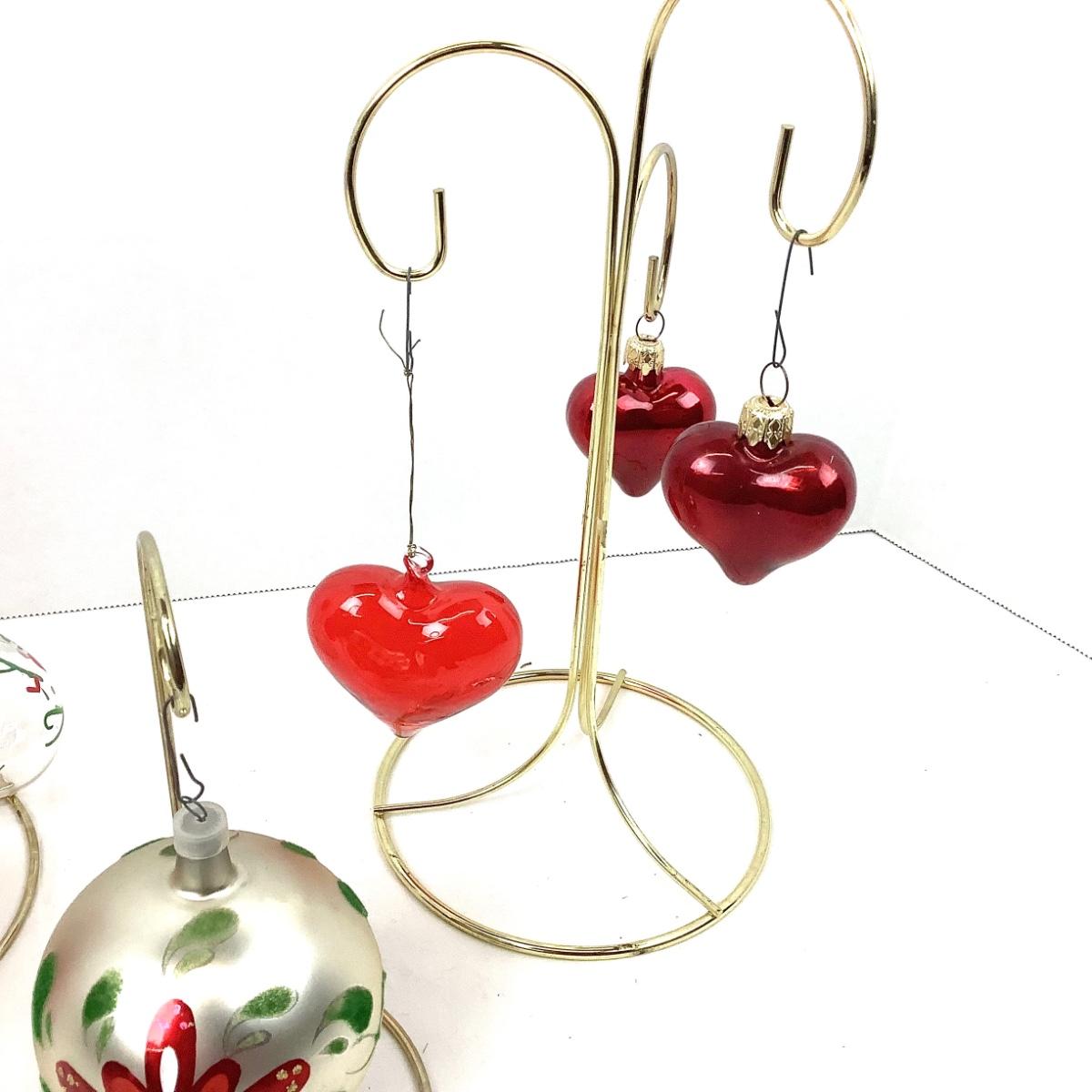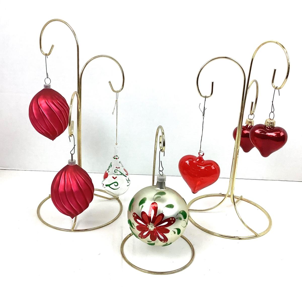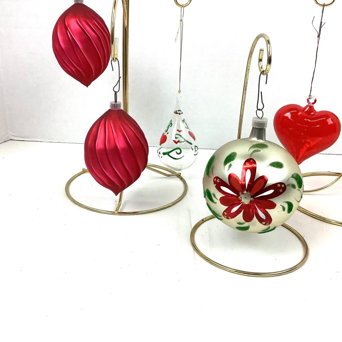 There are 7 ornaments in the lot, 3 hand blown hearts, 2 spiral ribbed red ornaments from Austria, and 2 hand painted bulbs.