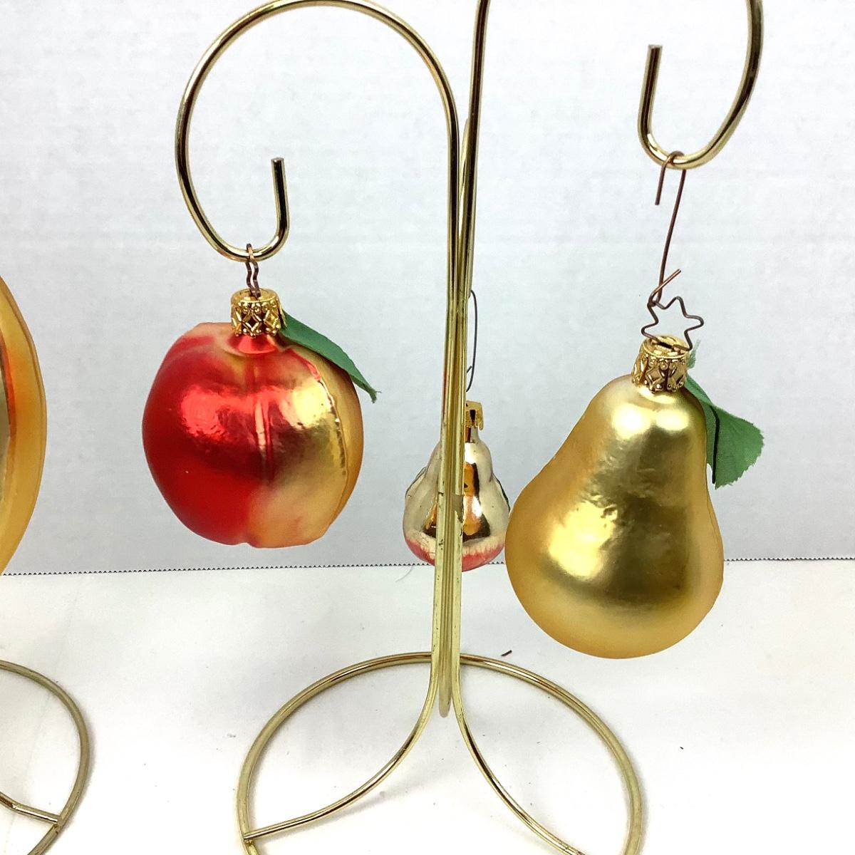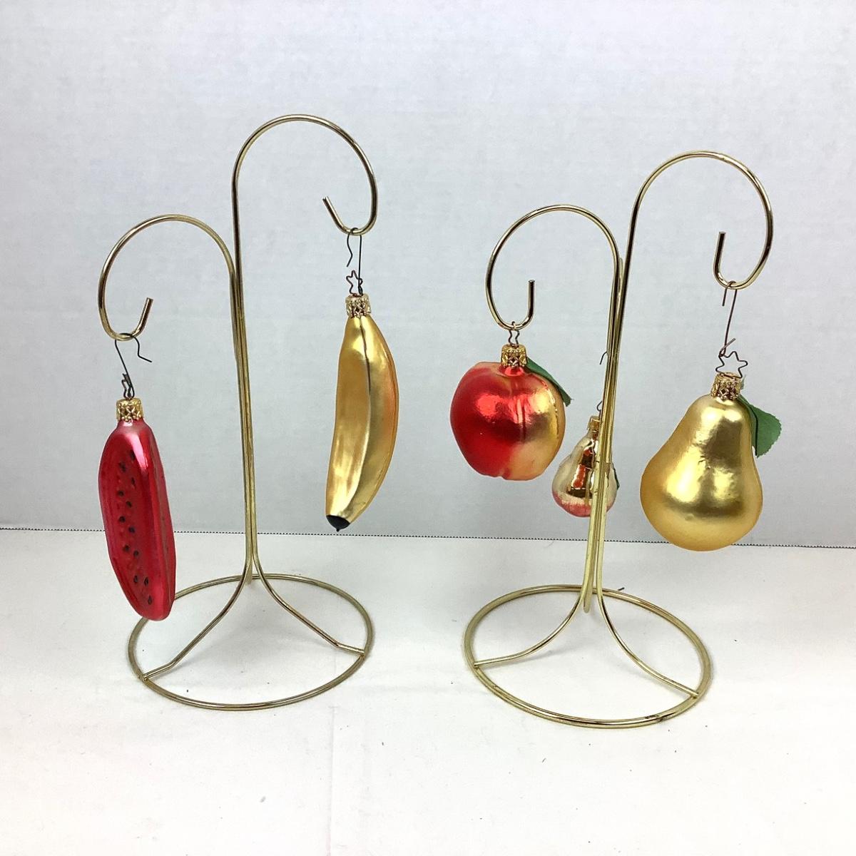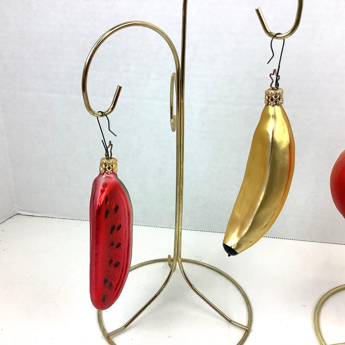 There are 5 fruit ornaments in this lot-watermelon, banana, peach and 2 pears. They range k in size from 2" to 5".