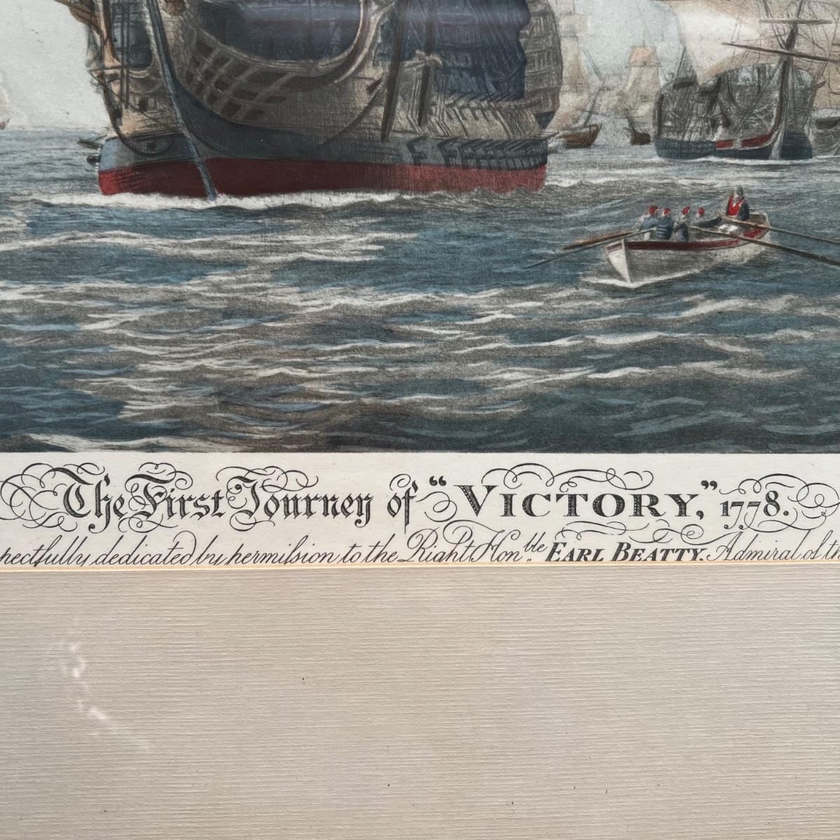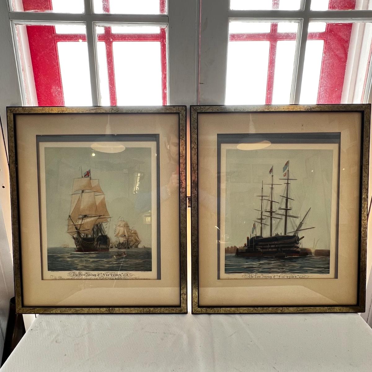 Pair of etchings “The First Journey of Victory 1778” and “The Last Journey of Victory 1922” (art is falling through matting) both published by Robert Dunthorne & Son in 1922.